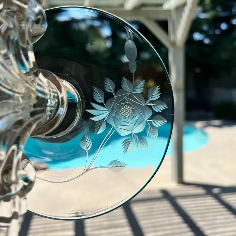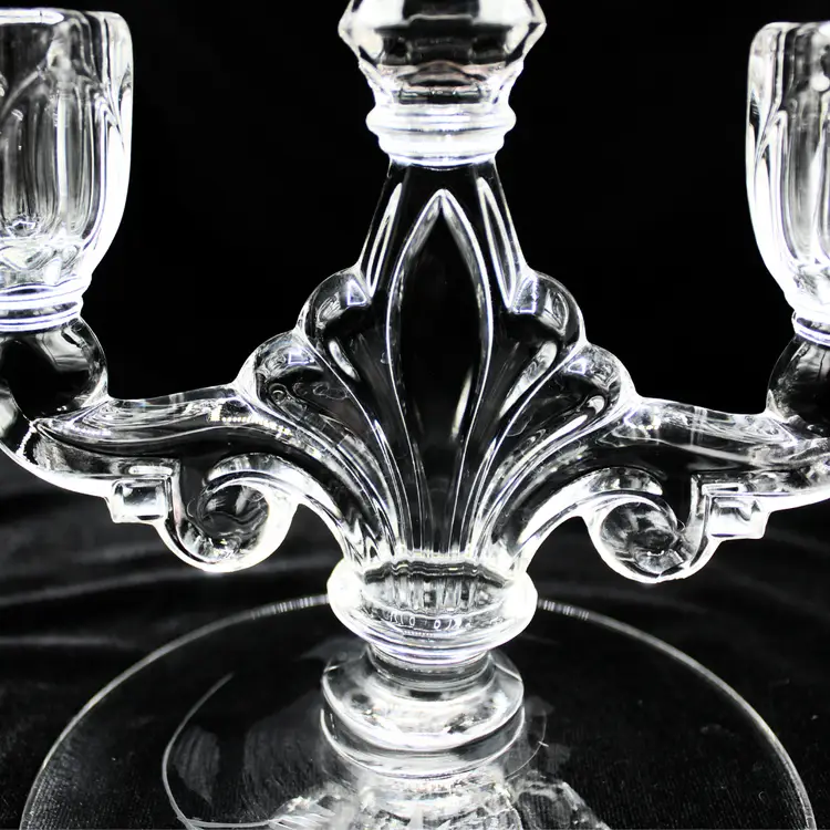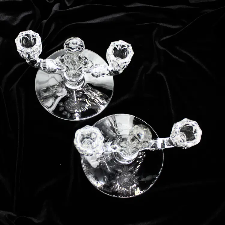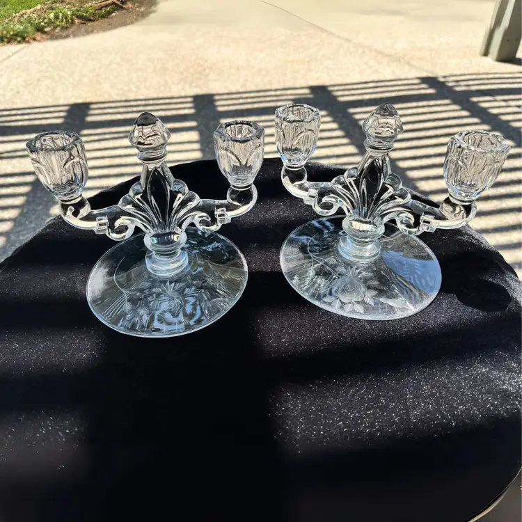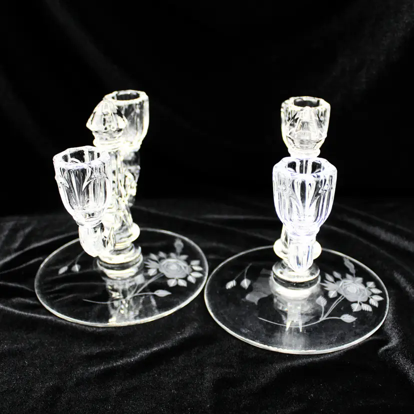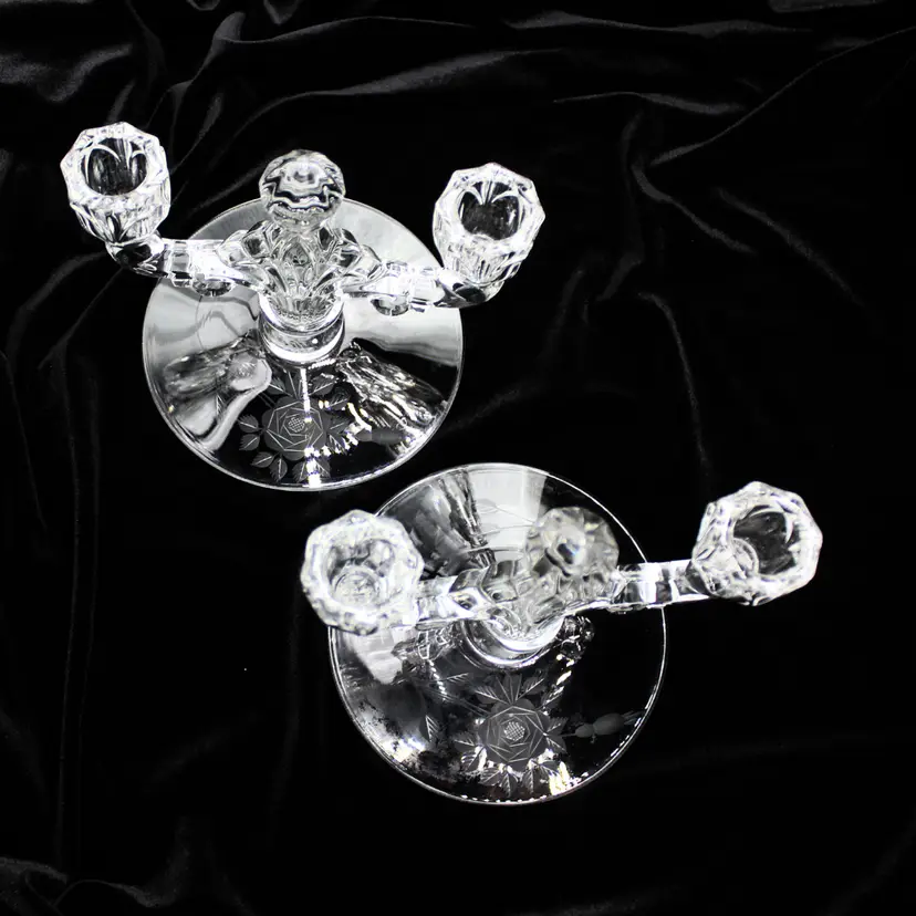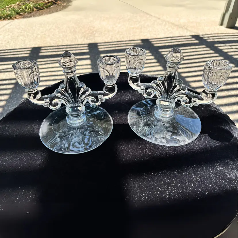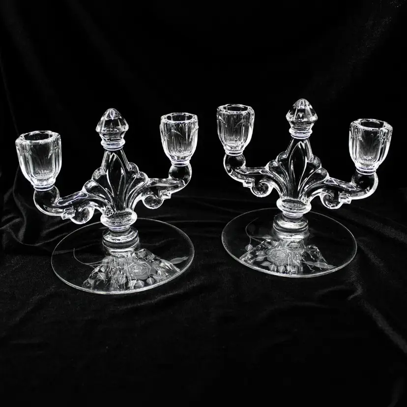 Vintage Heisey Crystal Clear Glass Two Light Double Tapered Candlestick Holder Trident Pattern Gray Cut Engraved Rhodora Rose Design