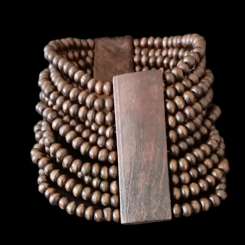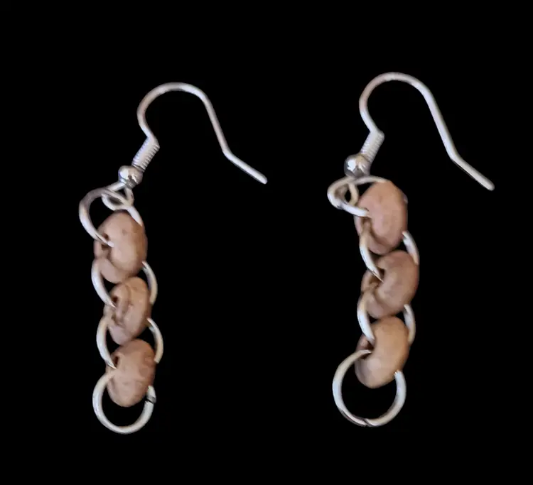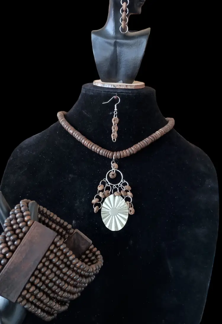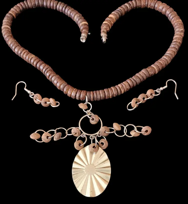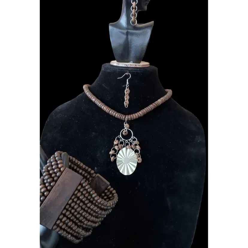 This rustic Heishi bead necklace set features a 3.5 inch striking pendant, matching dangle earrings, and a wide stretch bracelet. The necklace is 17 inches long, perfect for adding a natural, earthy touch to any outfit.