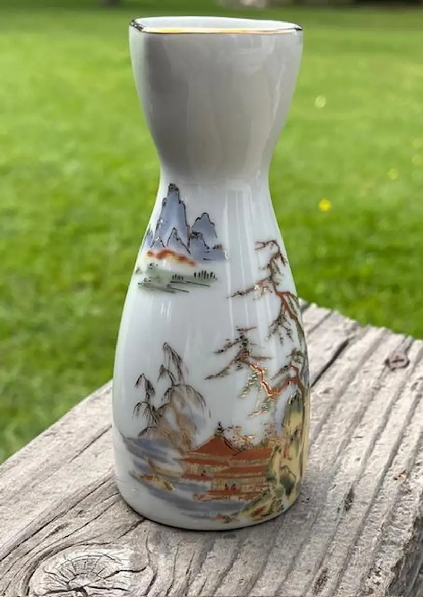 A Vintage Heisi Japan Saki Bottle. Marked Heisi Japan on the bottom. Approximately 5 1/4" Tall and 2 1/4" Wide at the base. For Saki, Display or use as a vase. Free of any nics and such.