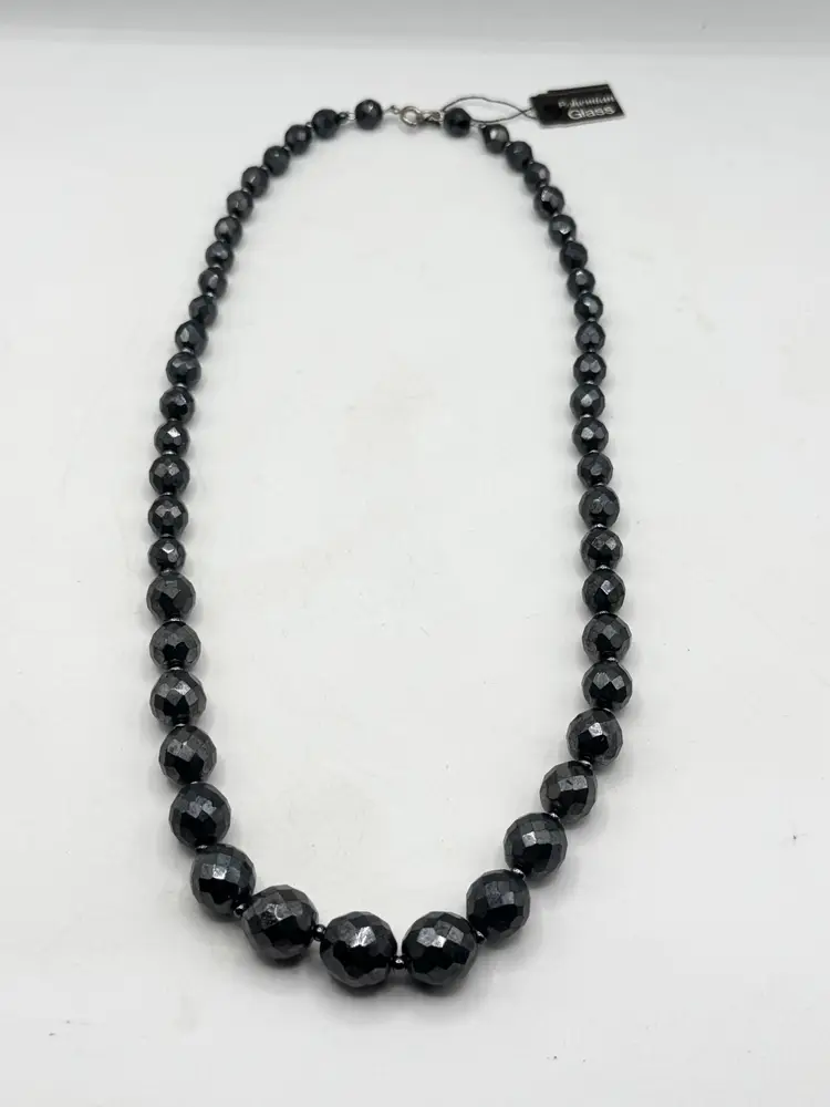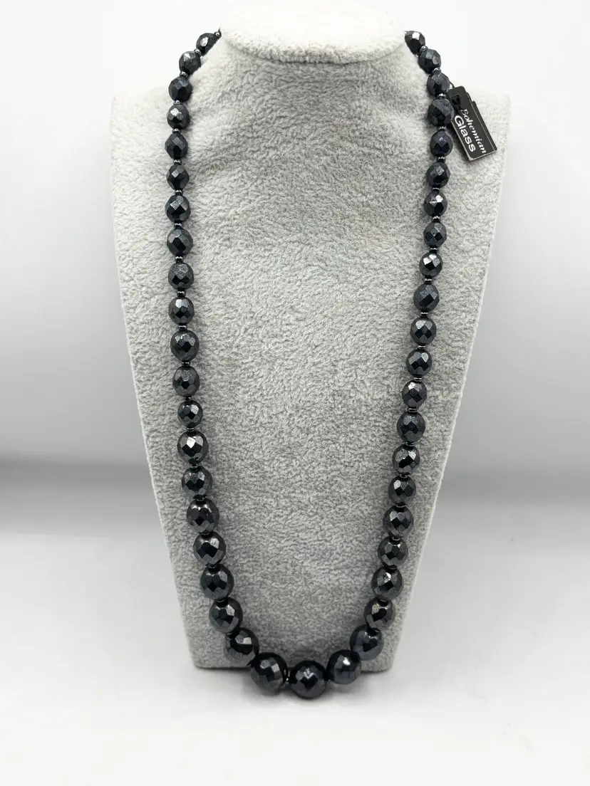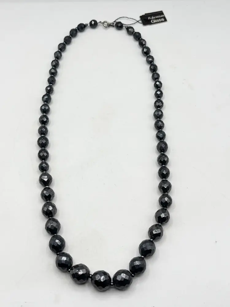 Vintage hematite bohemian glass beaded graduating bead necklace. Graduated sized beads. Has original tag that reads bohemian glass. Vintage beaded necklace. MN56HG.