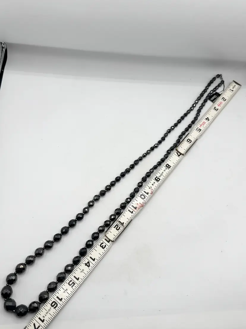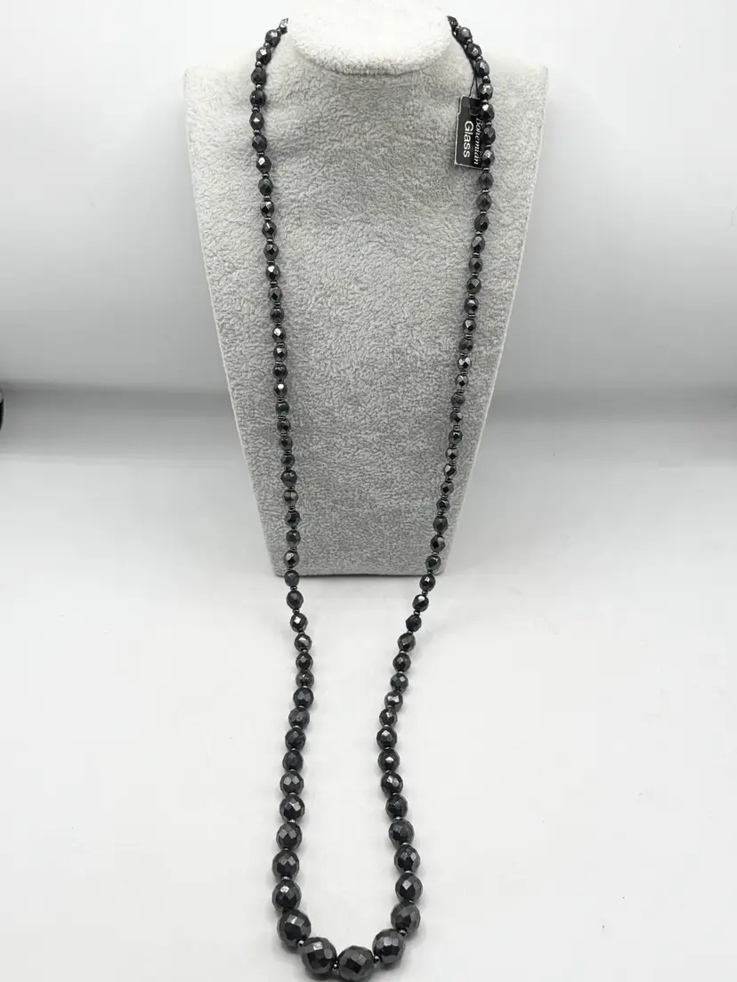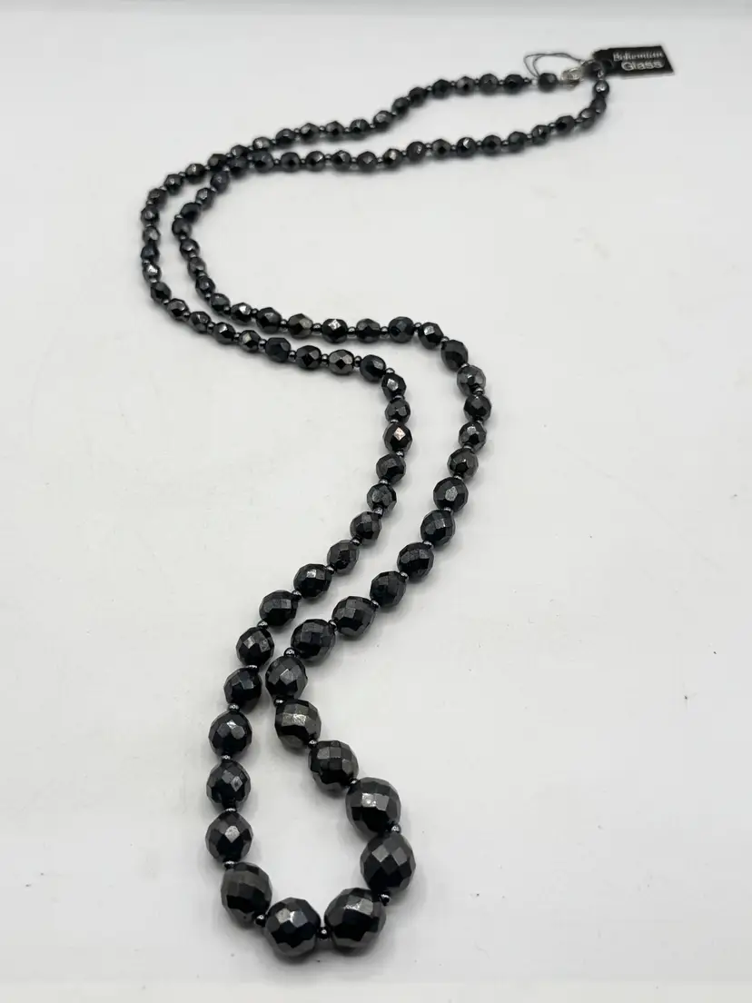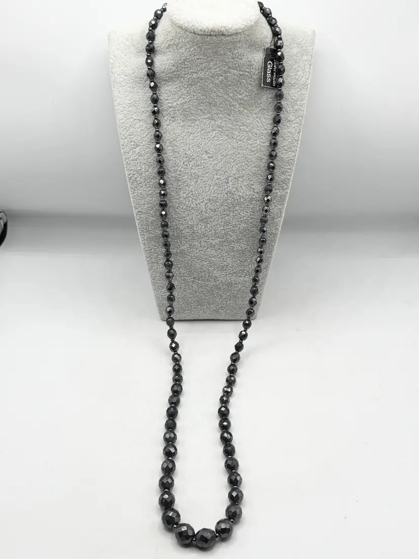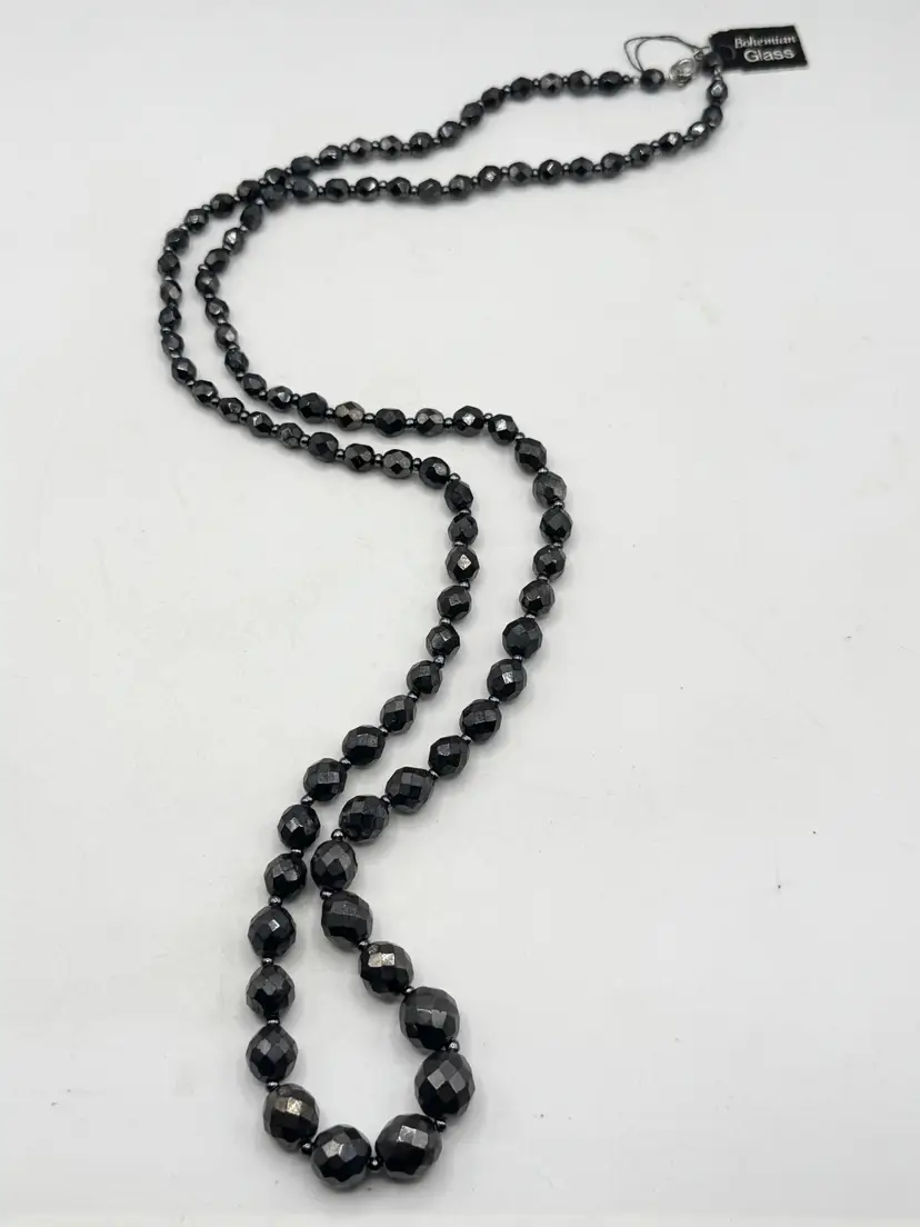 Vintage hematite bohemian glass beaded long necklace. Has original tag that reads bohemian glass. Vintage beaded necklace. MN56H.