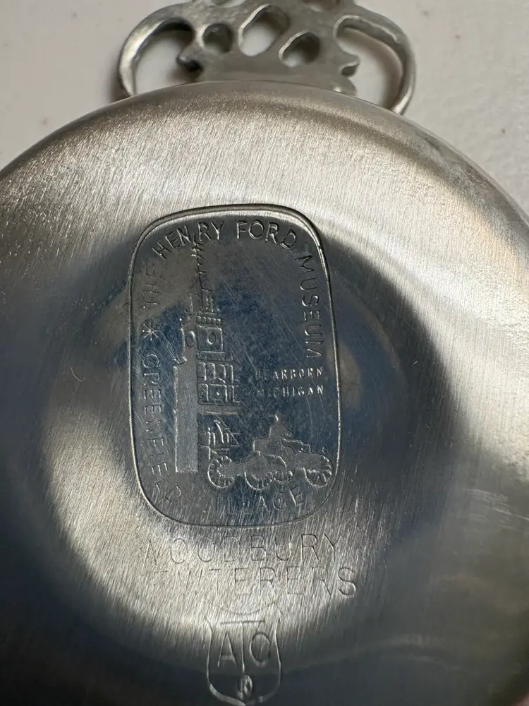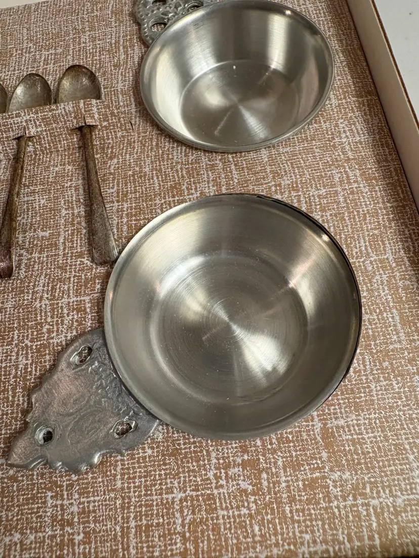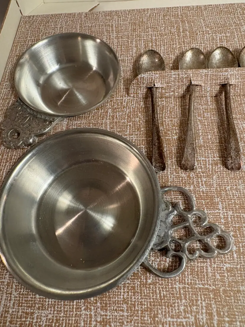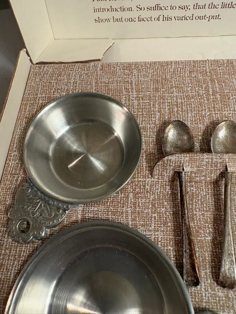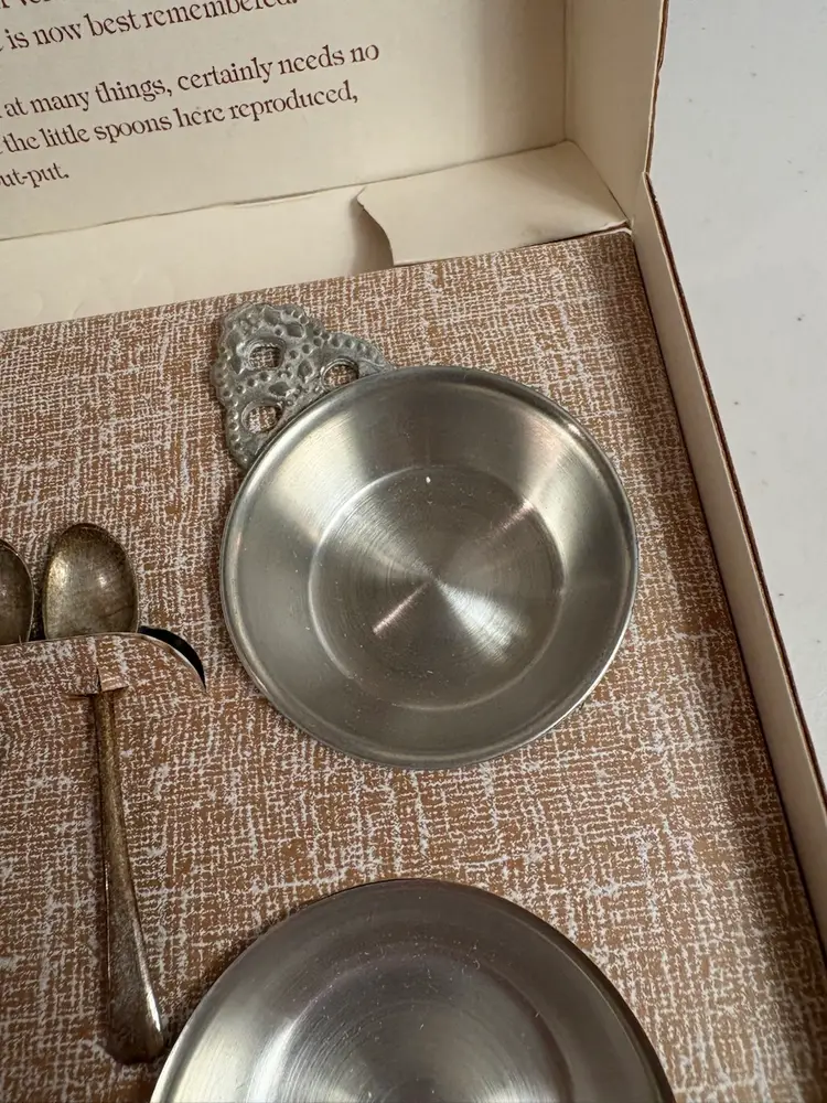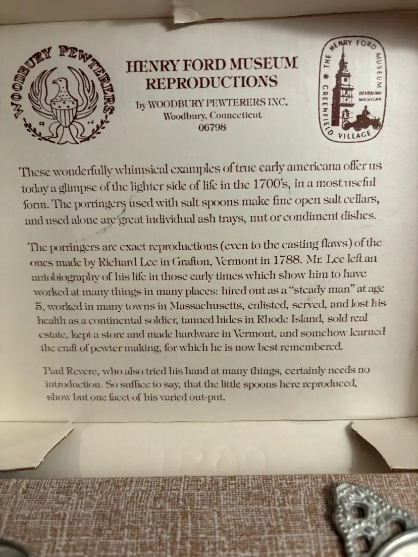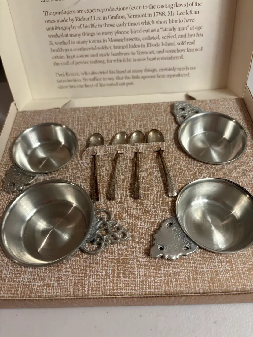 set of Henry Ford Museum reproductions by Woodbury Pewterers, Inc. The set includes porringers and salt spoons, which are reproductions of items made by Richard Lee in 1788 and Paul Revere, respectively.