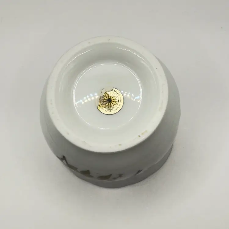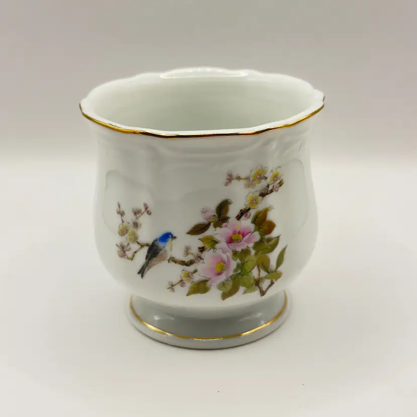 Add a touch of elegance to your home with this vintage porcelain herb pot. Featuring a delicate floral design with a charming bluebird, it's perfect for displaying small herb or as a standalone decorative piece. The gold trim adds a classic touch. In excellent condition with no chips or cracks. Measures 2.5x3.5x3.25 inches. Weighs 10oz.