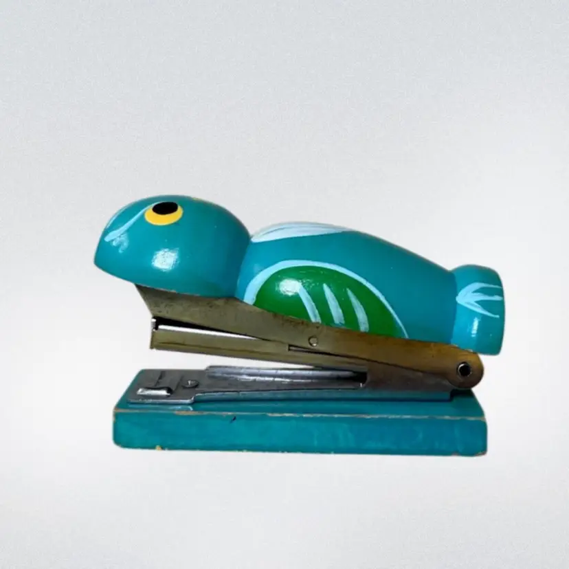 Very cute teal owl stapler by Herman Pecker and Co, made in Japan. This cutie can display standing up or like a normal stapler. It does have some paint wear on the edges. Includes a few tiny staples. About 4in long.
