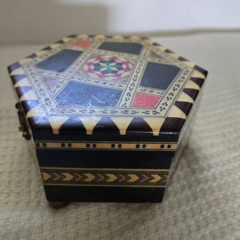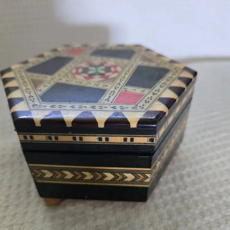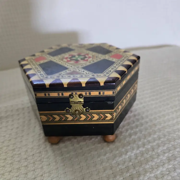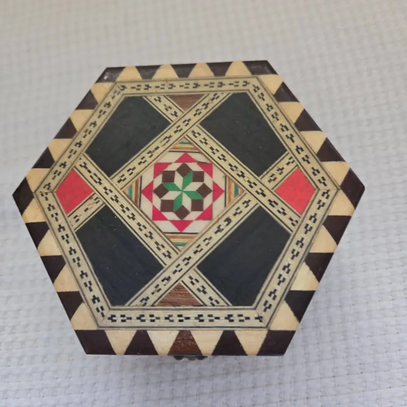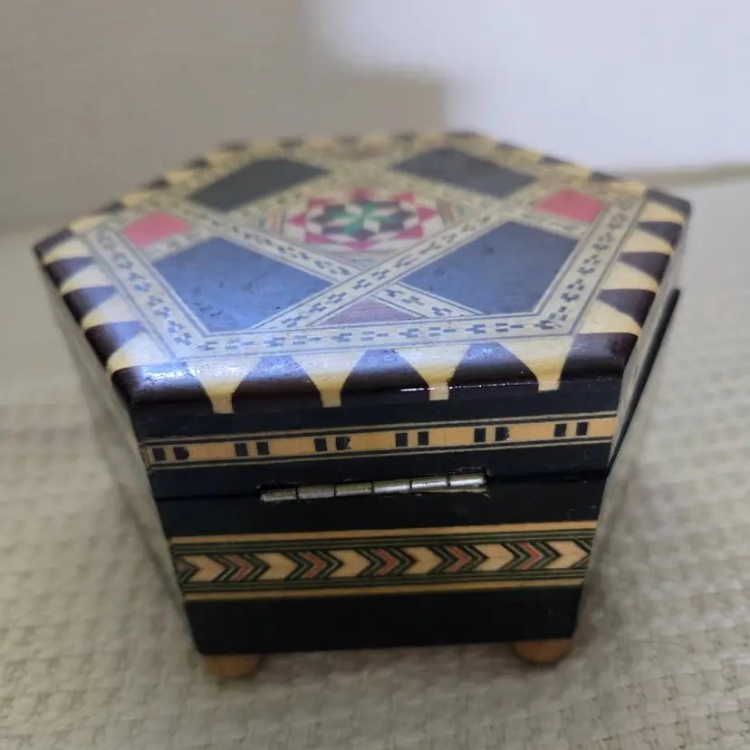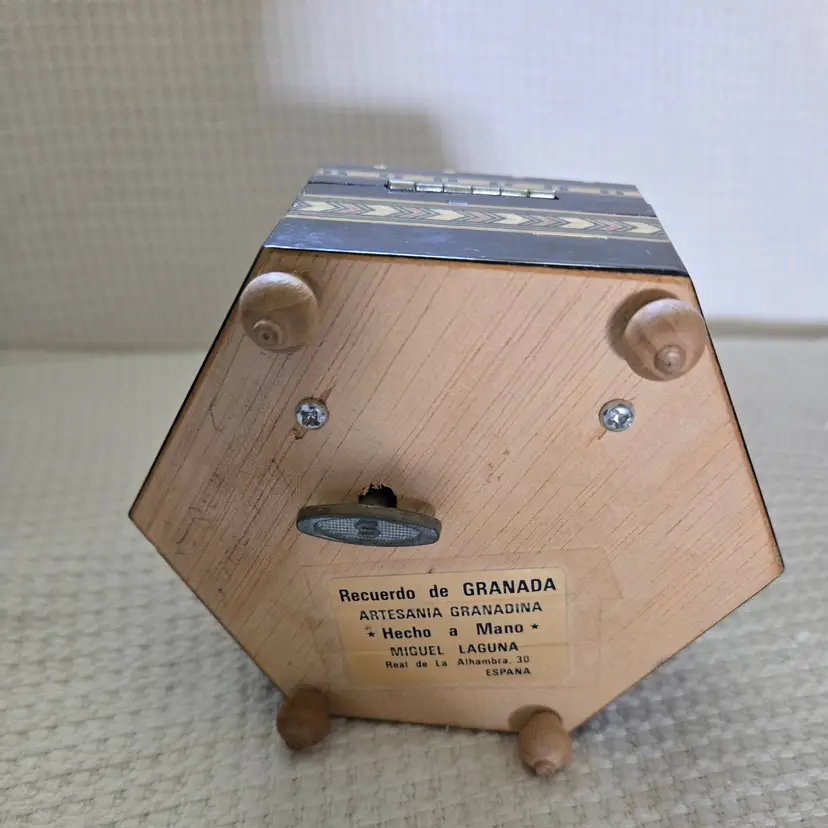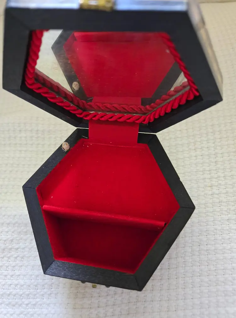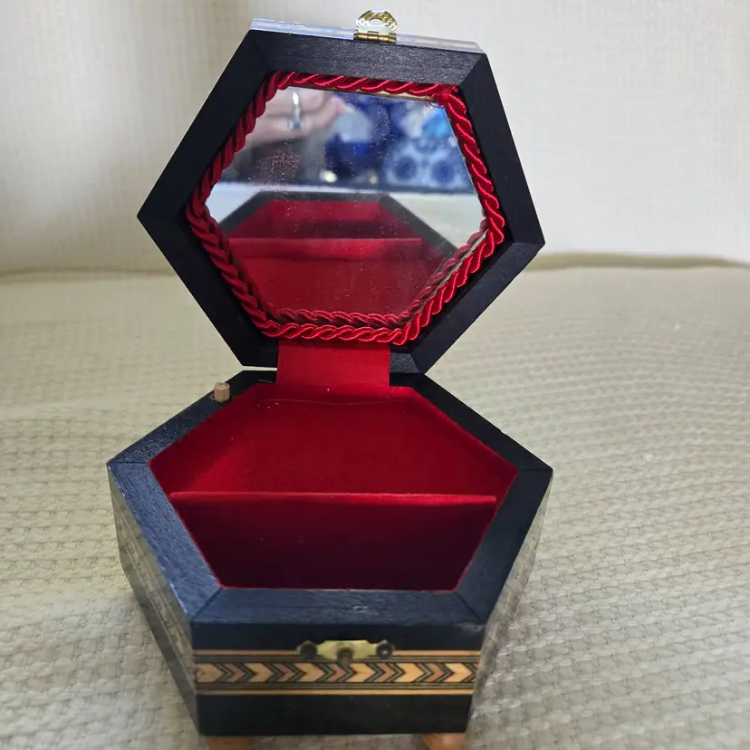 Has a red lining in great condition. The mirror has a red rope finish around it. Everything is intact. Plays "Hecho a Mano" with a wind up mechanism and has an original sticker on the bottom. Stands 2 1/2" tall and is 6x5 in a hexagon shape. In great condition. No call outs.