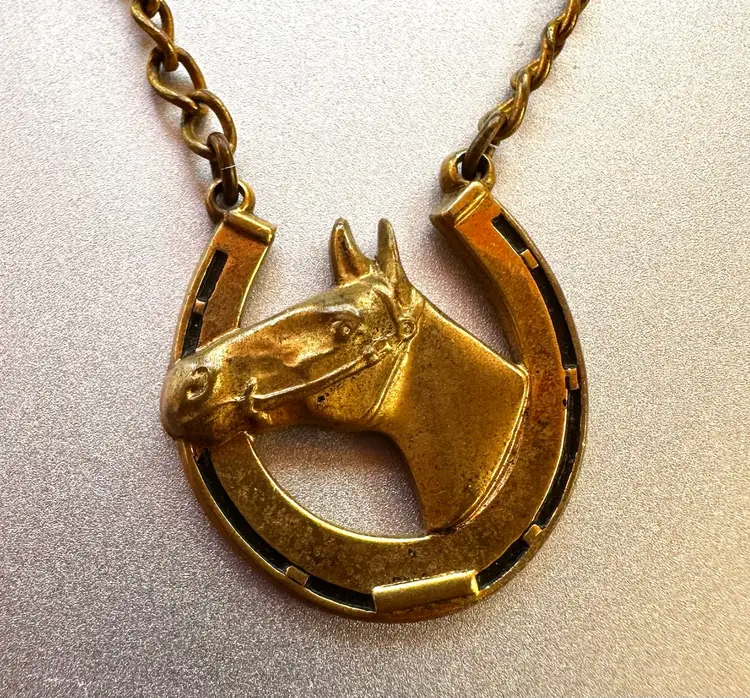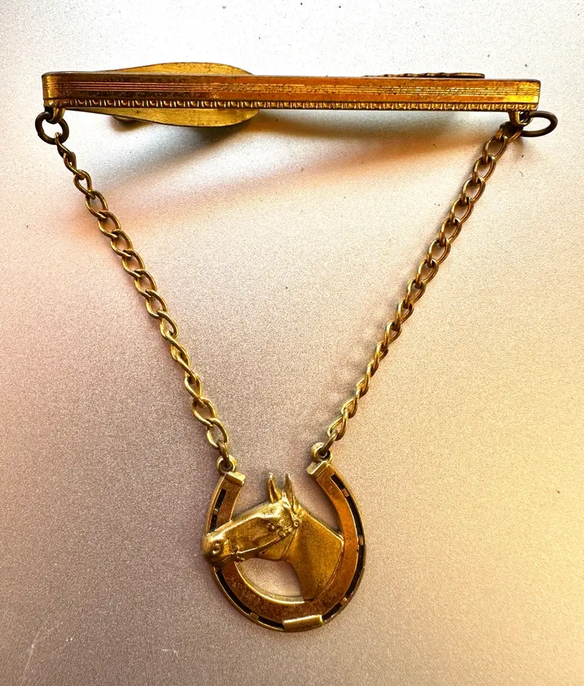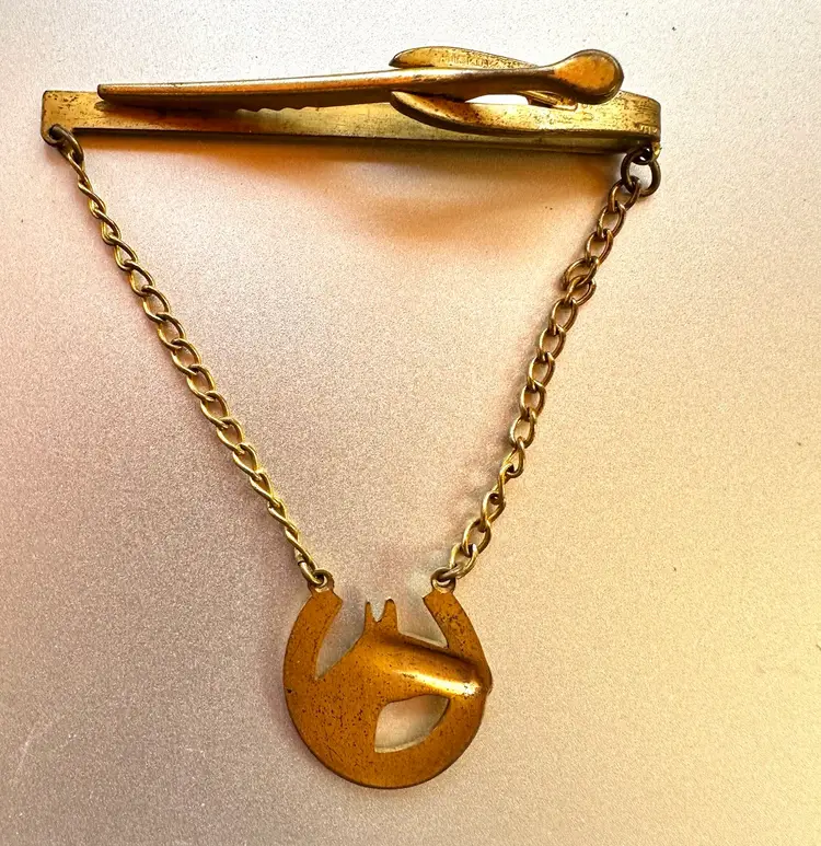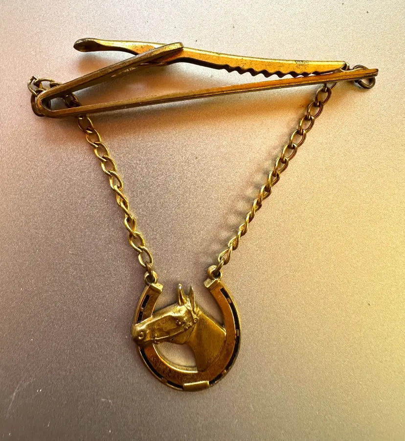 Fun vintage Hickok tie clip with an equestrian them. It has a horse head and horseshoe design. It is brass with a gold wash. It is 2.25” x 3”.
