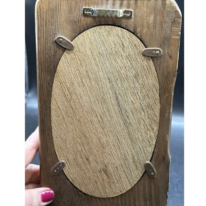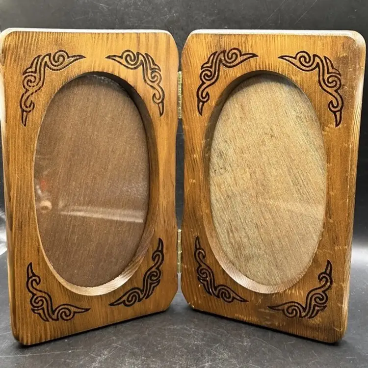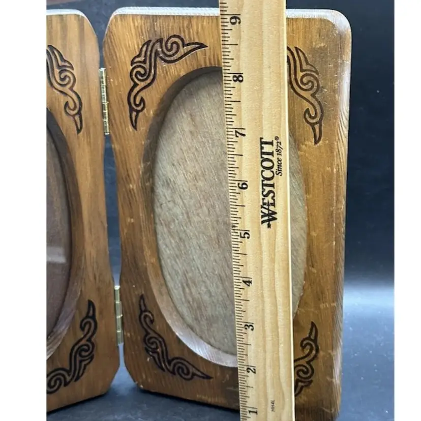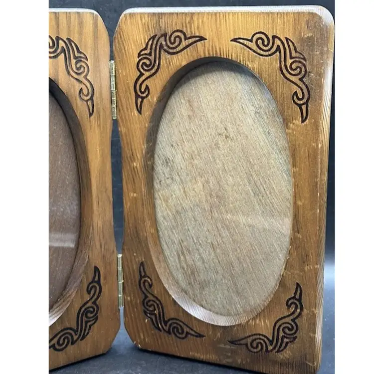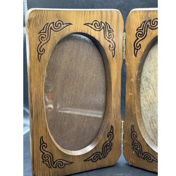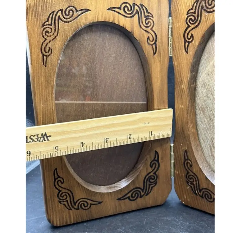 This vintage photo frame is a timeless piece that will add a touch of elegance to any home decor. Crafted from high-quality wood and varnished to perfection, this original hinged frame features two oval openings suitable for photo sizes of 4 1/2" x 7". The interior dimensions of the frame are 4 1/2" in width and 7" in height, while the overall dimensions are 5 1/4" in length, 1" in width, and 9" in height.