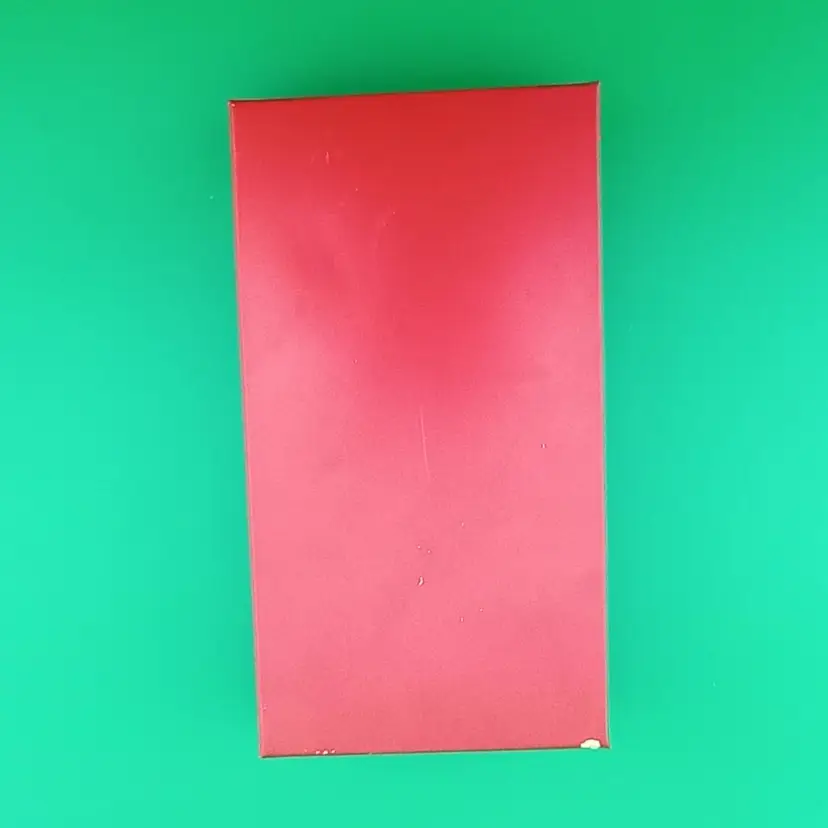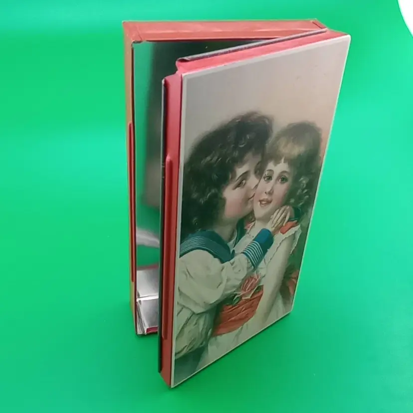 This is an adorable vintage tin box with a hinged lid. There is a small bit of color loss on the back at the bottom, as shown in the last picture. Otherwise excellent condition.