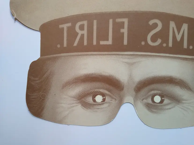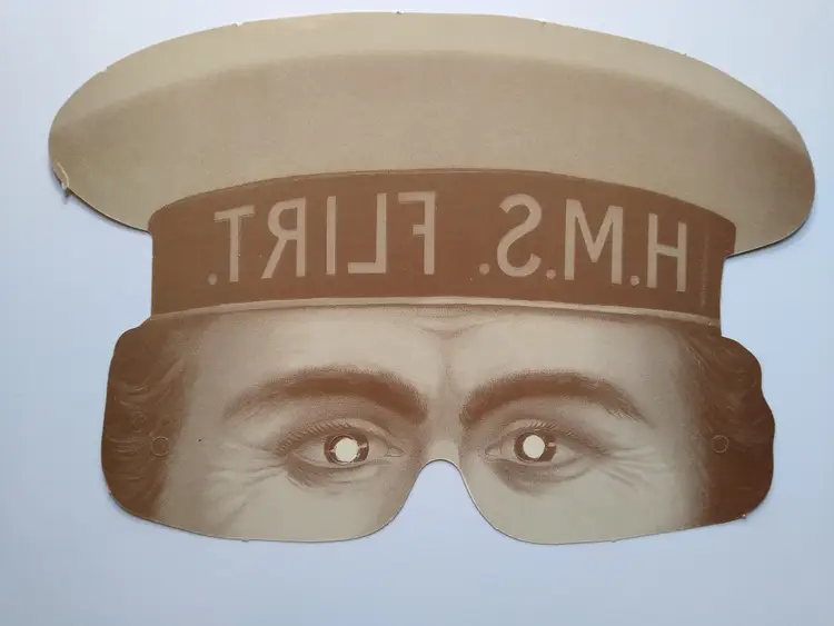 This listing includes one paper mask as pictured. It is crafted from paper or cardstock, showcasing a multi-color design with skin tones, brown hair and hat band, beige hat, and red lettering for "H.M.S. FLIRT". This piece is ideal for historical reenactments, costume events, or as a decorative item that captures a specific period aesthetic related to naval history and costume accessories.