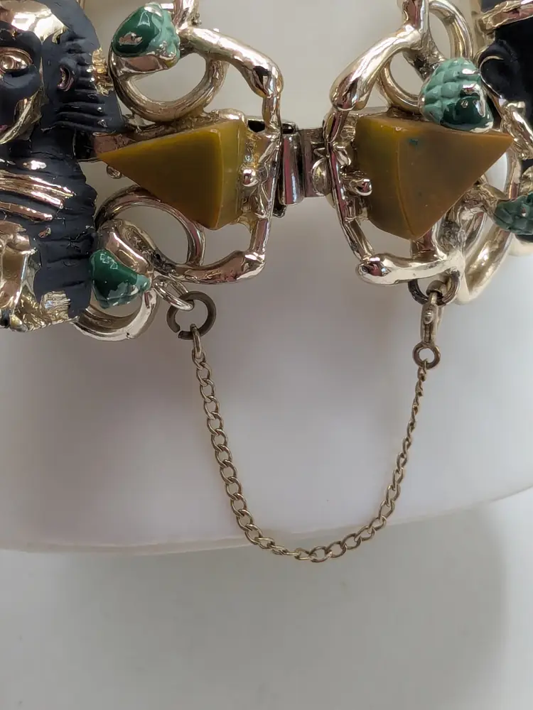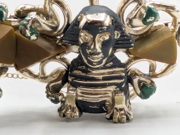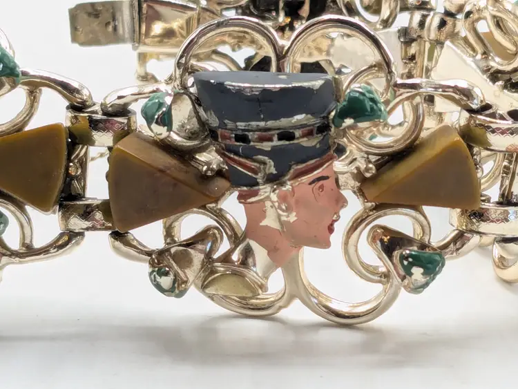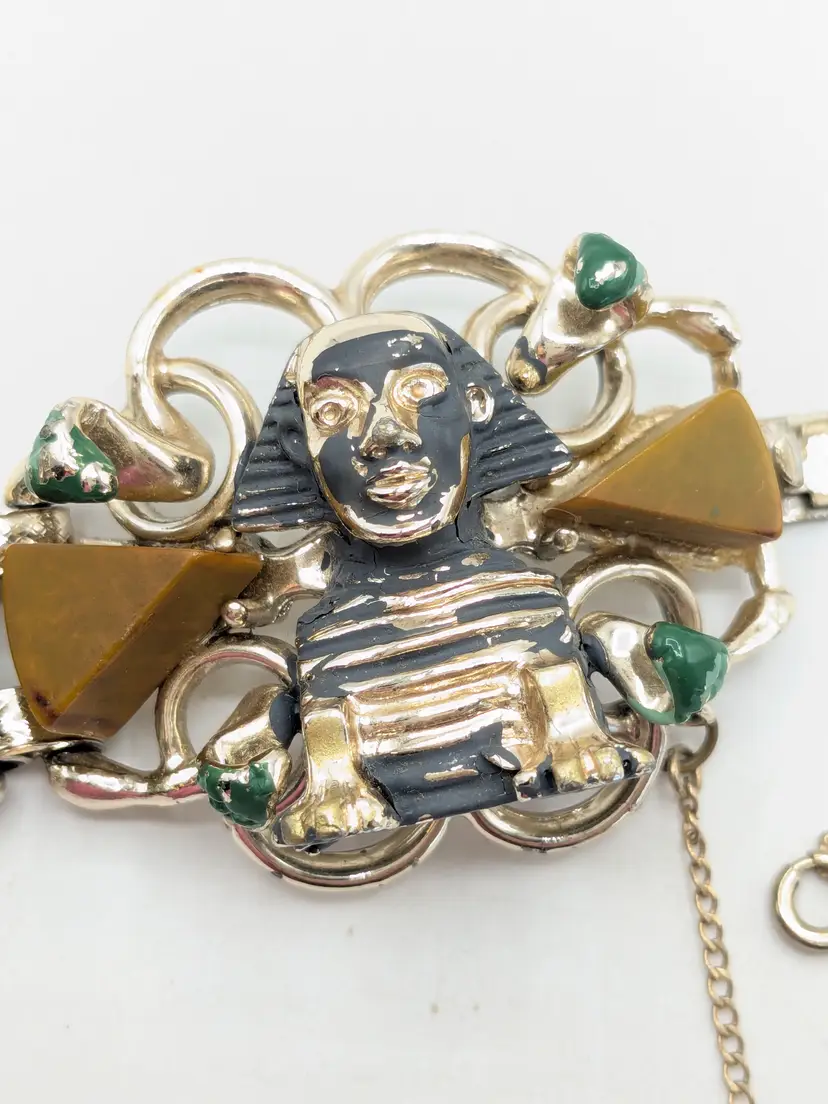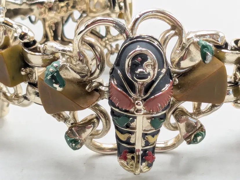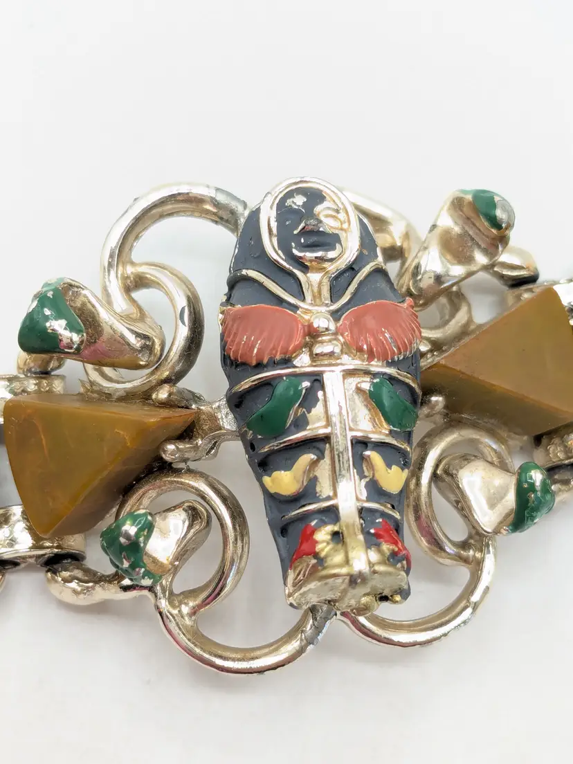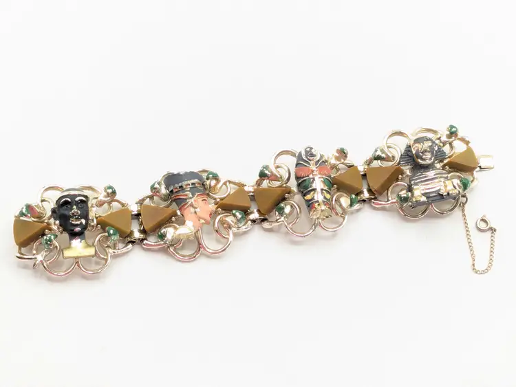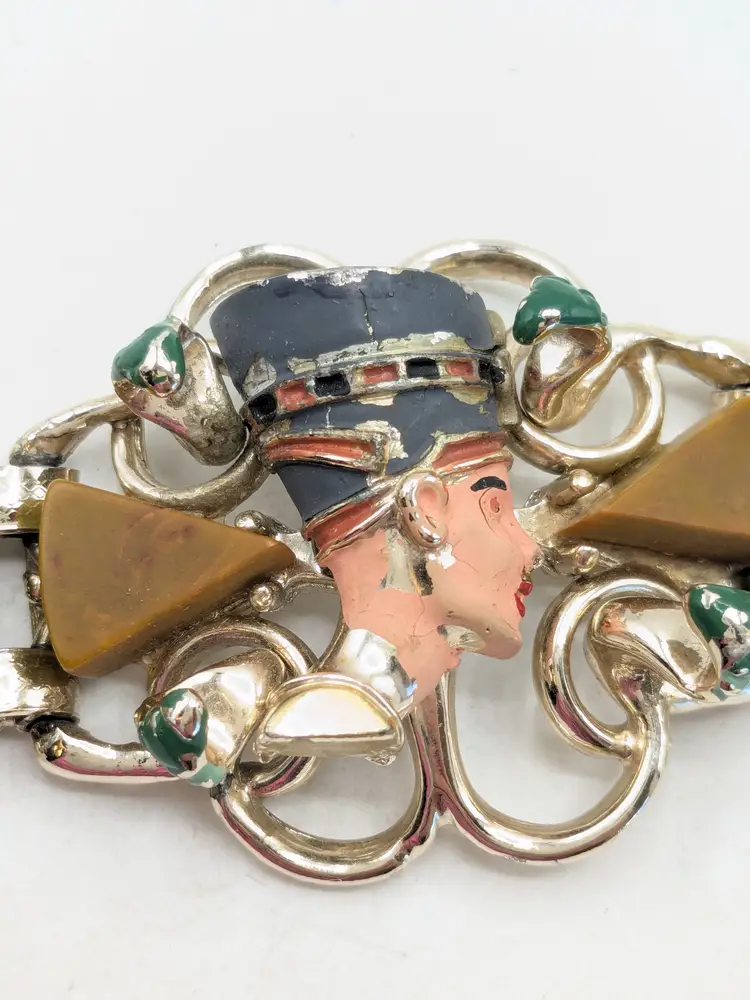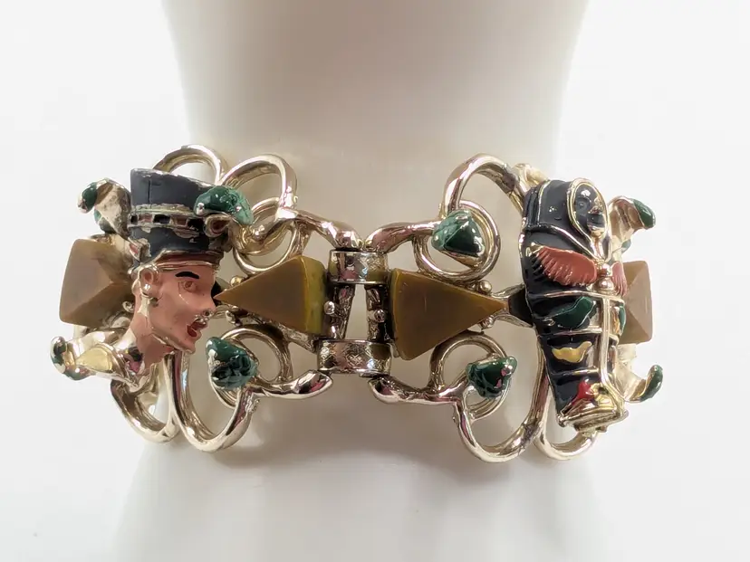 Incredible bracelet! Good condition. This is attributed to Hobe but is unsigned. Features Queen Nefertiti, mummy, sphinx and blackamoor face. Gold tone is bright and shiny with no color loss. Features Bakelite wedges. Some wear to enameling but minimal for age. Safety chain is attached. Hidden box clasp. Measures 7" and 1 1/2" wide. EN3