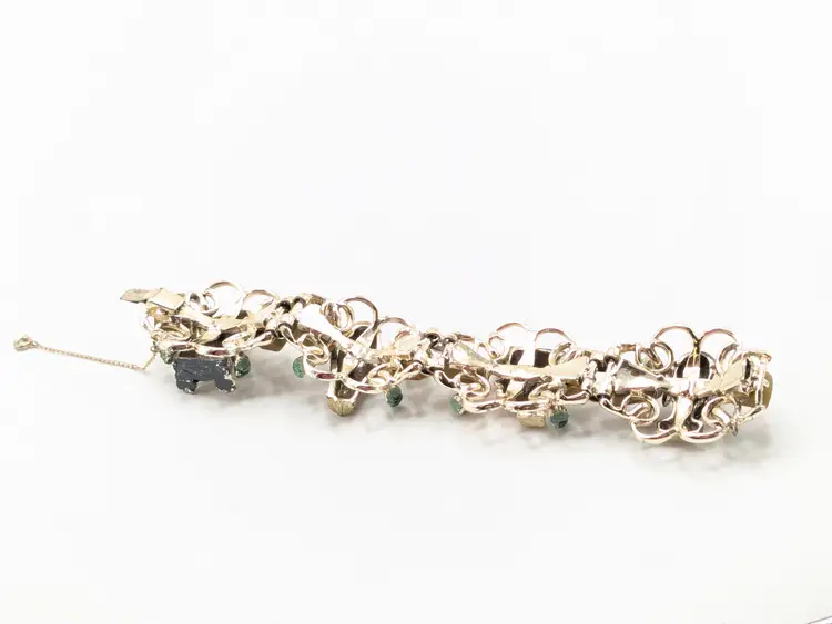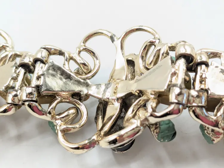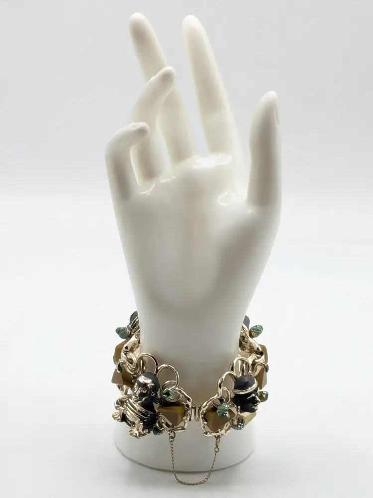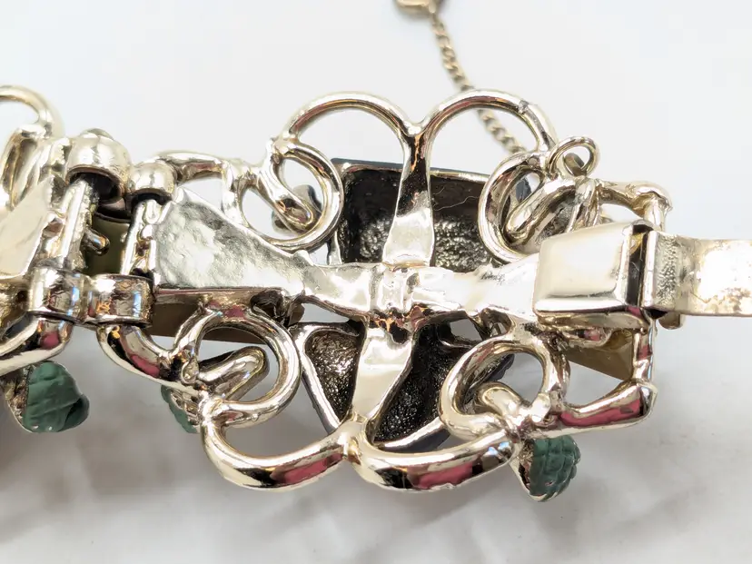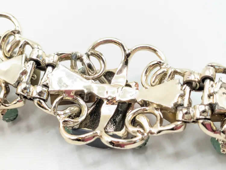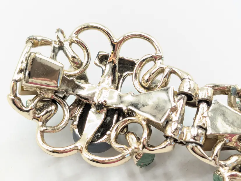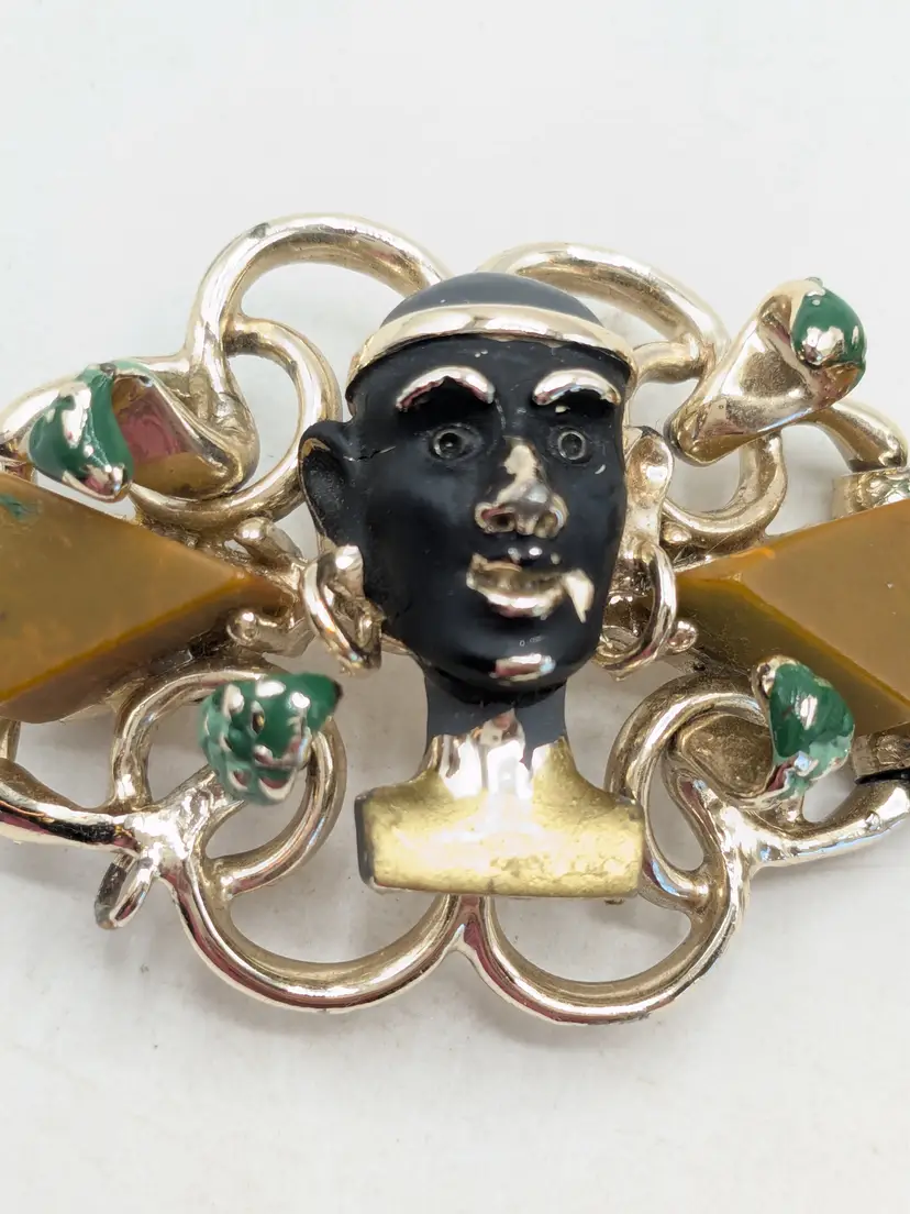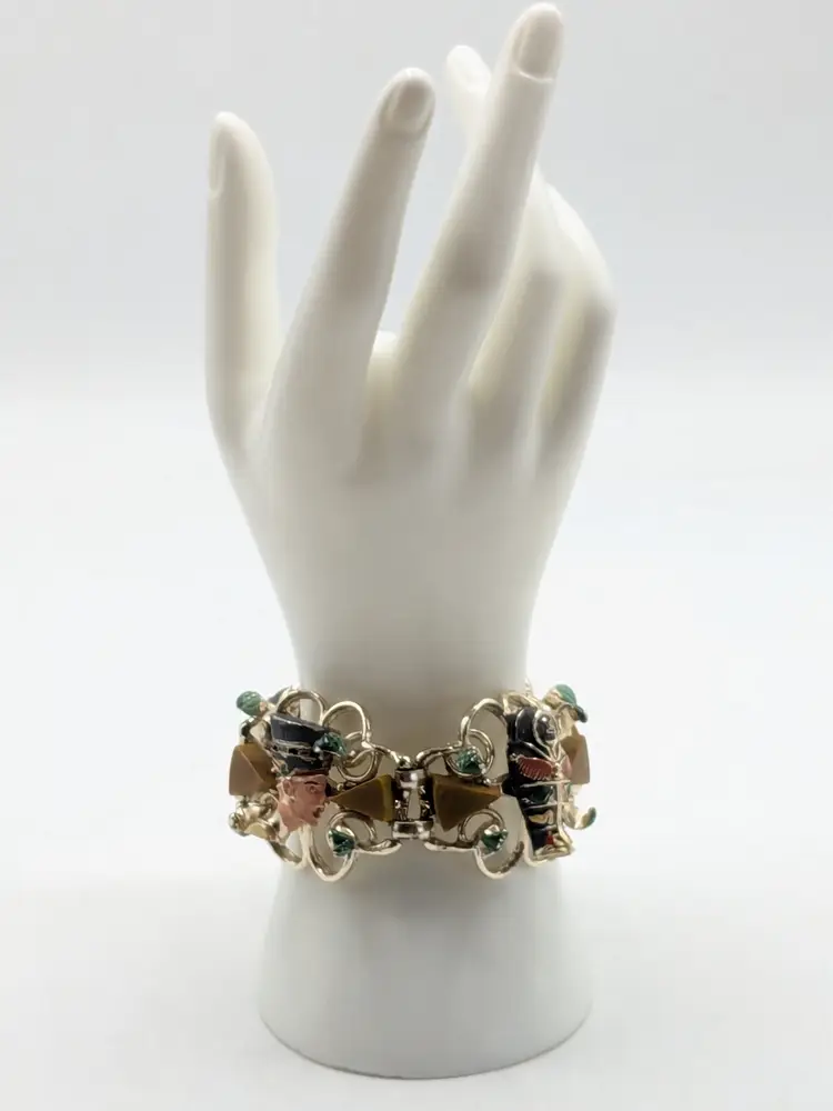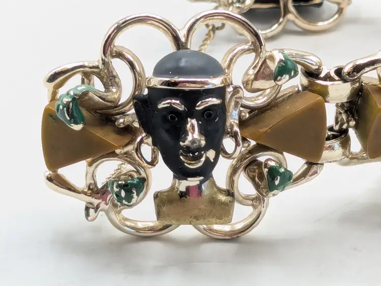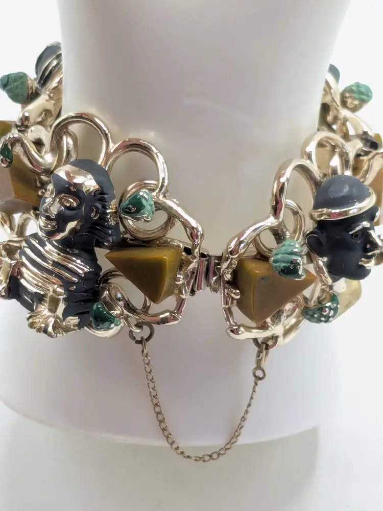 Incredible bracelet! Good condition. This is attributed to Hobe but is unsigned. Features Queen Nefertiti, mummy, sphinx and blackamoor face. Gold tone is bright and shiny with no color loss. Features Bakelite wedges. Some wear to enameling but minimal for age. Safety chain is attached. Hidden box clasp. Measures 7" and 1 1/2" wide. EN3