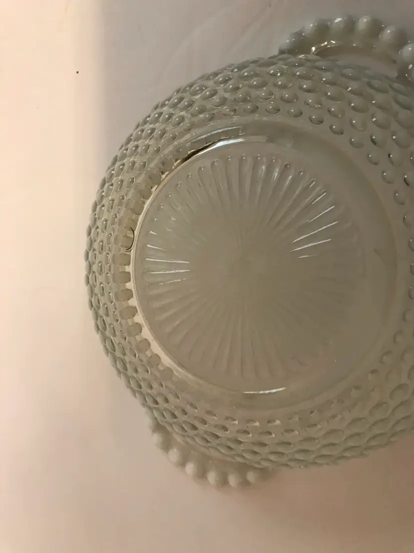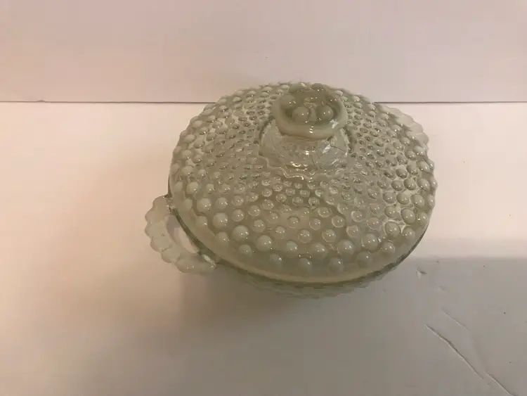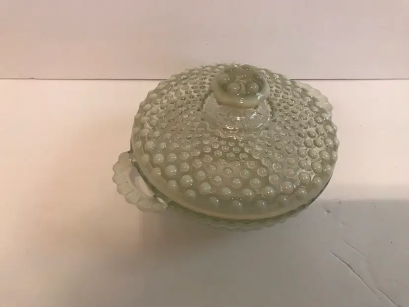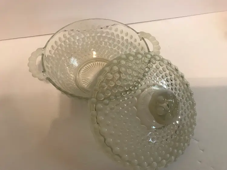 vintage hobnail covered candy bowl clear and white opalescent (8" x 5") Candy jar with matching lid and handles decorated in beautiful hobnail texture with white accents. Opaline lidded candy stasher. Anchor hocking moonstone candy dish & lid. There is one tiny chip on lid. Tried to photograph but can’t really see it. Perfect for candies, snacks, or as a decorative piece.
