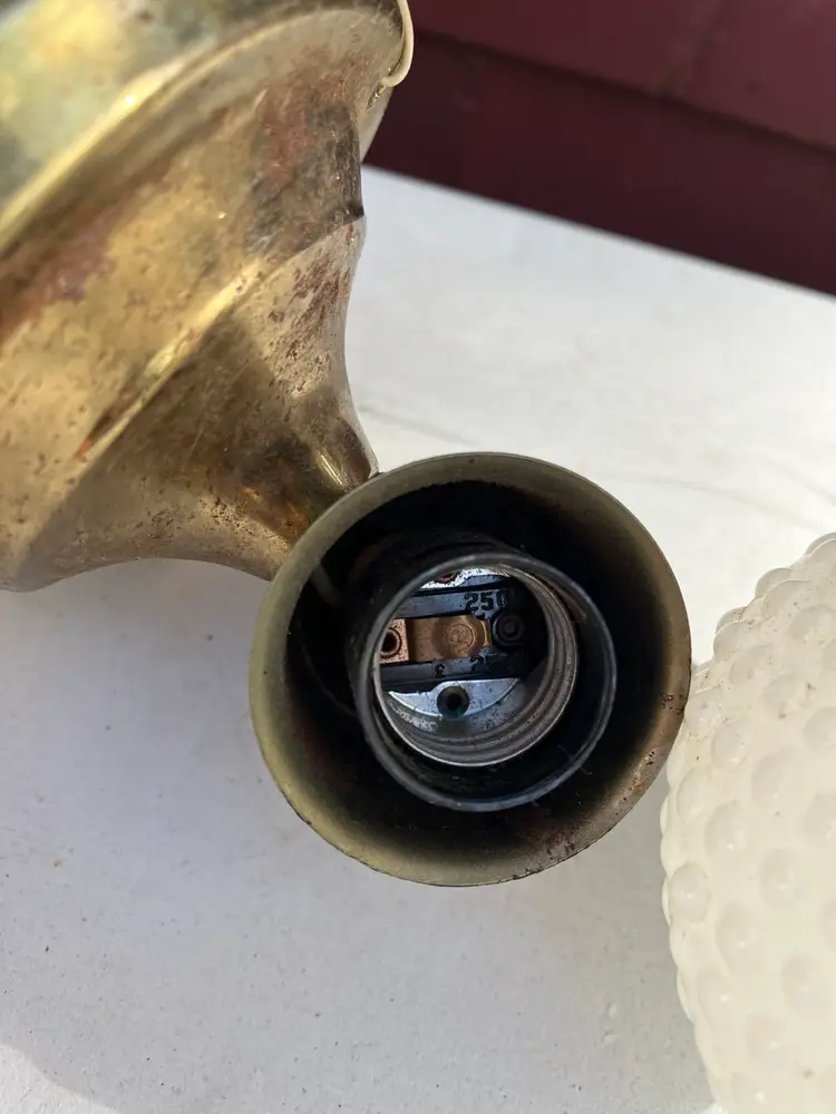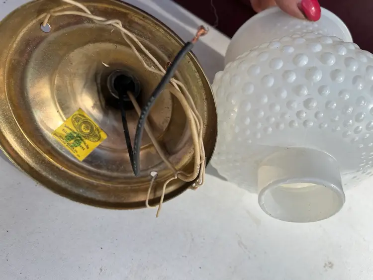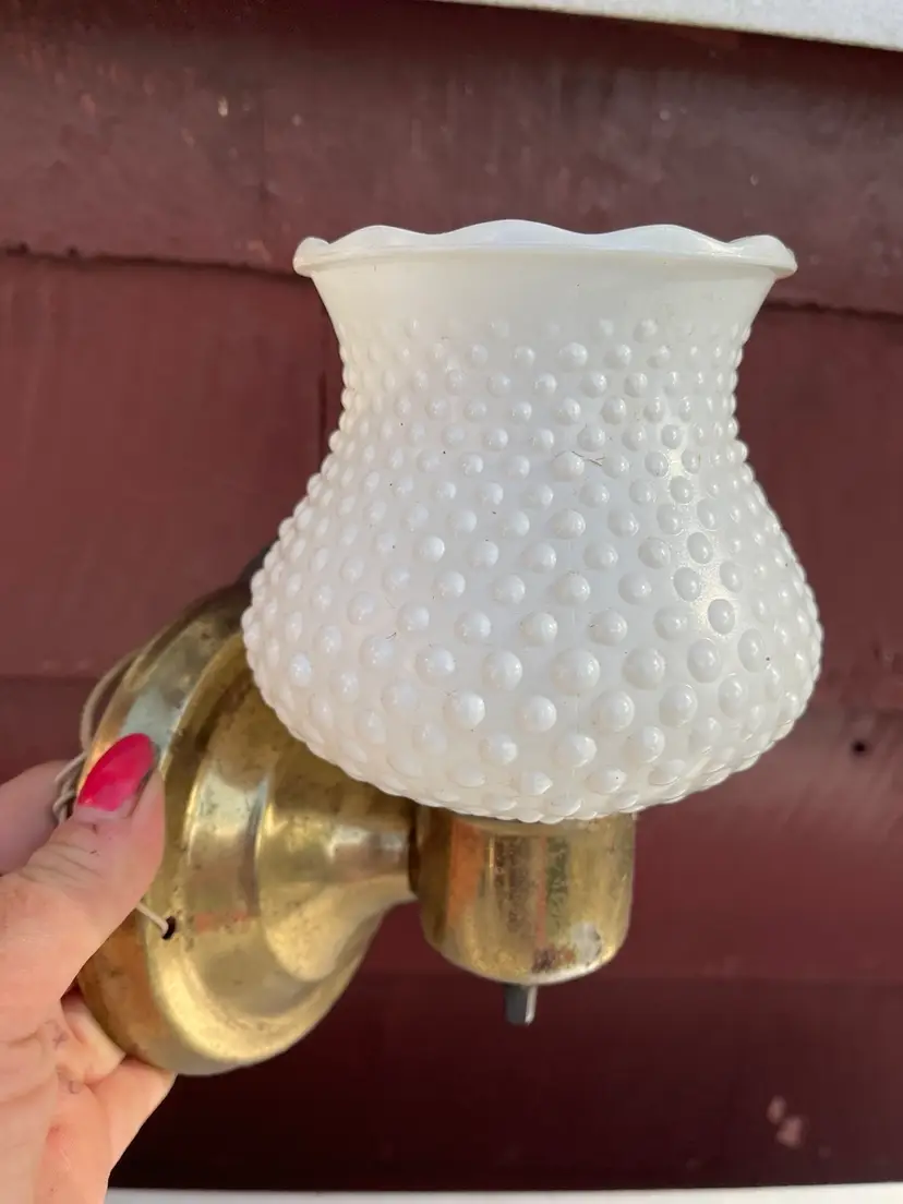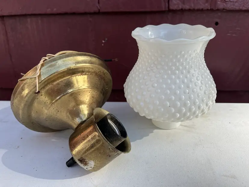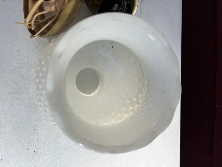 This is so cute! Electrical wires are there but it hasn’t been tested. There is rust on the gold plated base. It needs tlc. The rims aren’t perfect on the shade but not cracked. Flea bites. The shade is 5”x4” and the base is almost 6” When put together it’s 8”