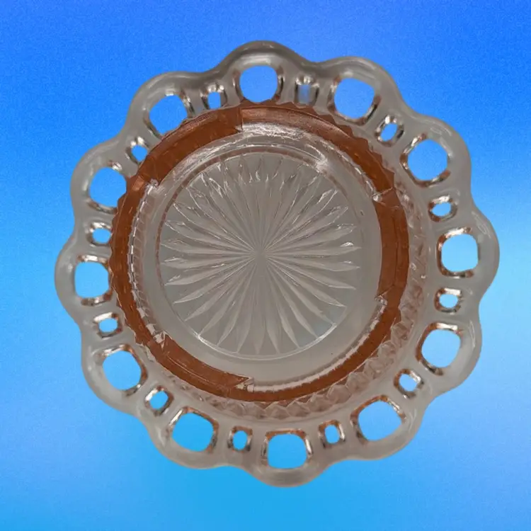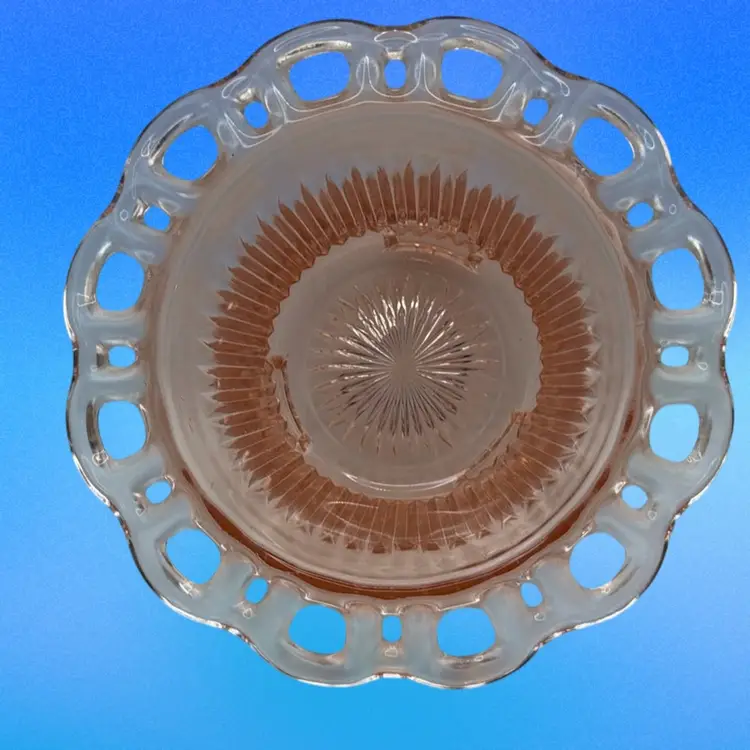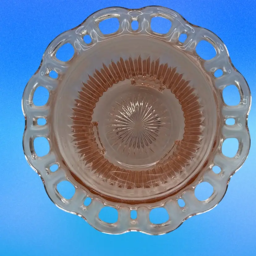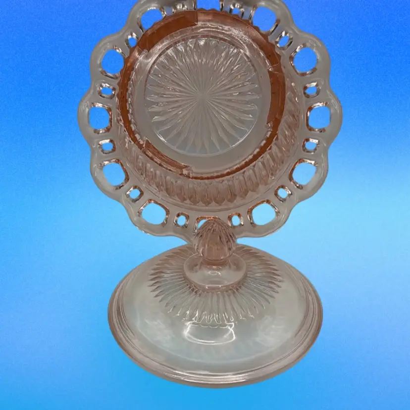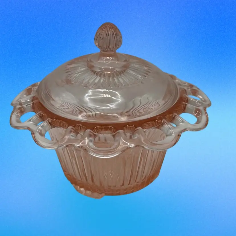Featuring the Old Colony Lace Edge pattern from the mid 1930’s. Beautiful pink color with a scalloped edge design and 3 feet. One small chip on the rim of the lid, otherwise great condition for the age.