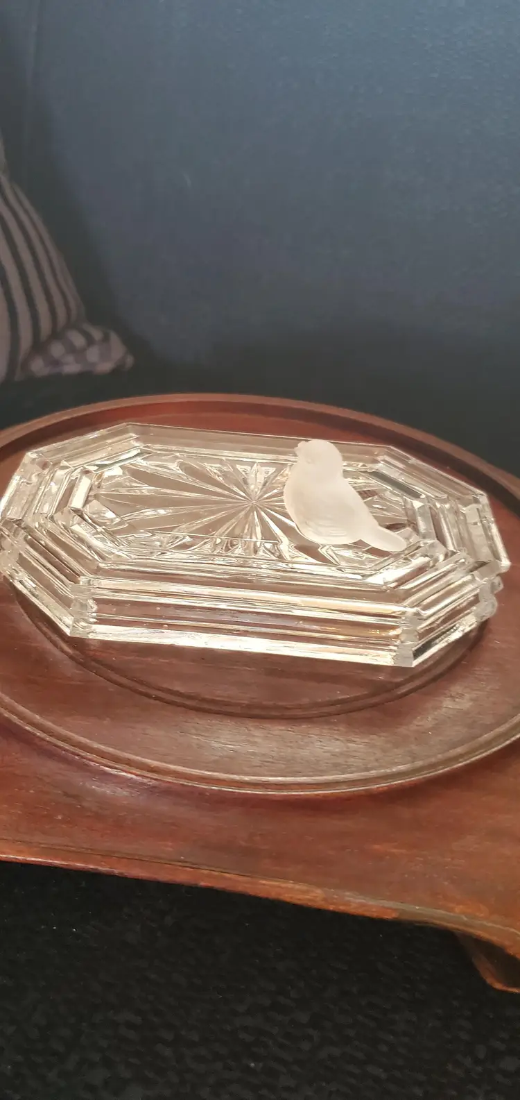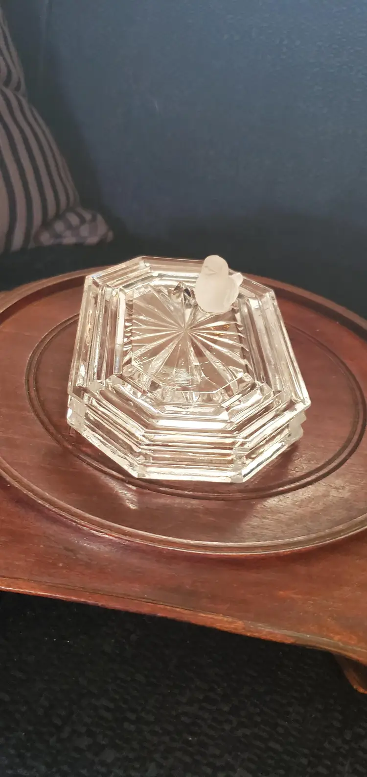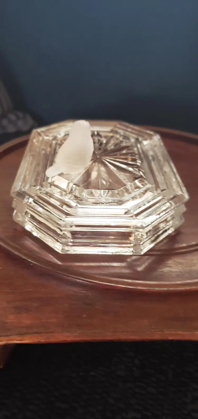 Beautiful 24% lead crystal trinket box made in Germany. Has a frosted bird on lid. Would look beautiful on a dresser or vanity.