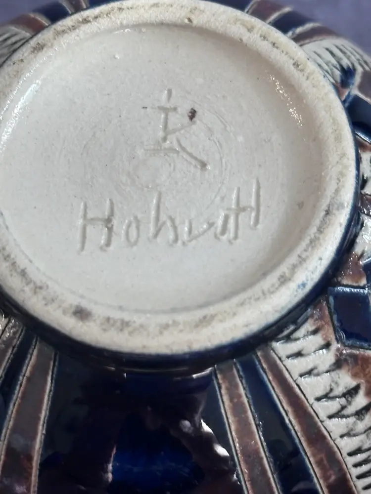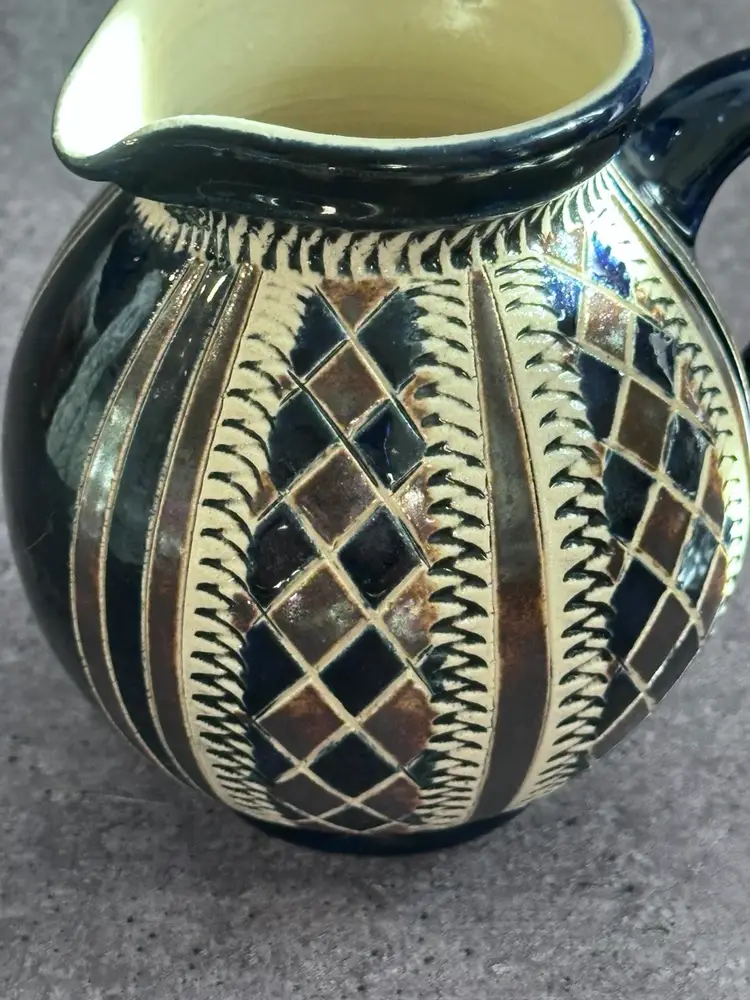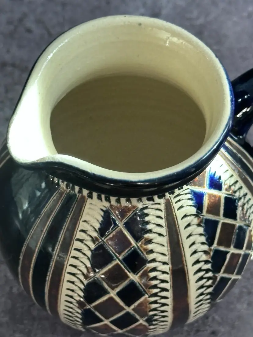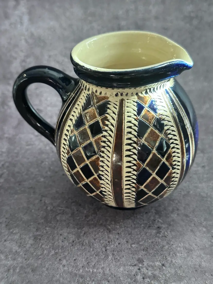I do not know a lot about this particular artist but it’s a cute little pitcher or creamer but also could be used as a small flower pot. It is black with a geometric carved design all around. There are no chips and cracks. Measures 4 inches tall and 2 1/2 inches wide at the top. I do combine shipping.