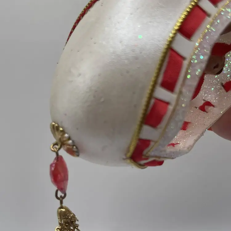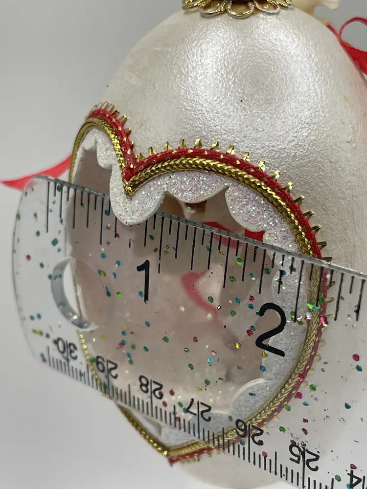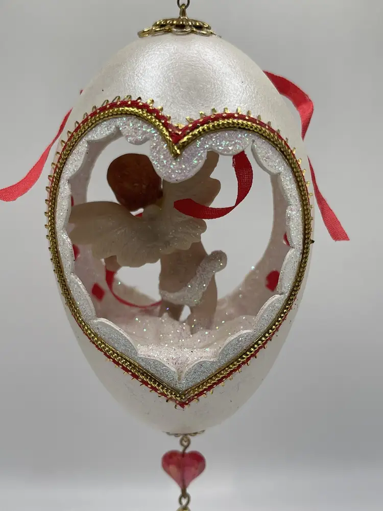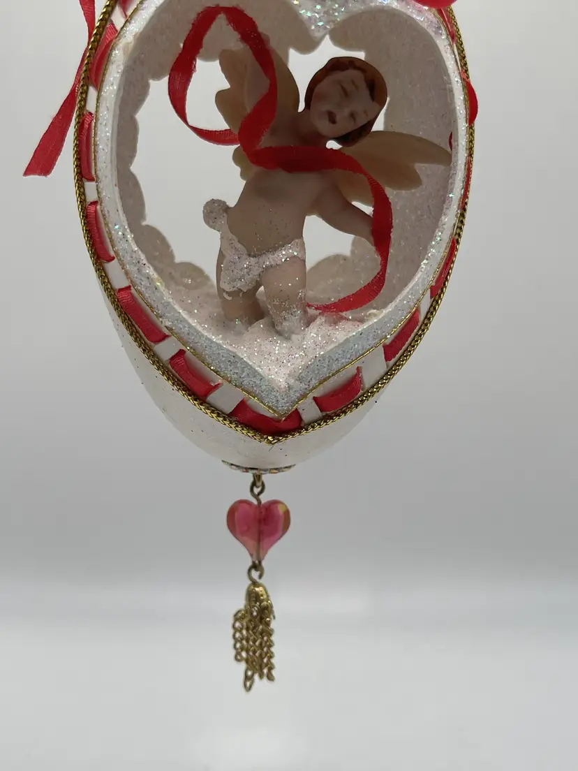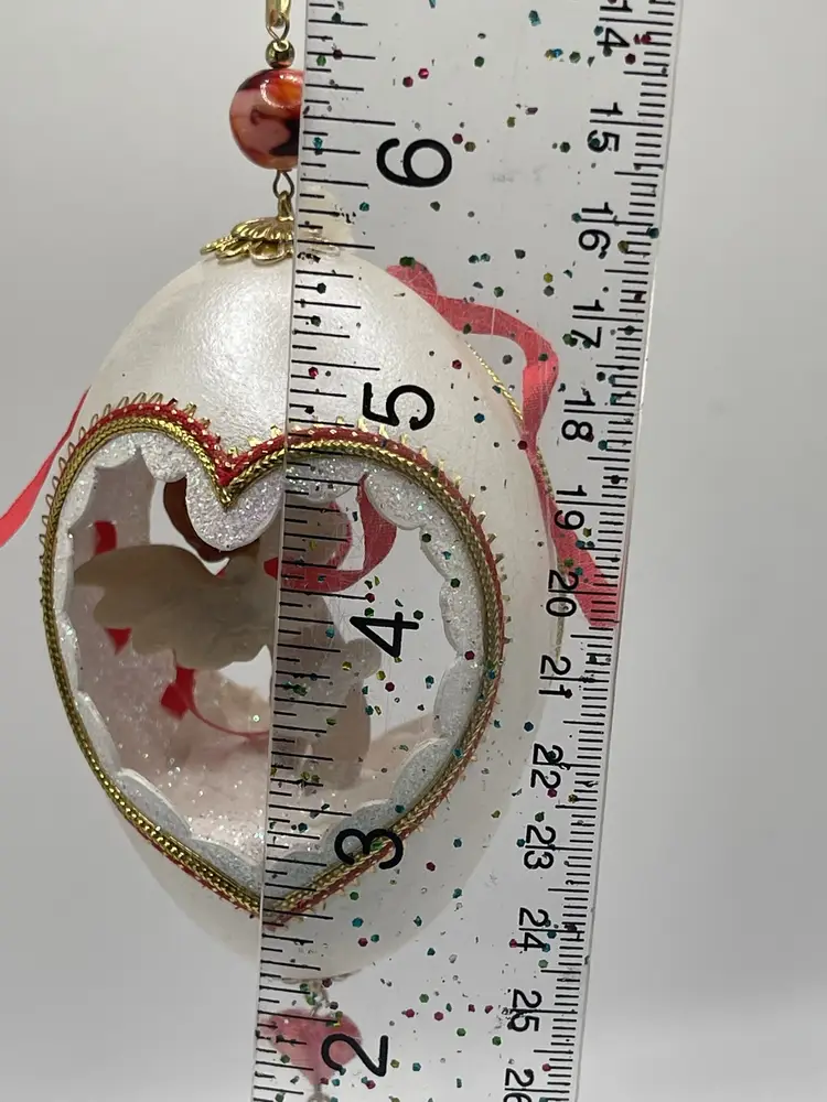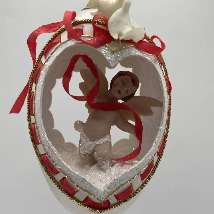 Add a touch of vintage charm to your Christmas decor with this handcrafted Large Egg Diorama Cherub Red Cupid and doves Ornament. The ornament features a beautiful floral pattern and is embellished with glitter, shell, and other embellishments. Measuring 6 inches in length and 2.5 inches in width, this oval-shaped ornament is perfect for adding a festive touch to your tree or holiday display.
