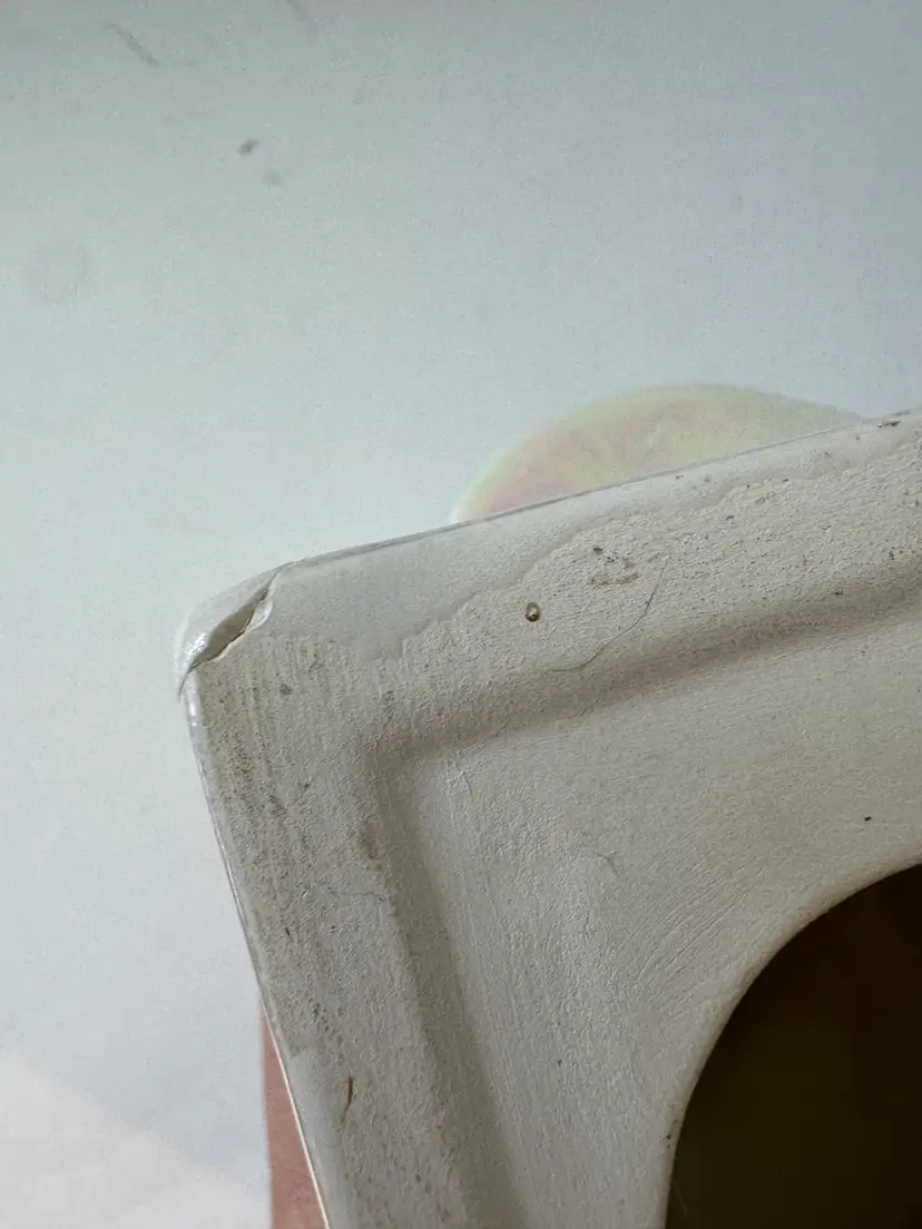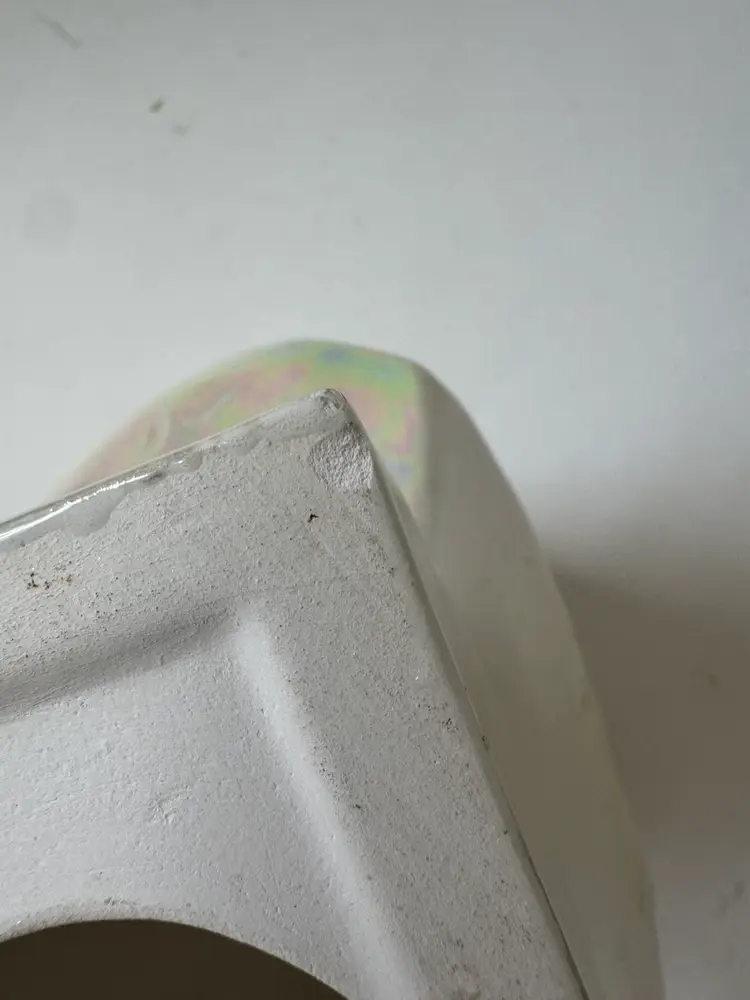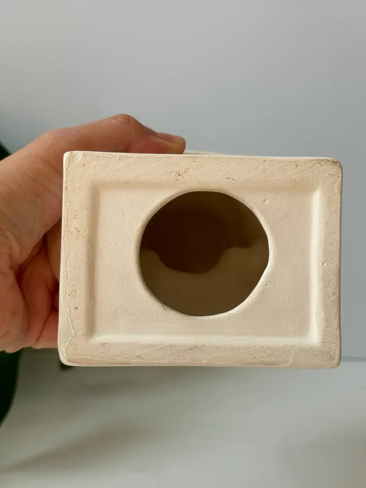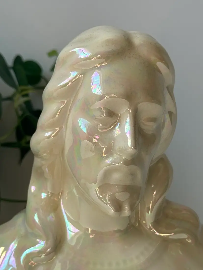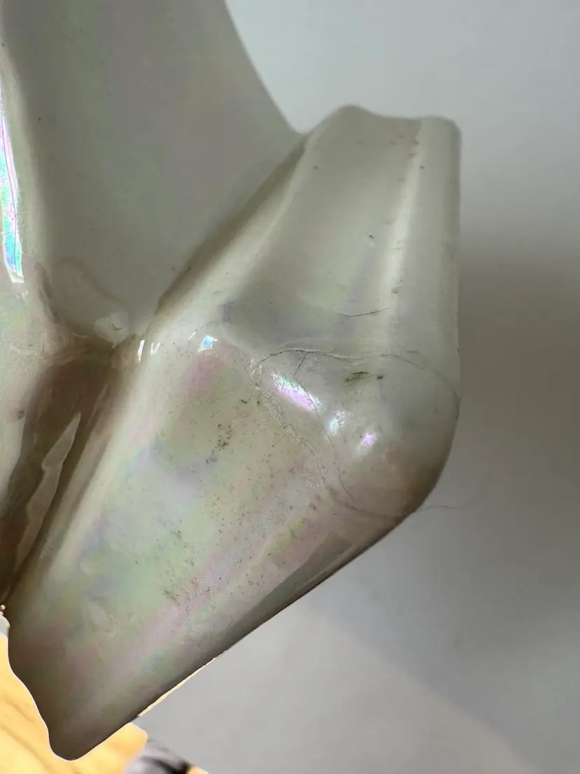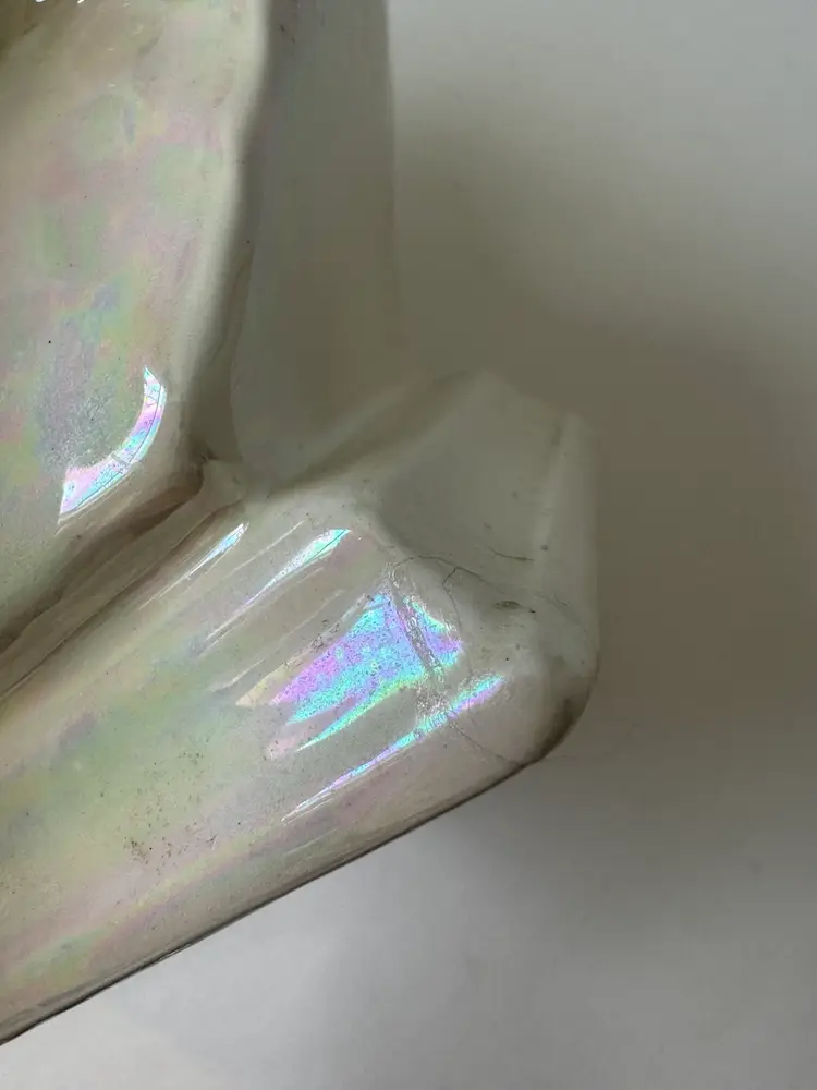 He’s hollow and made of ceramic with a pearl like glaze. On the bottom, right hand corner, a piece chipped off and has been glued back on. There is another small chip underneath. 7” x 3” x 4”