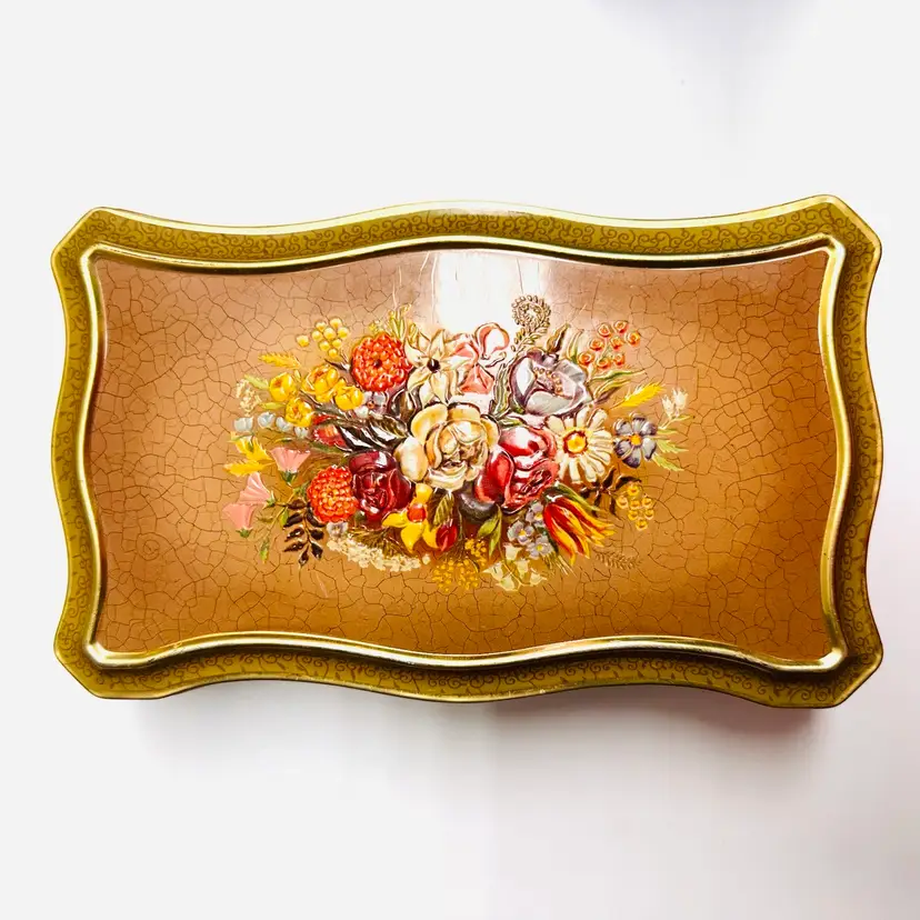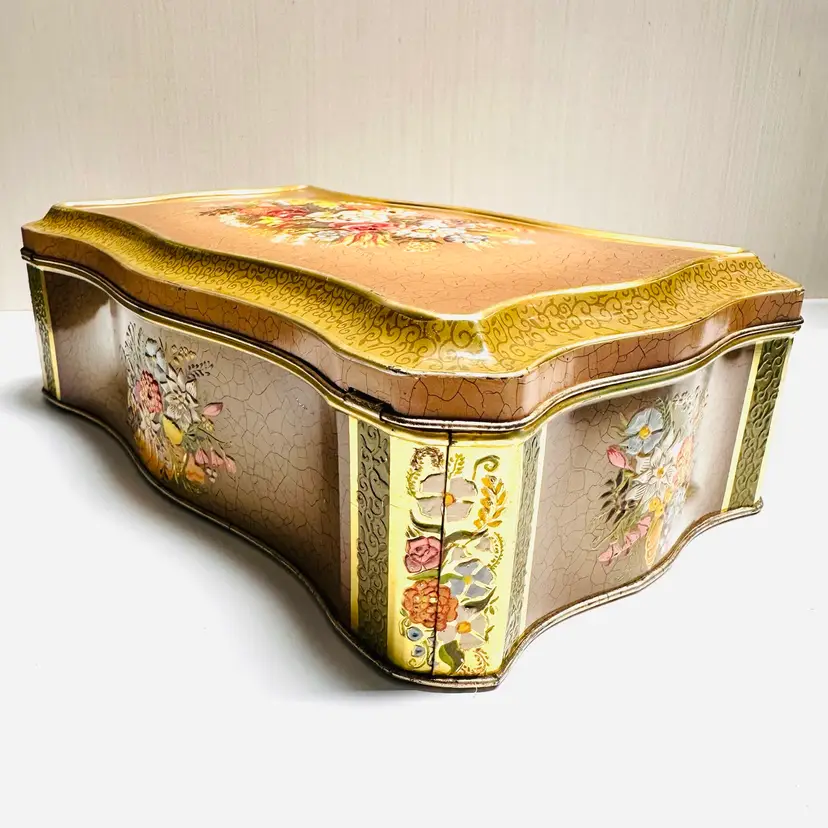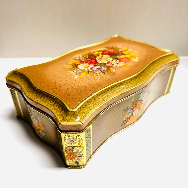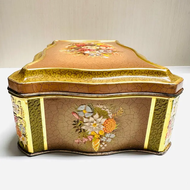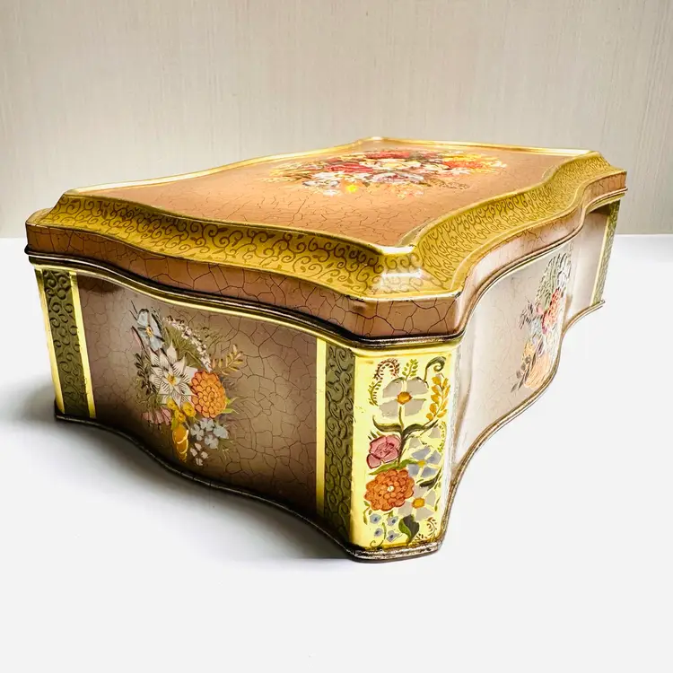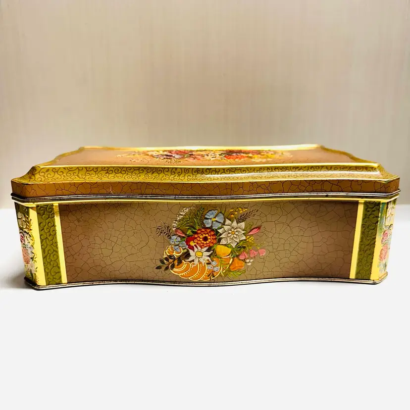 Previously owned metal tin lidded hinged rectangular box that is gold toned with brown faux crackle with embossed flower bouquets. Made in Holland. Please note that there are small scratches throughout and rust in the interior of the box (see pictures).