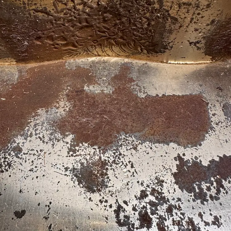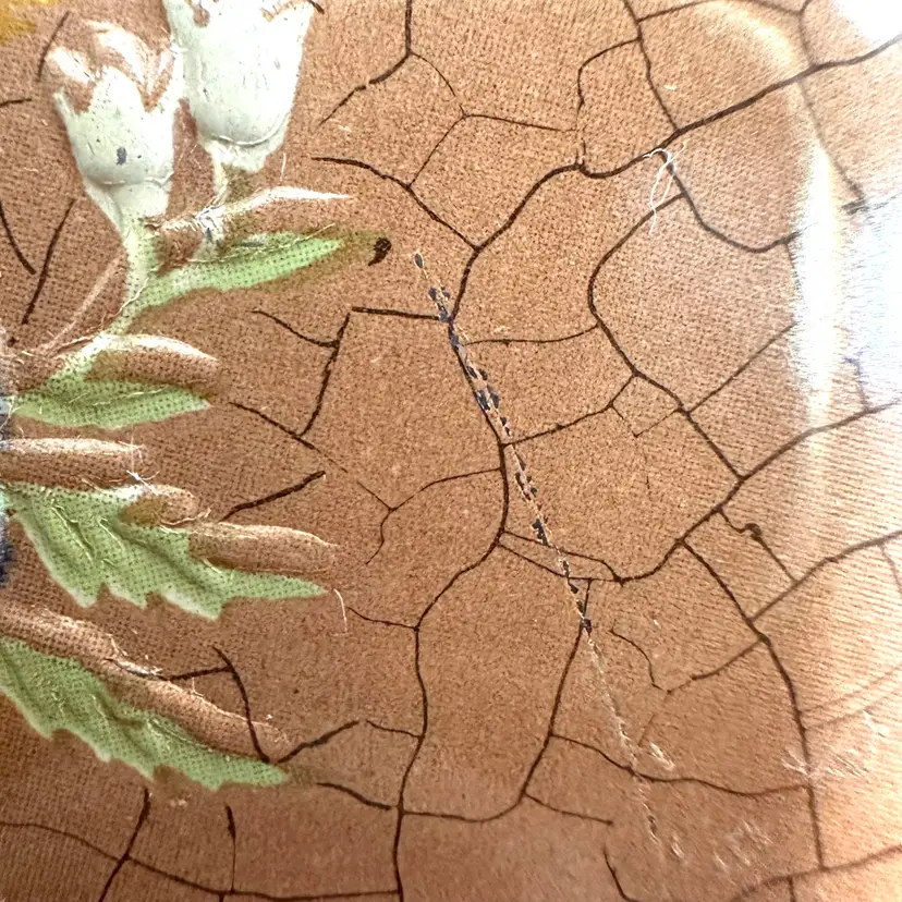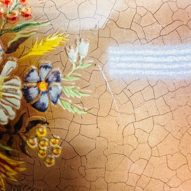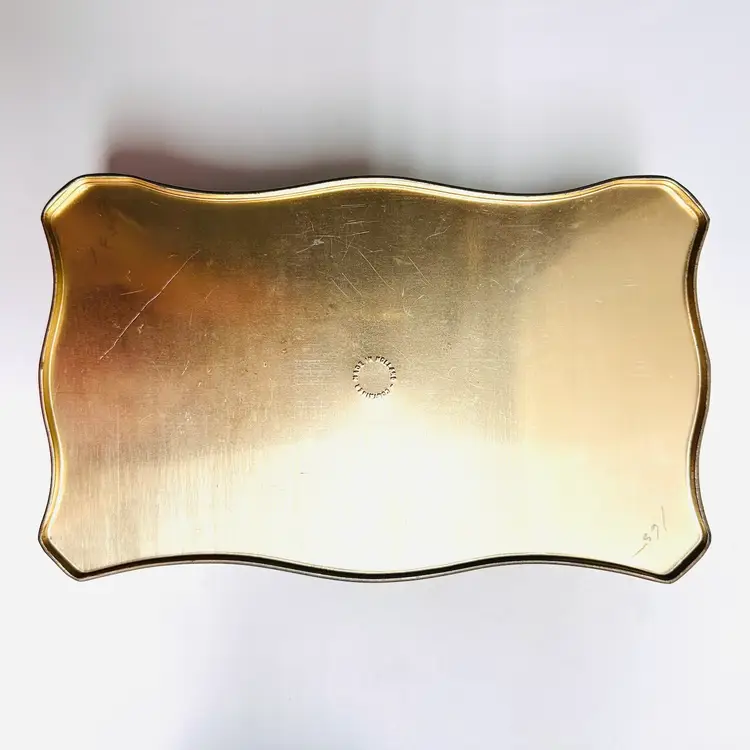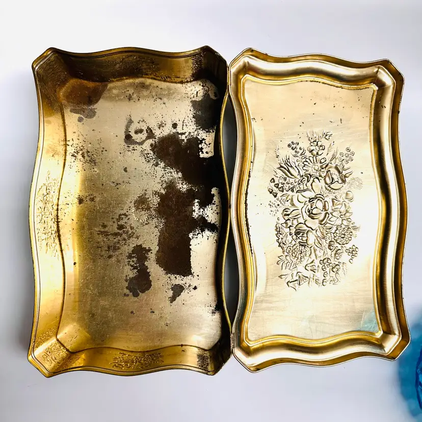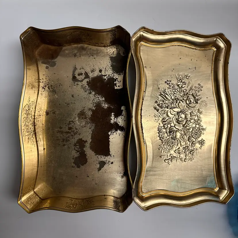 Previously owned metal tin lidded hinged rectangular box that is gold toned with brown faux crackle with embossed flower bouquets. Made in Holland. Please note that there are small scratches throughout and rust in the interior of the box (see pictures).