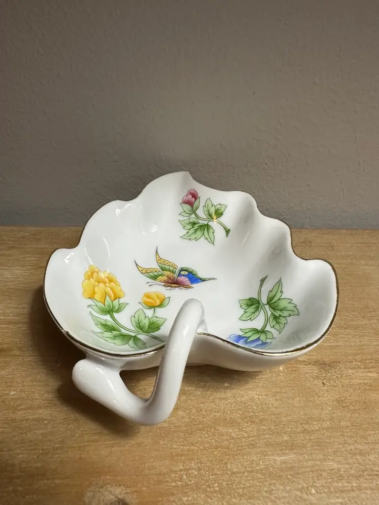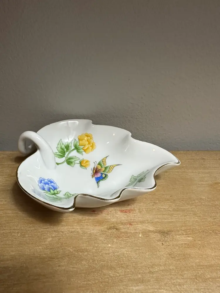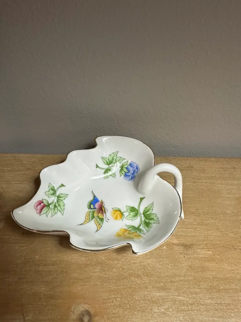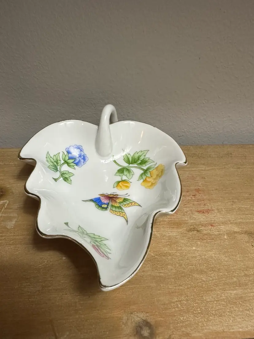 Vintage Hollohaza Hungary Porcelain Hand Painted Leaf Dish with Gold Trim Beautiful Floral design with butterfly Approximately 5.5” L x 4.25” at widest x 1.5” H In great condition, no chips or cracks