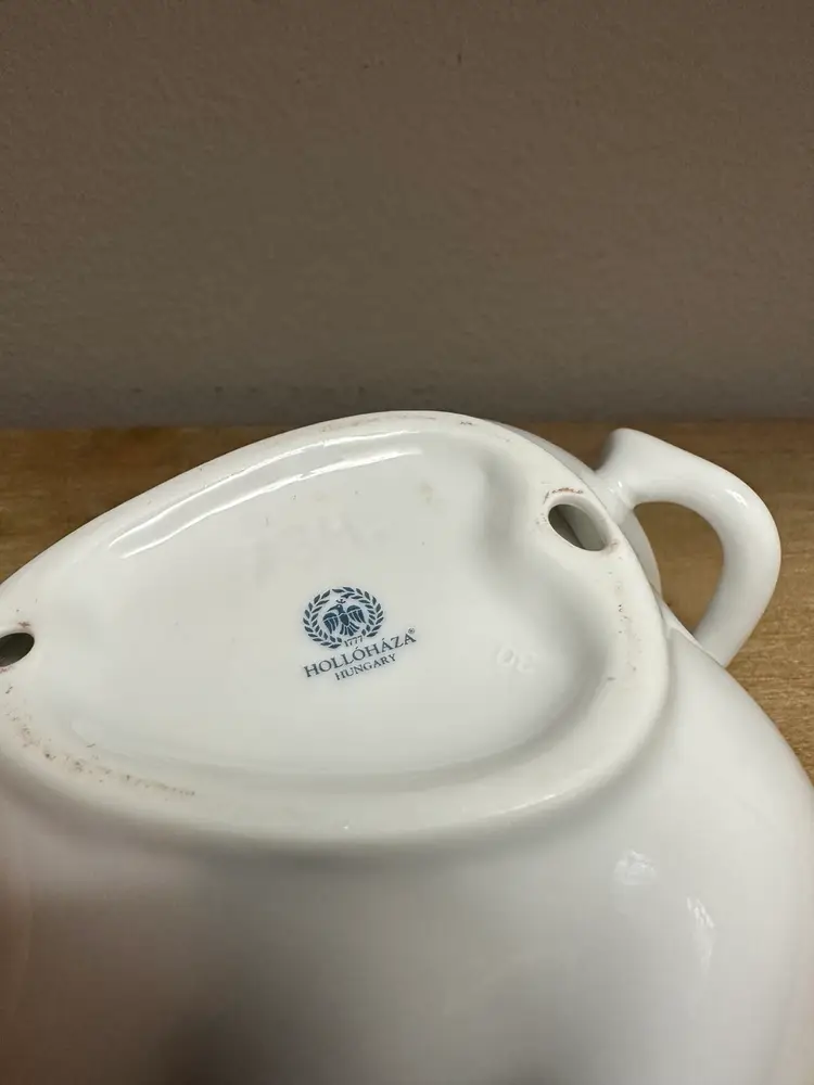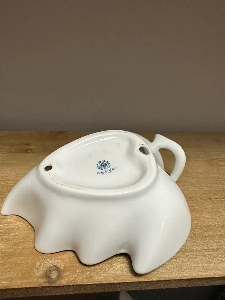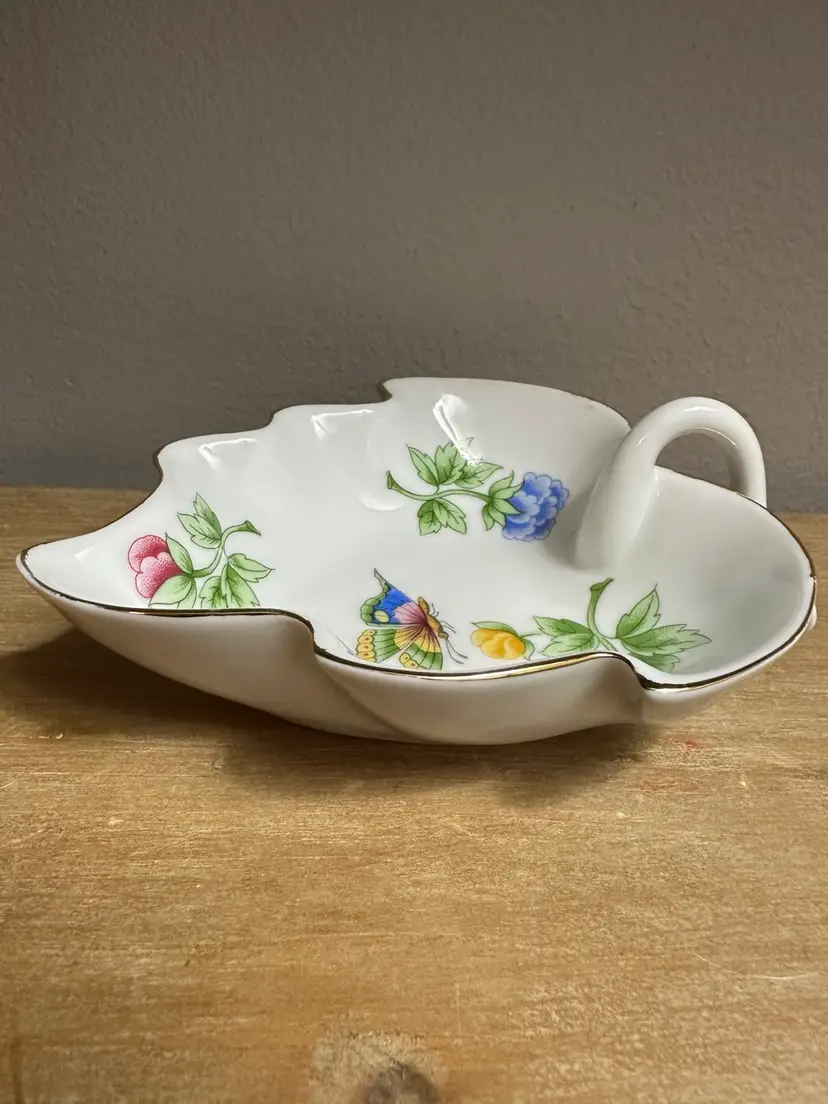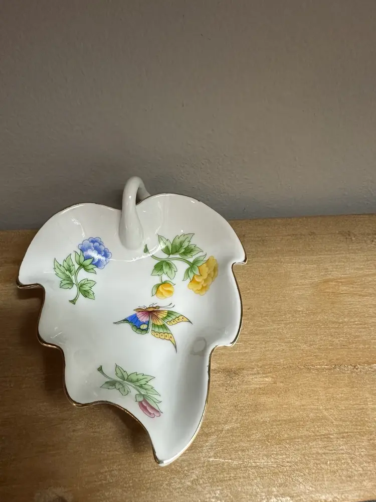 Vintage Hollohaza Hungary Porcelain Hand Painted Leaf Dish with Gold Trim Beautiful Floral design with butterfly Approximately 5.5” L x 4.25” at widest x 1.5” H In great condition, no chips or cracks