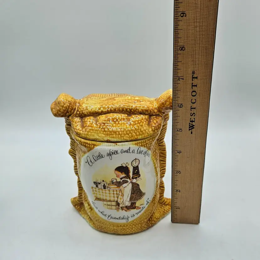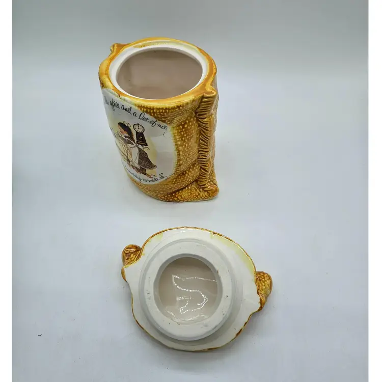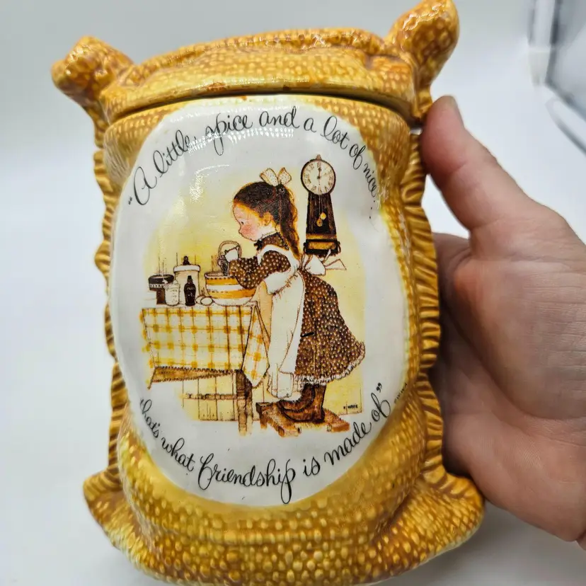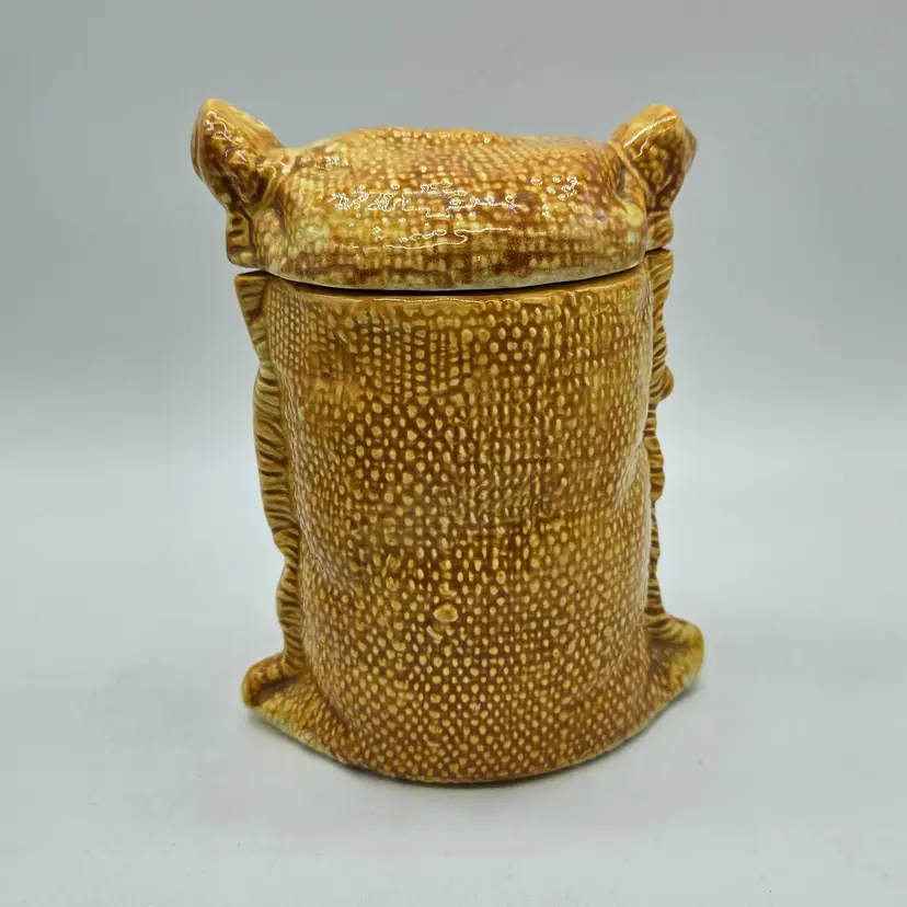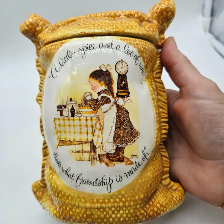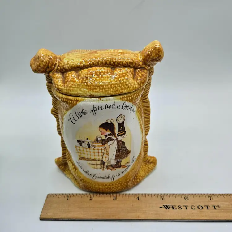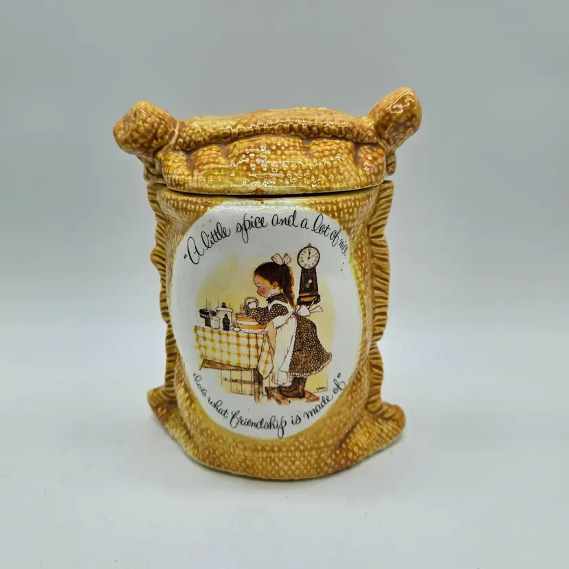 A Vintage Hollie Hobby ceramic Burlap Sack canister. Made in Japan. The makers sticker shows wear, however remains in tact on the bottom. It is approximately 6 1/2" tall and 5" wide. It is in Good, Pre-owned condition, showing some wear from age and previous use. There are 2 minor chips in the glaze, one on the top, outer edge the other on the bottom outer edge of the lid. When the lid is on the canister, they are less noticeable (pictures are shown on each area, with the lid on and lid off). There are no breaks, no cracks. See all photos of description