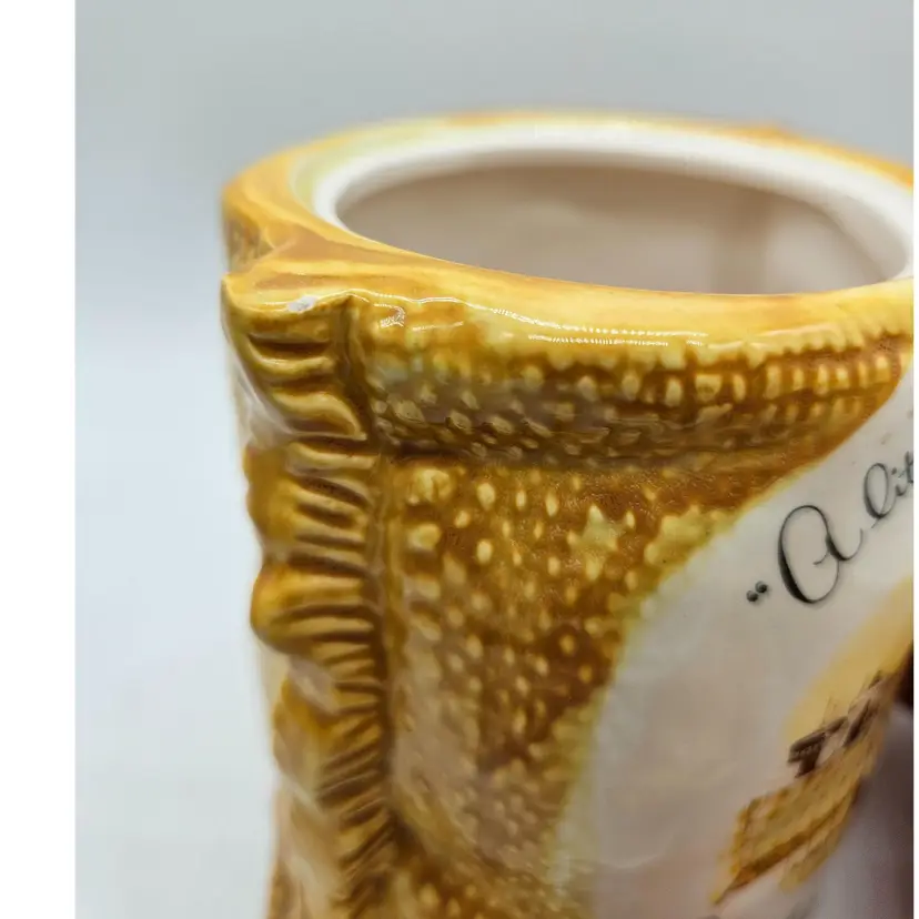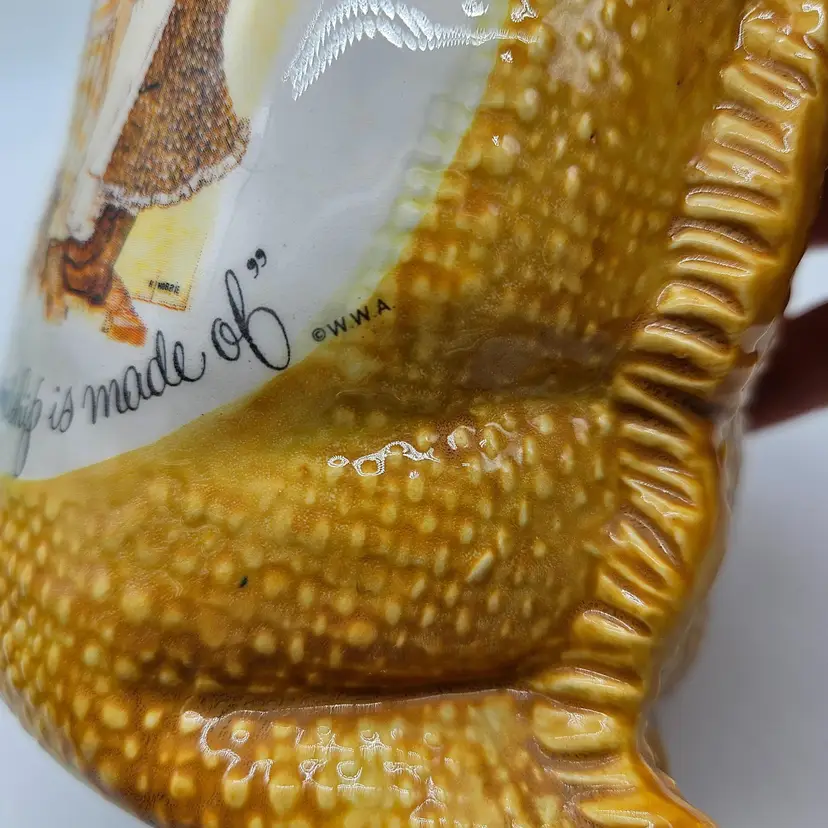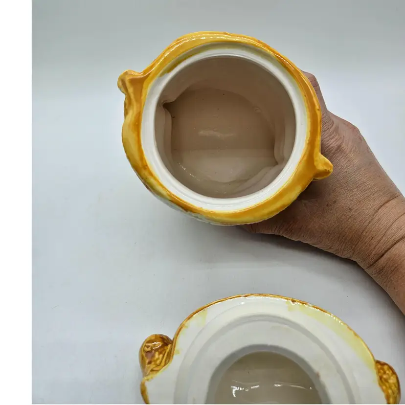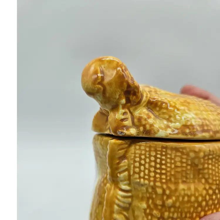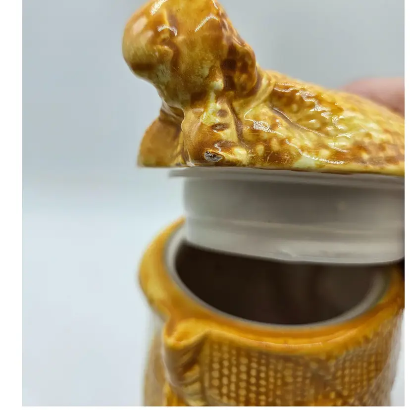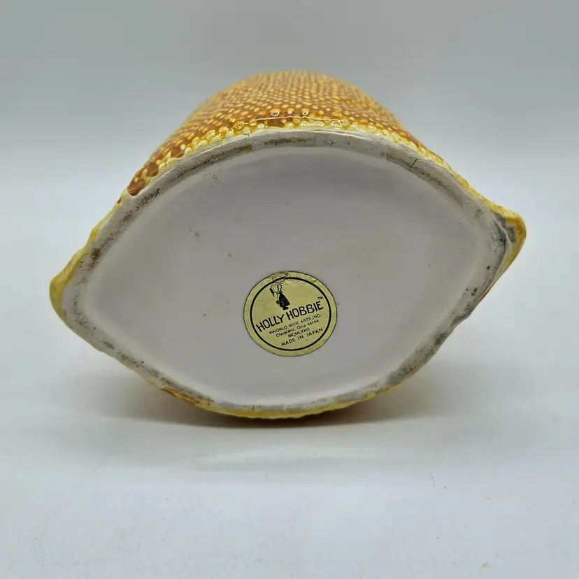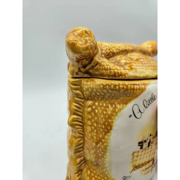 A Vintage Hollie Hobby ceramic Burlap Sack canister. Made in Japan. The makers sticker shows wear, however remains in tact on the bottom. It is approximately 6 1/2" tall and 5" wide. It is in Good, Pre-owned condition, showing some wear from age and previous use. There are 2 minor chips in the glaze, one on the top, outer edge the other on the bottom outer edge of the lid. When the lid is on the canister, they are less noticeable (pictures are shown on each area, with the lid on and lid off). There are no breaks, no cracks. See all photos of description