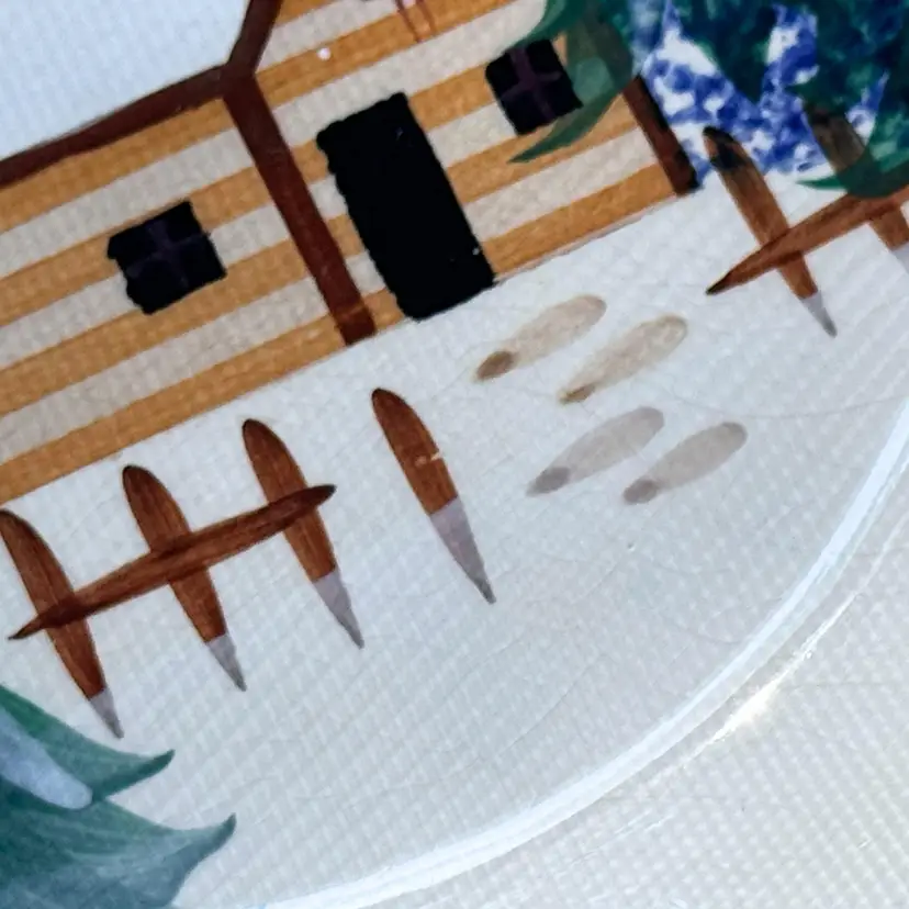 Vintage 8" Living Quarters Holly Holiday Mountain Lodge pattern plate. 8" in diameter. Shows a beautiful winter scene of a log cabin.