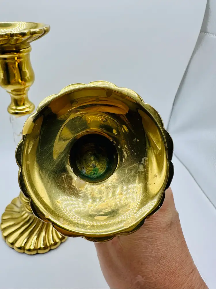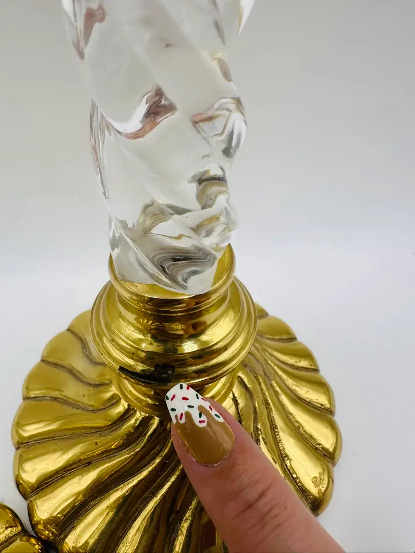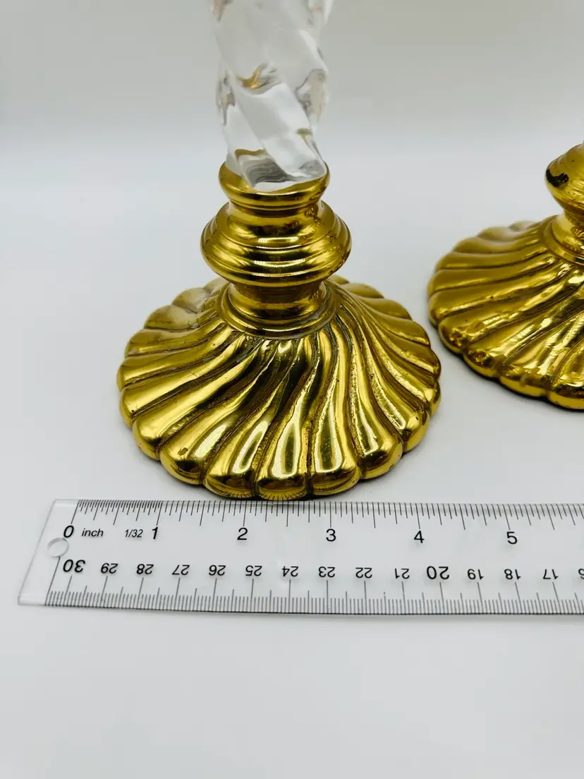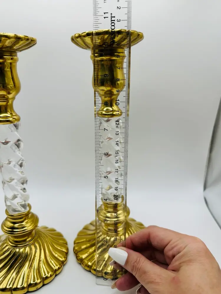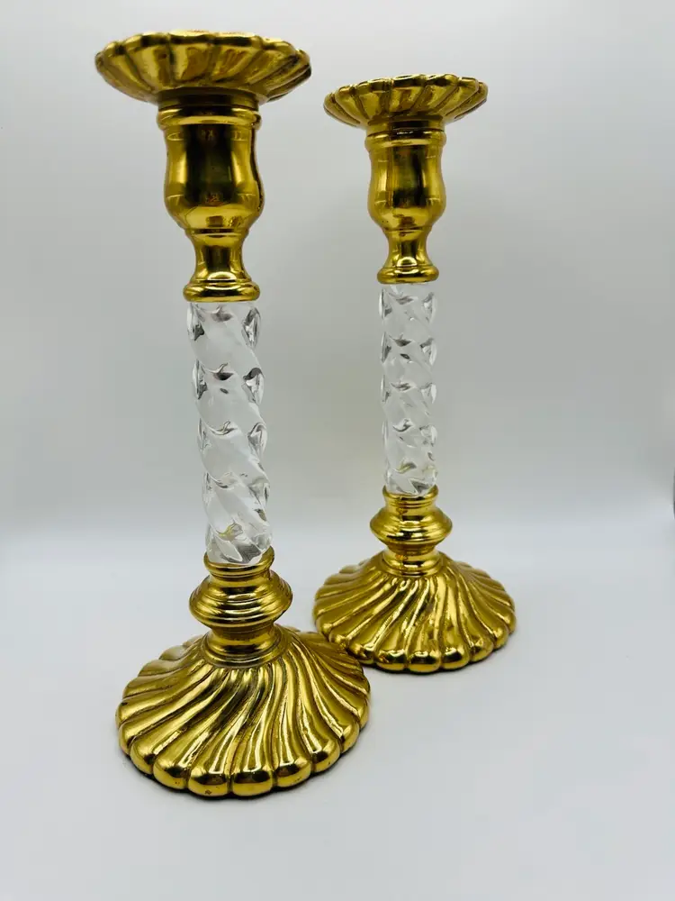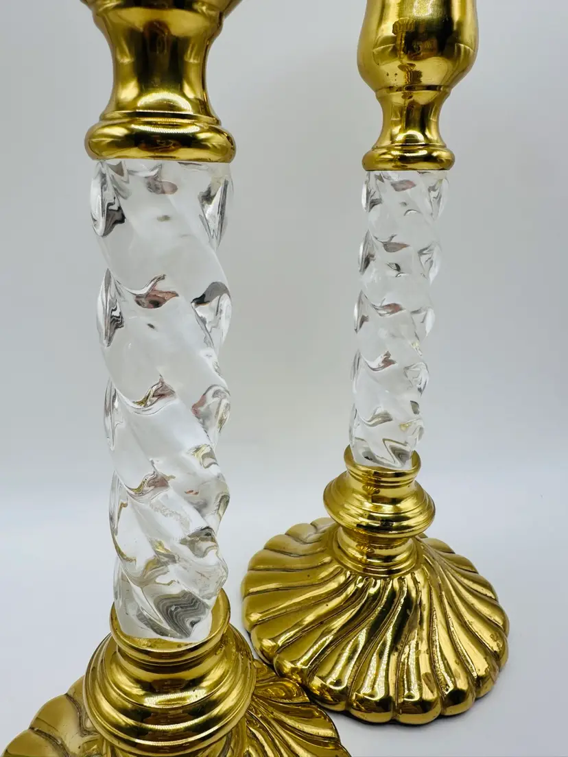 The Vintage Hollywood Regency Brass Lucite Spiral Candlestick Candle Holders by Decorative Crafts are elegant and stylish additions to any home decor. These candle holders stand at 11" tall and are made of antique brass with a clear lucite spiral design, adding a touch of Hollywood glamour to any room. The combination of gold and clear colors, along with the Hollywood Regency style, makes these candle holders a perfect statement piece for those who appreciate vintage charm and sophistication.