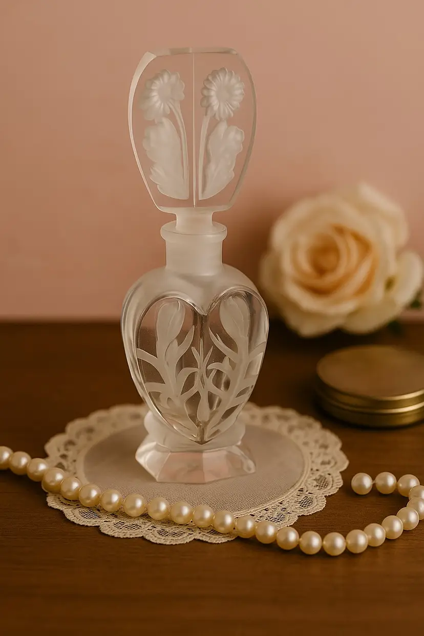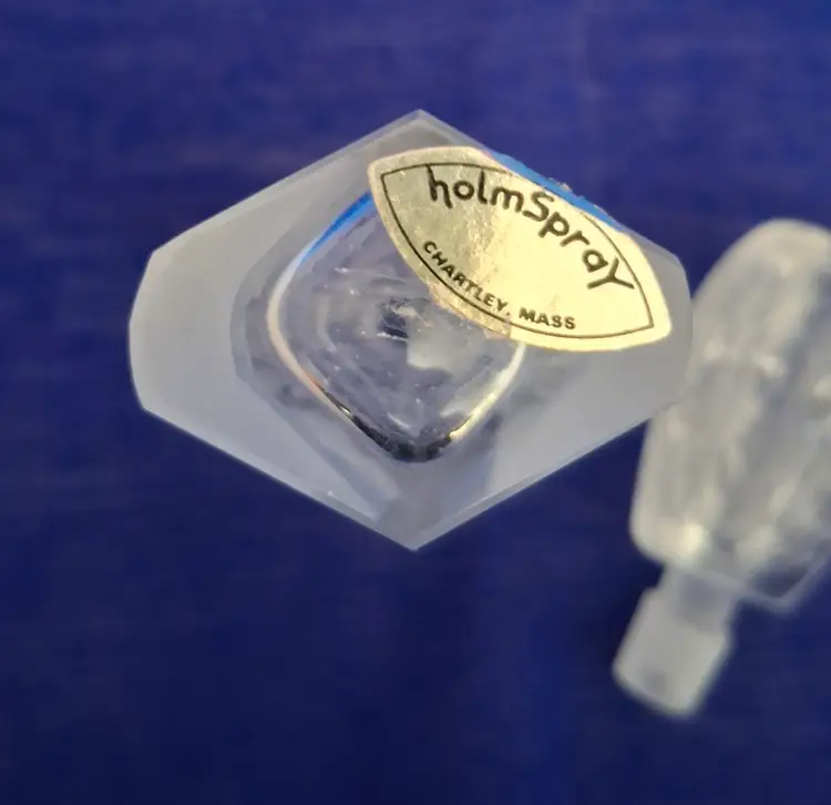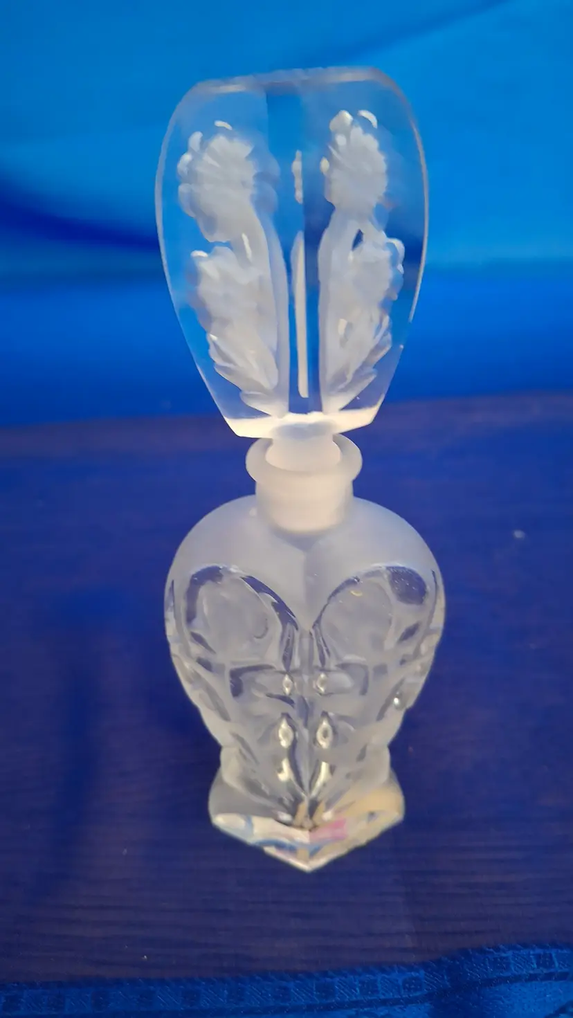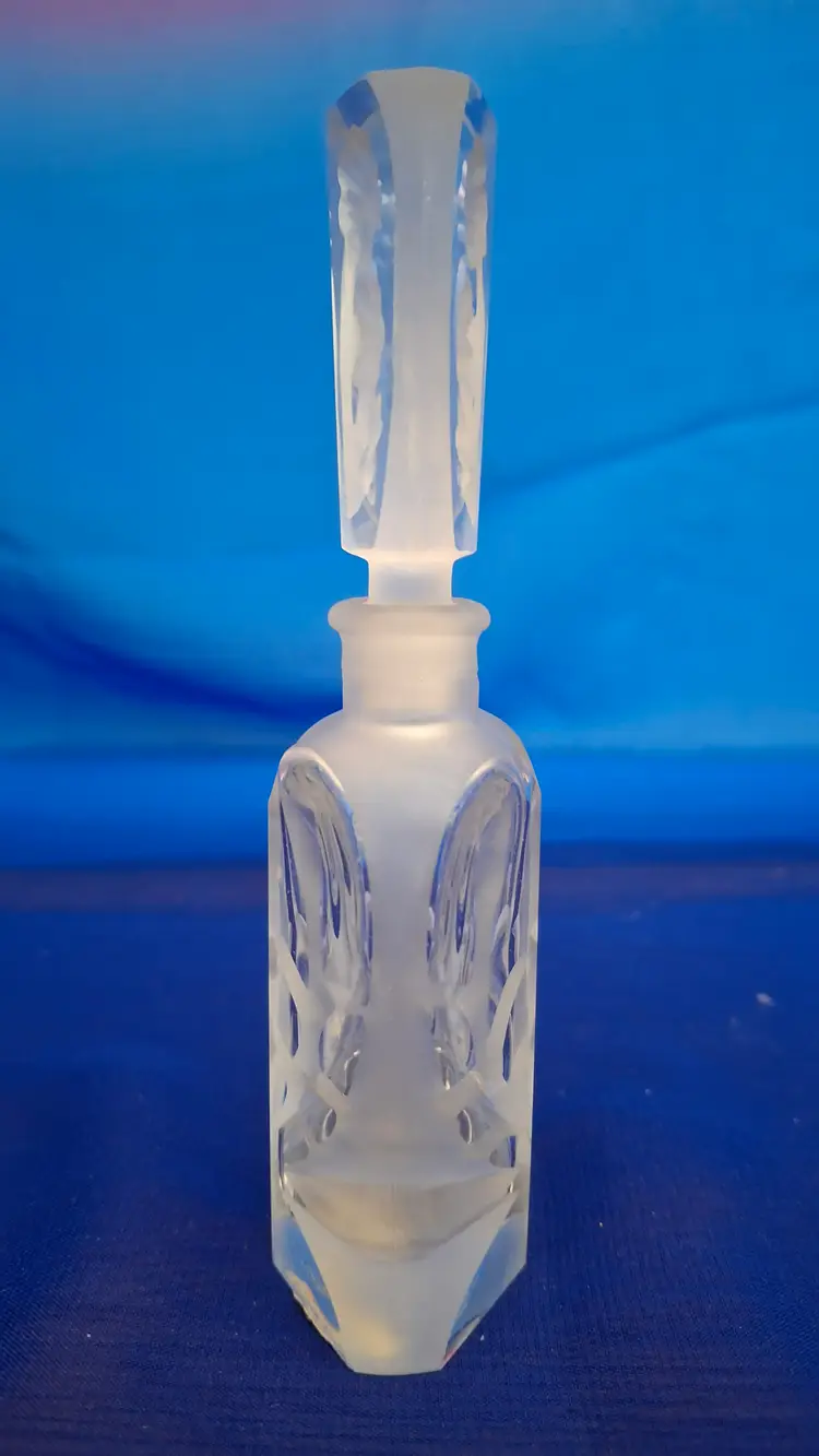 Vintage HolmSpray Crystal Perfume Bottle – Frosted Floral Stopper – 5.5" Vanity Décor Lovely vintage HolmSpray crystal perfume bottle with beautifully molded frosted floral designs. The heavy clear and frosted glass bottle features stylized flowers and leaves on the body and a matching faceted stopper with raised floral sprays on each side. Classic mid-century Bohemian/Czech-style crystal, sold in the U.S. by HolmSpray of Charley, Massachusetts. A gorgeous piece of vanity decor and a nice addition to any perfume bottle or crystal collection. Details • Height: approx. 5½ inches with stopper • Width: approx. 2 inches at the widest point • Clear and frosted crystal with molded floral design • Faceted floral stopper with ground plug • Original HolmSpray – Charley, Mass paper label on base • No chips or cracks noted; light vintage wear and a few tiny bubbles from manufacture • Bottle is empty; for decorative use only Perfect for a vintage vanity tray, bathroom shelf, or as a special gift for a perfume bottle collector.