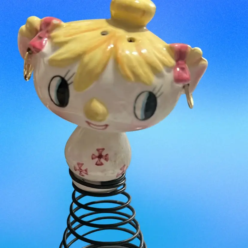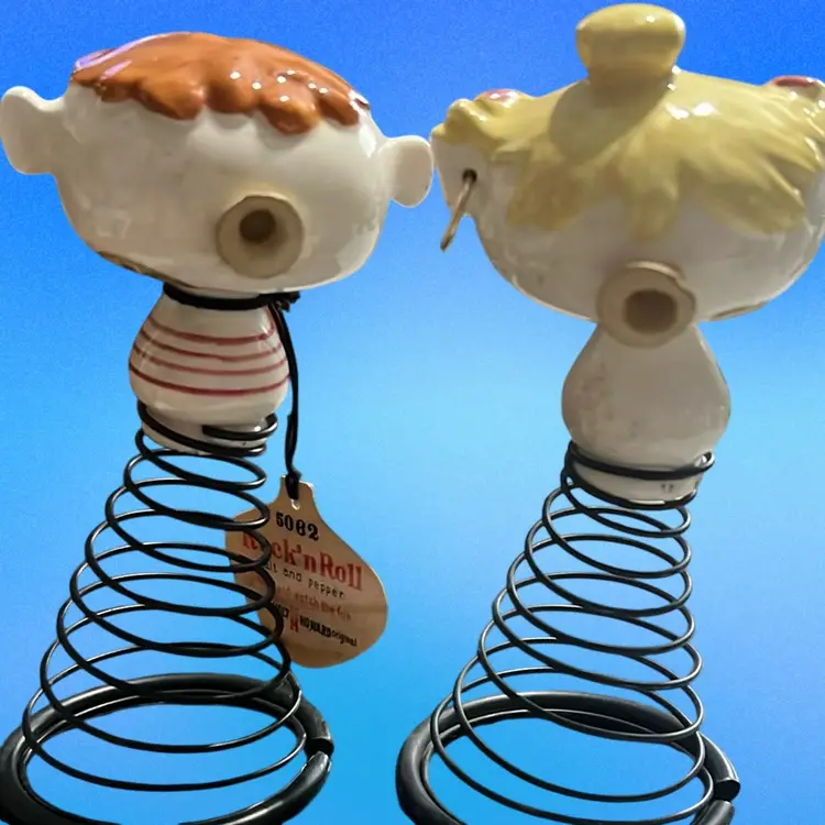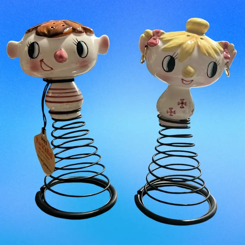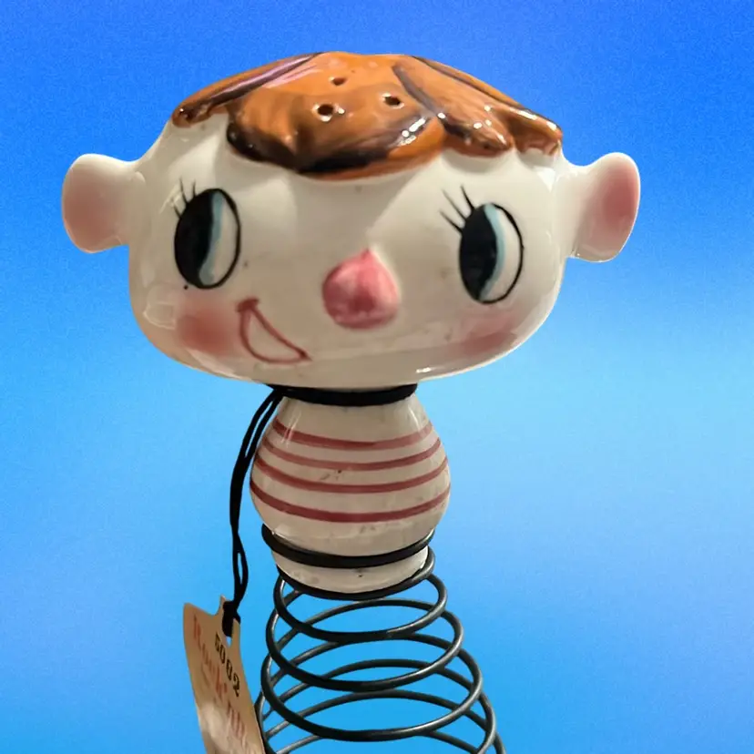 The "Rock N' Roll Kids" line, or similar playful character designs, are representative of Holt Howard's output during the late 1950s and early 1960s. These pieces often featured exaggerated features, bright colors, and charming, sometimes quirky, expressions. The spring-loaded design adds an element of novelty and movement, making them particularly appealing as decorative and functional kitchenware collectibles.