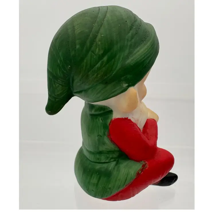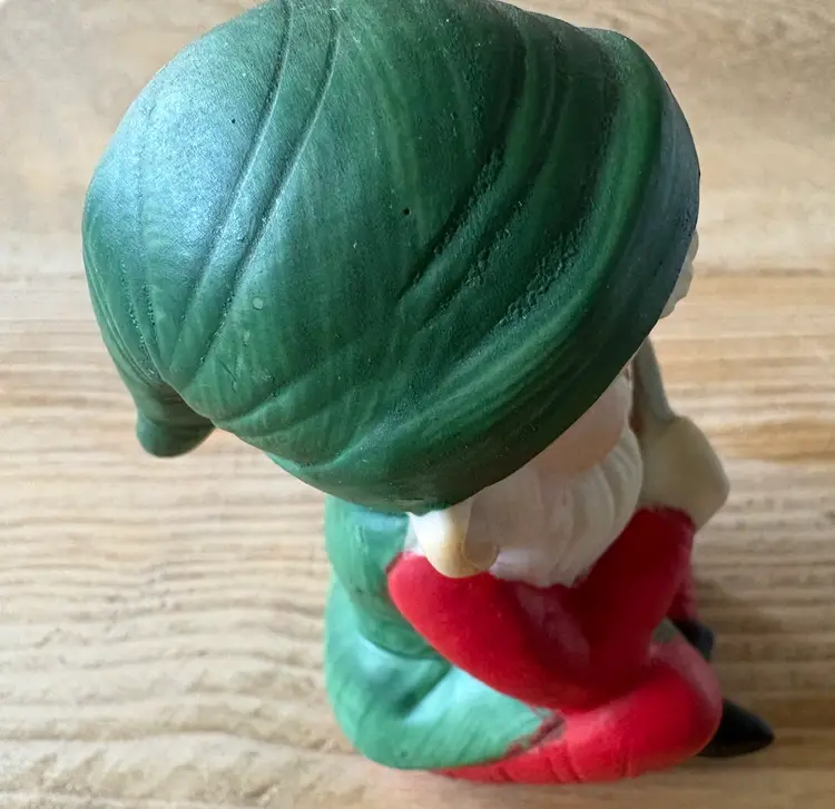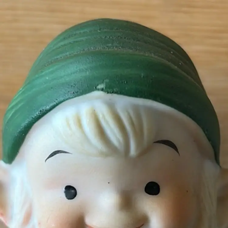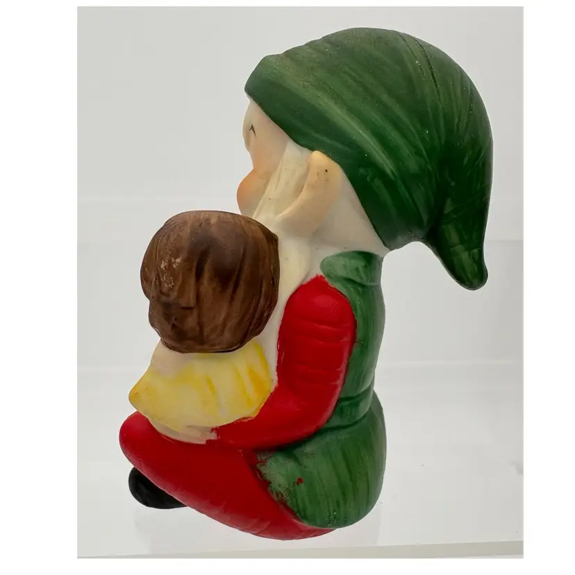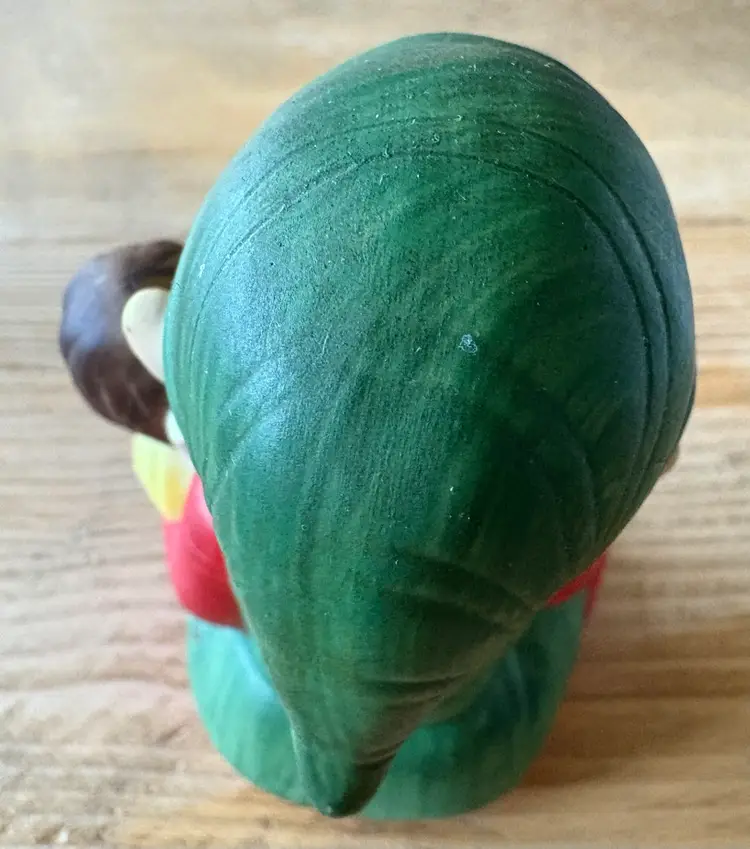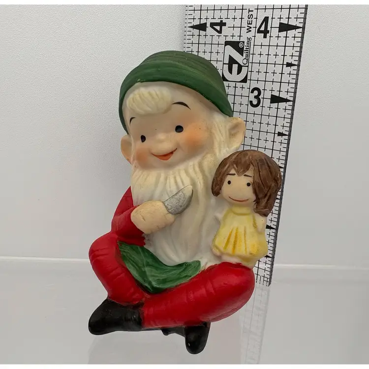 3 1/2”H x 2 1/4”W This is the bigger version of the two sizes that I’ve seen. No chips, cracks, or crazing. The red paint is a little sloppy. A little flaw in the green paint just above the elf’s bangs. Please review images.