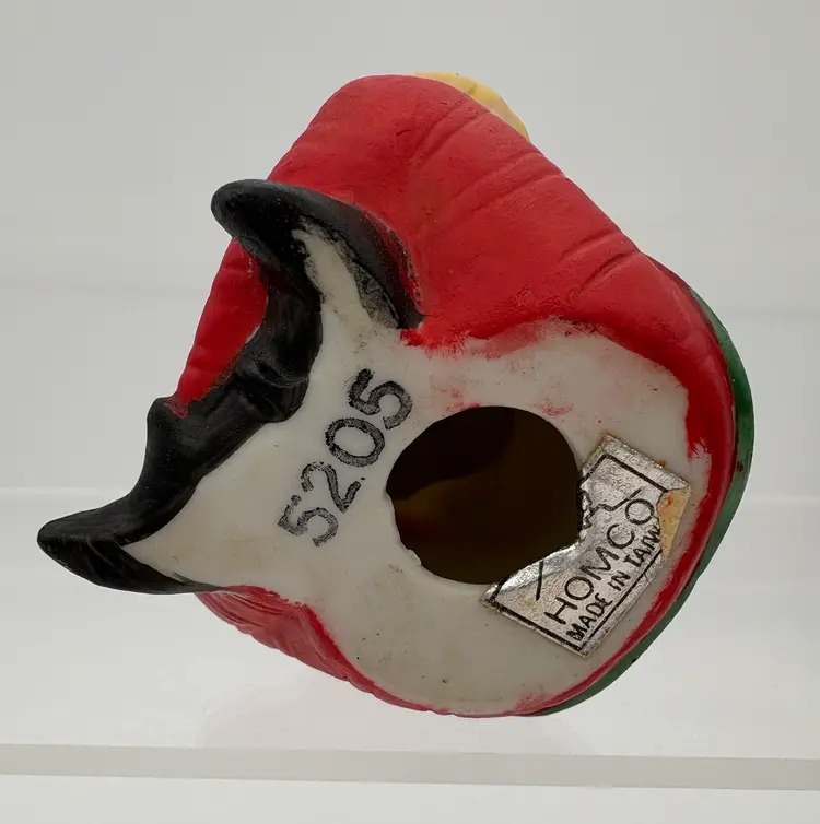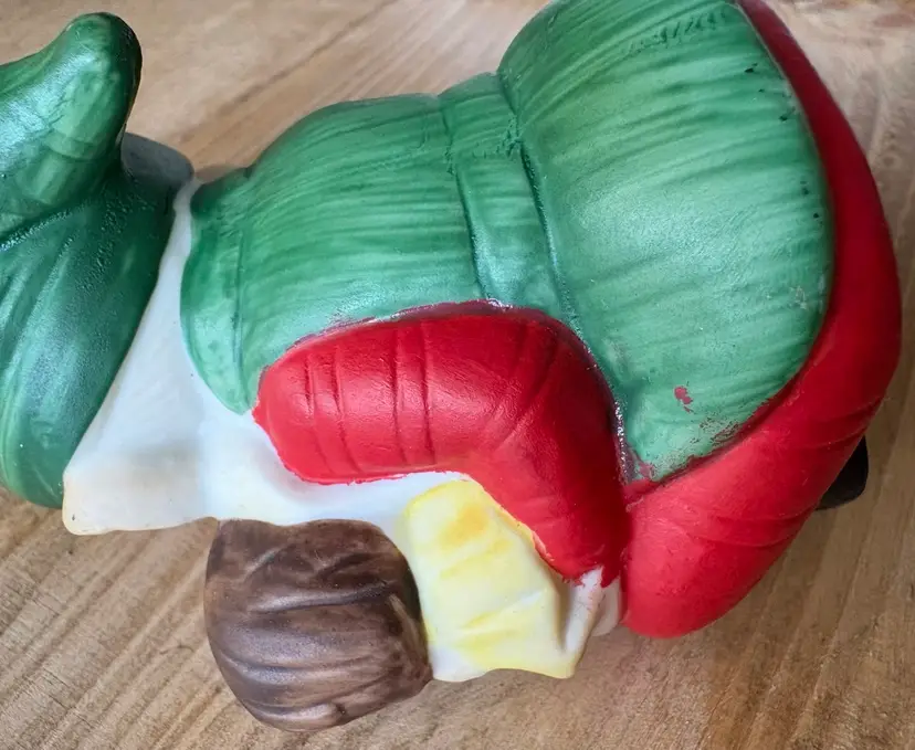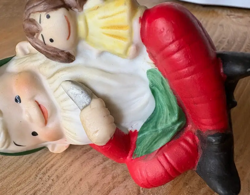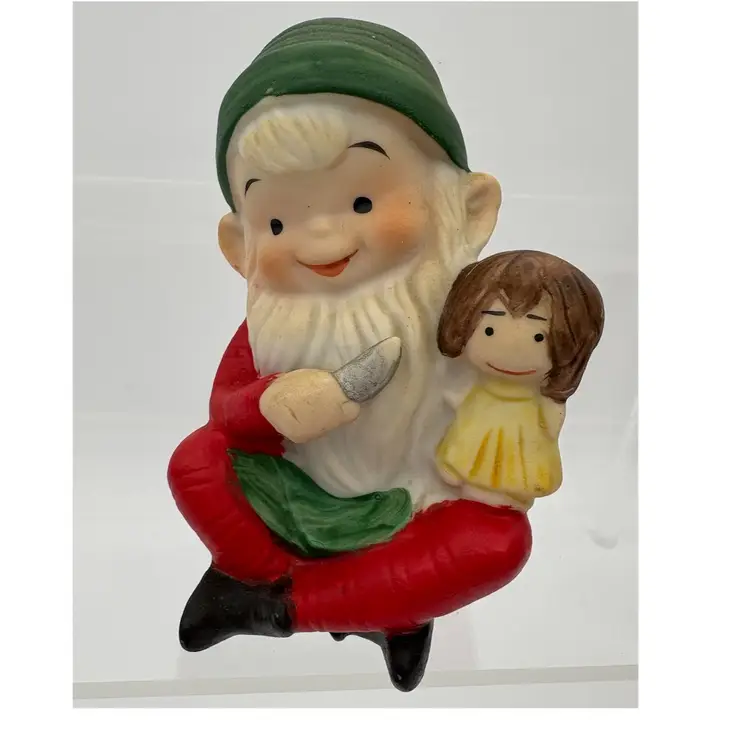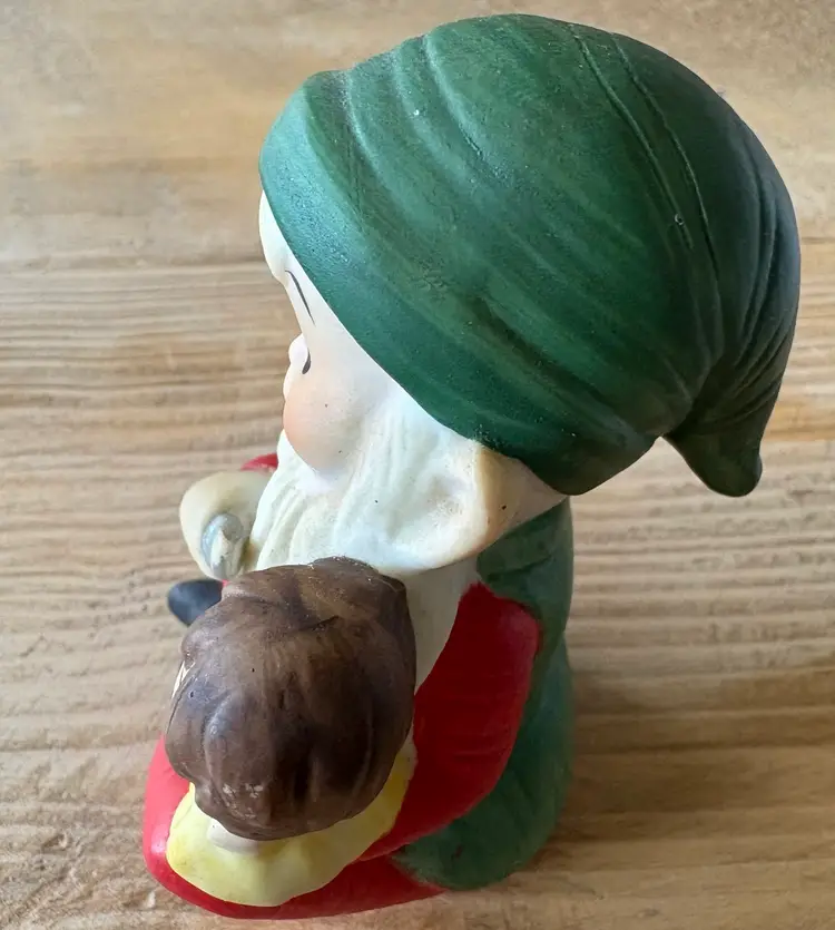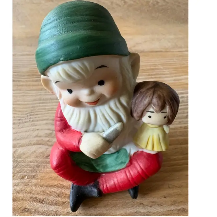 3 1/2”H x 2 1/4”W This is the bigger version of the two sizes that I’ve seen. No chips, cracks, or crazing. The red paint is a little sloppy. A little flaw in the green paint just above the elf’s bangs. Please review images.