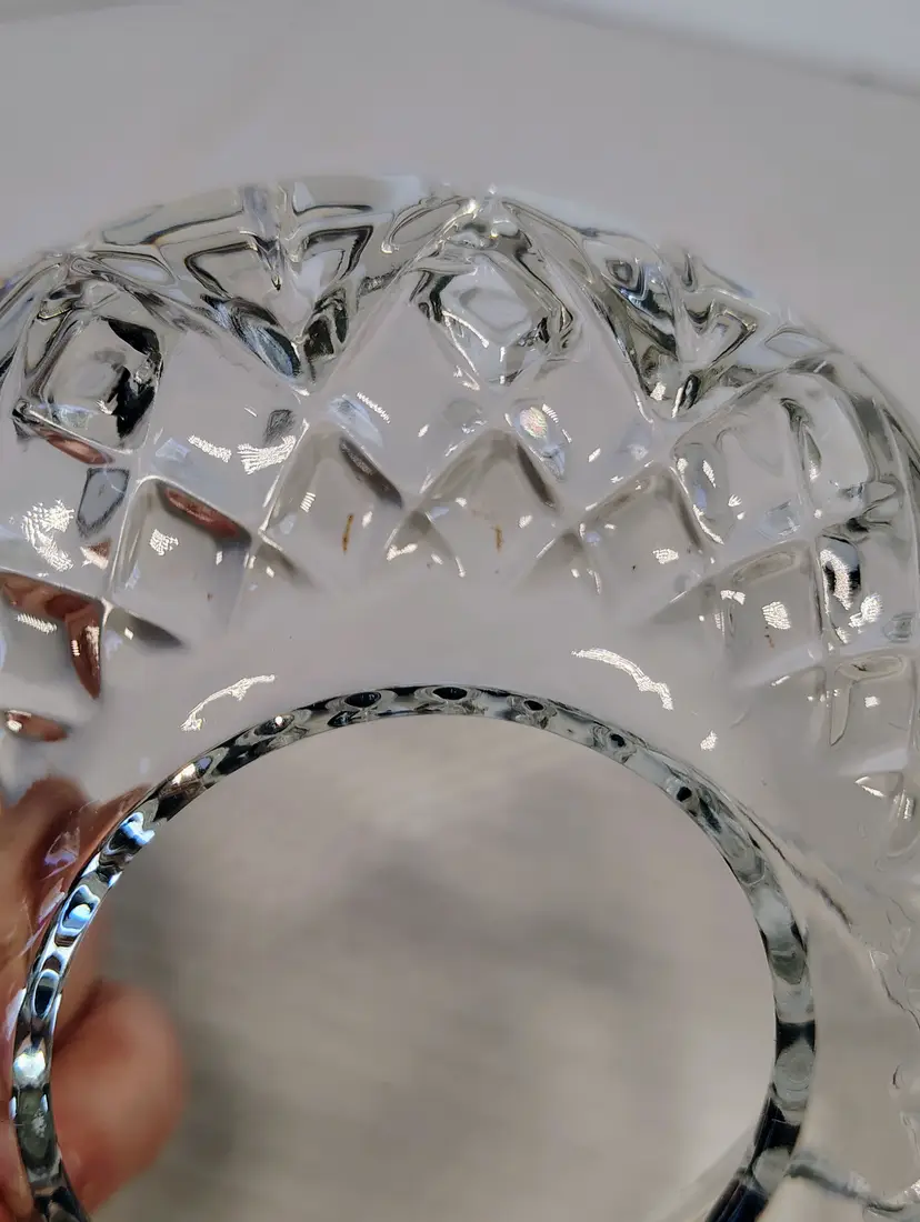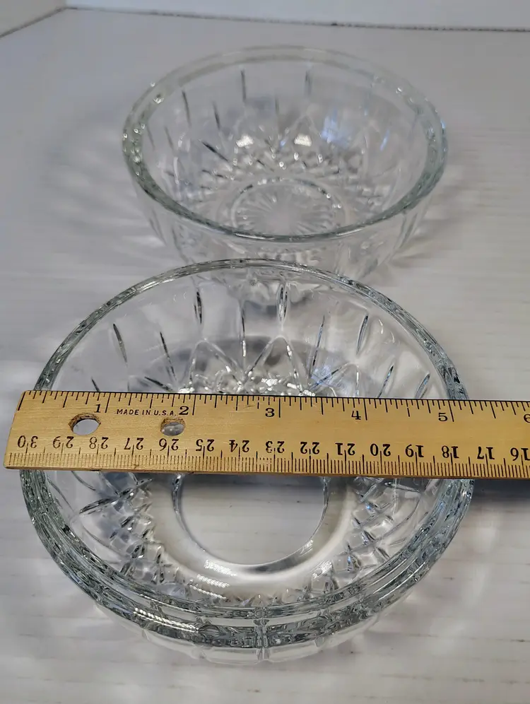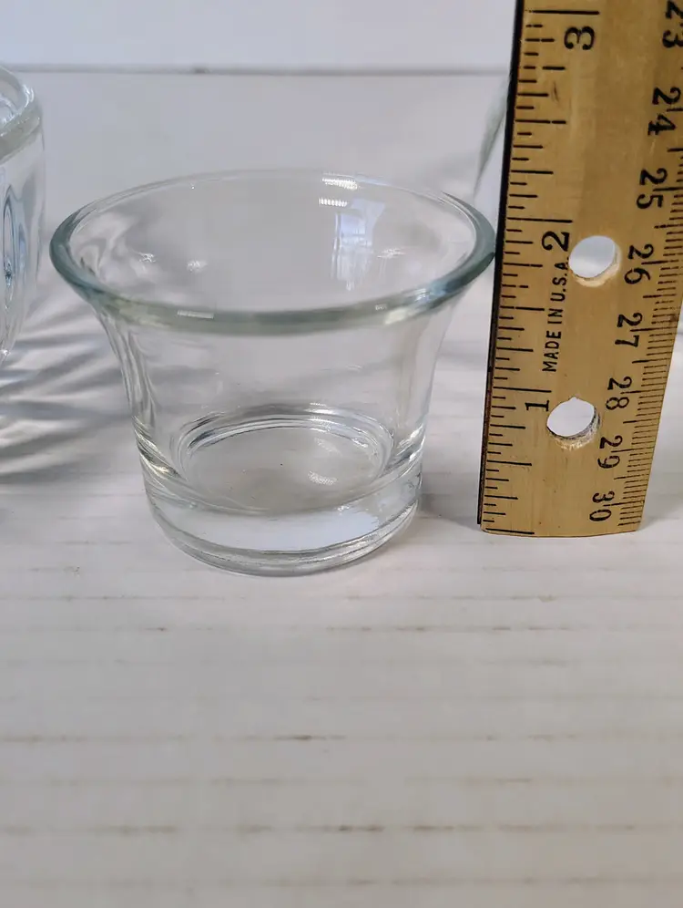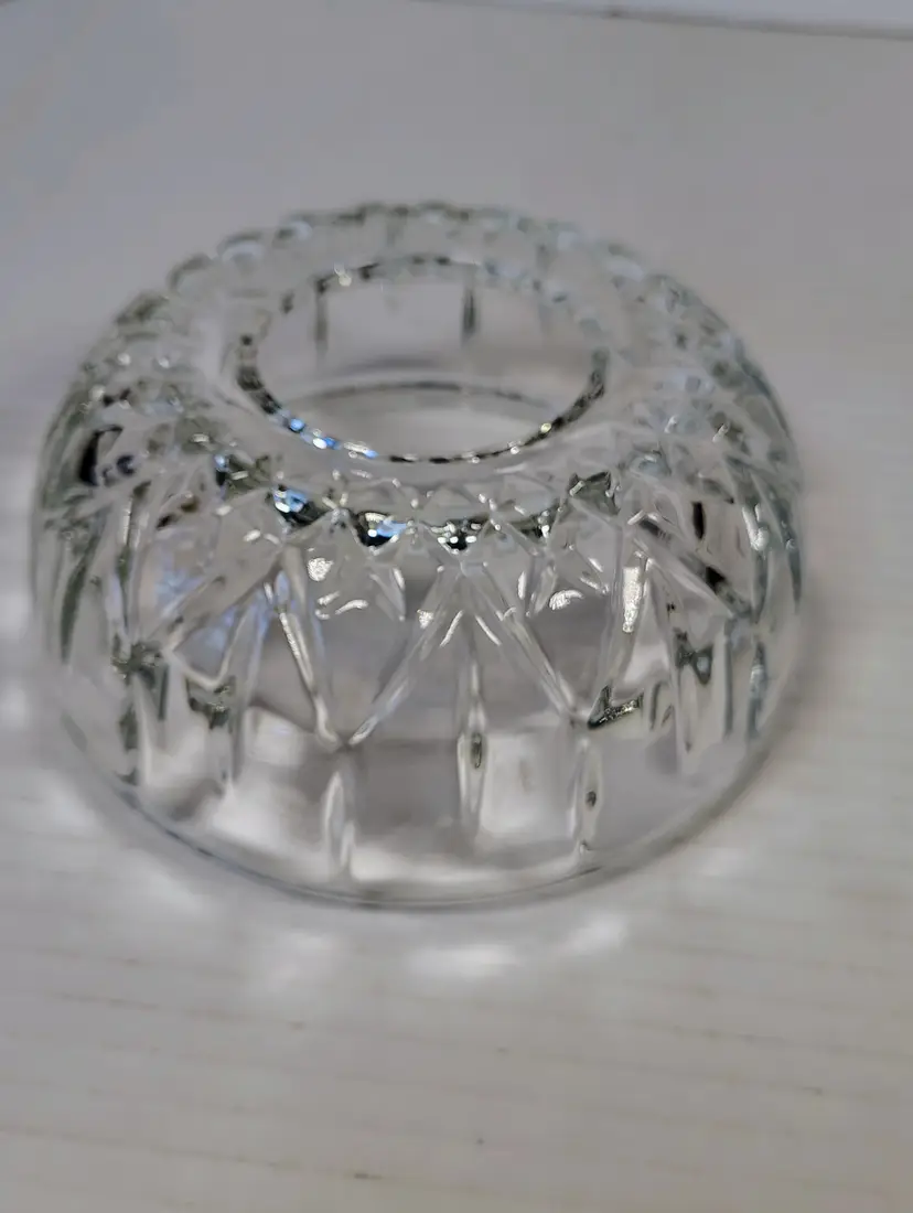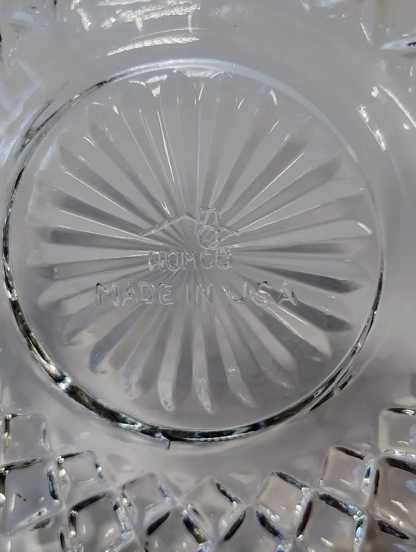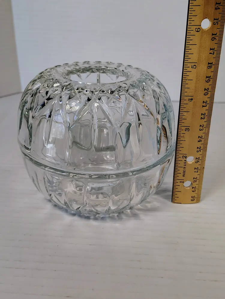 This is a Homco clear glass fairy lamp. It's three pieces, top, bottom, and tea light / votive holder. Made in USA. There are a few small dark marks in the glass, I've shown them in the pictures. No chips or cracks. It's approximately 4.75 inches tall and about 5.25 inches wide. Thanks for looking. Please see pictures for details.