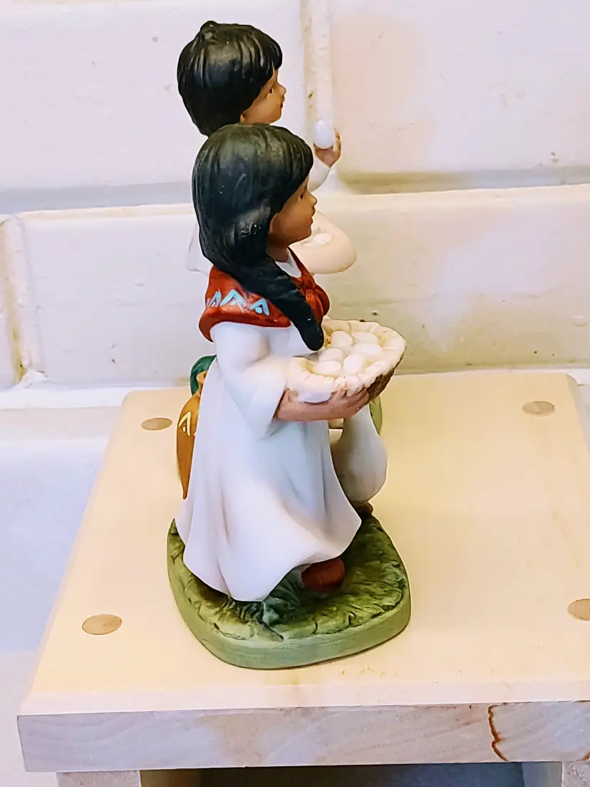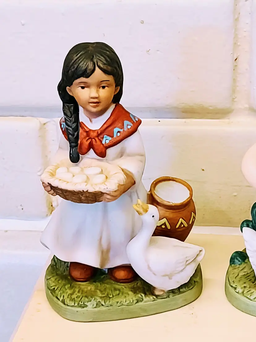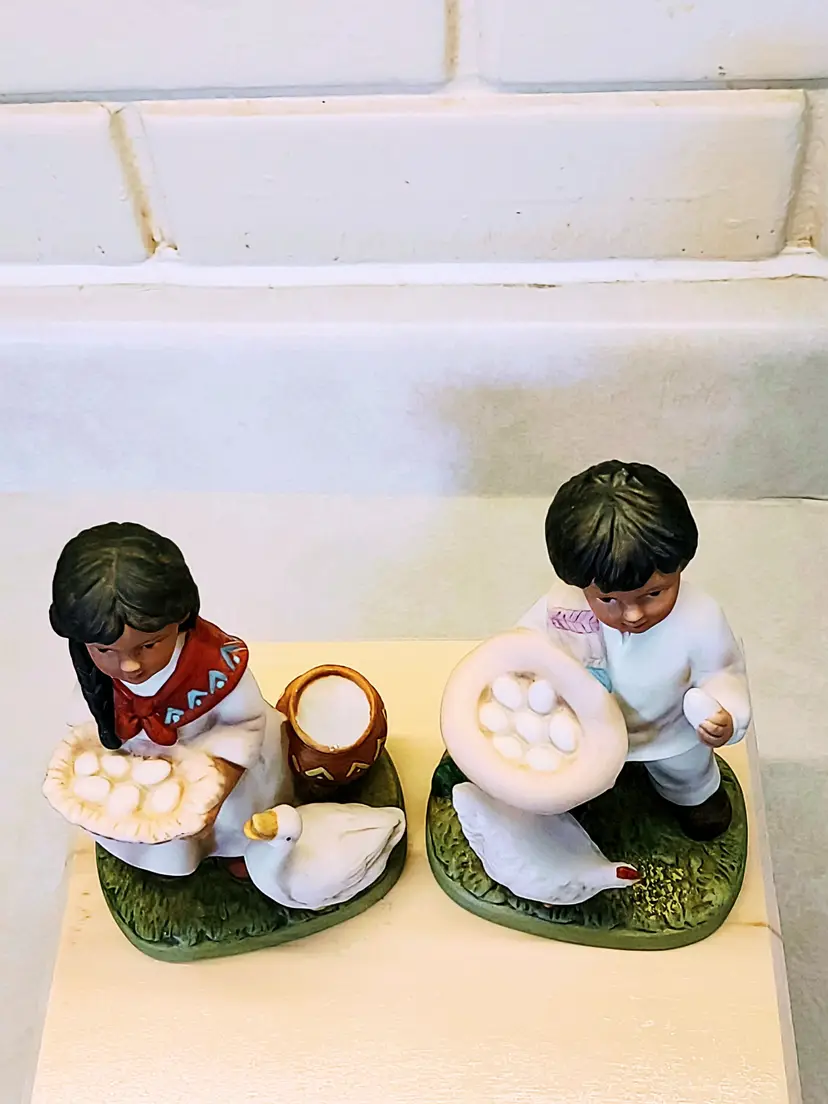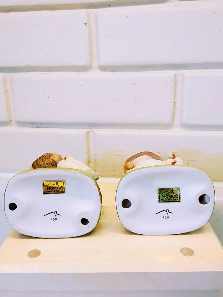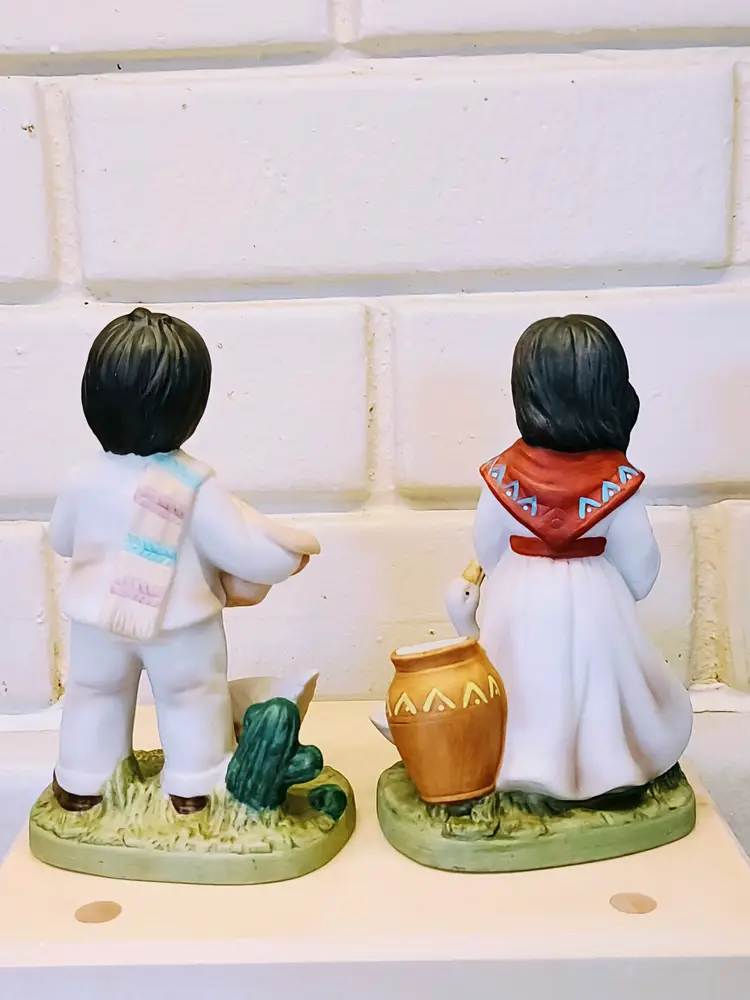 This vintage Homco figurine set #1409 features a Southwestern girl and boy design from 1980. Handmade with a 3D effect, these small figurines are painted in multicolor ceramic. The Southwestern style and all-occasion theme make them suitable for any room in the house. With a height of 5 inches and a width of 3 inches, these collectible pieces are a charming addition to any decorative display, especially for those who appreciate farm children and Southwest-inspired decor.
