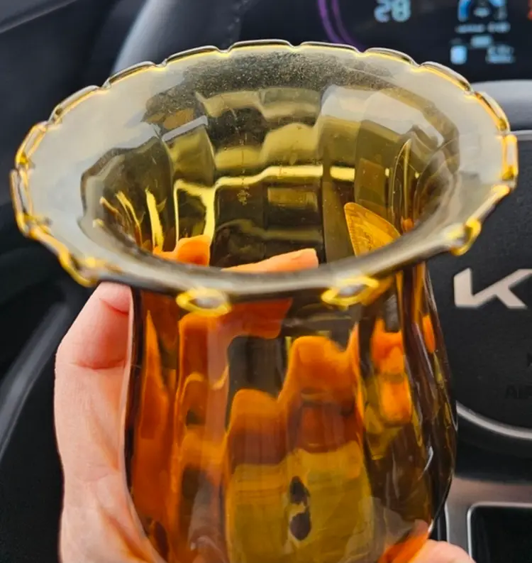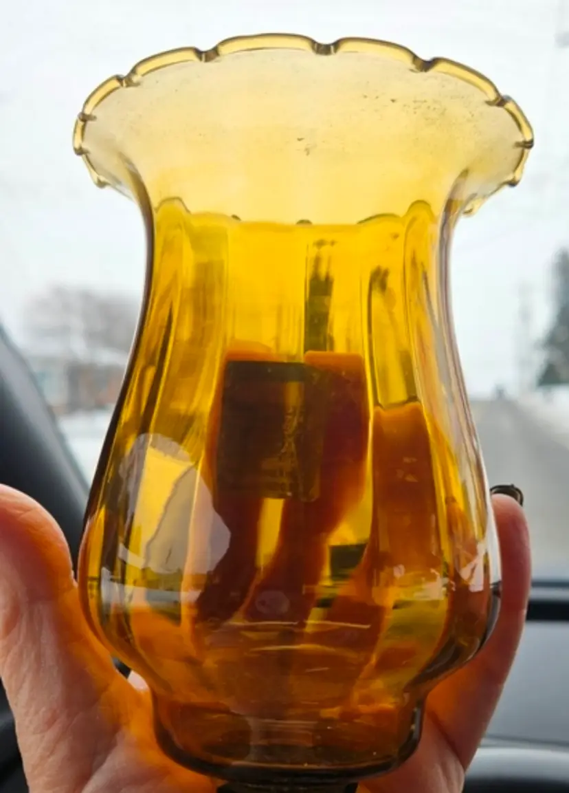 Brighten up your space with these vintage amber glass votive holders featuring a charming tulip shape. Perfect for adding a warm glow to any room.
