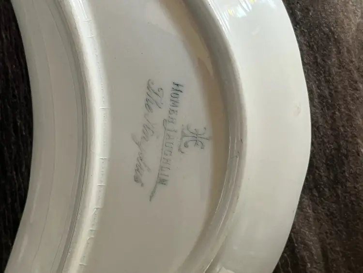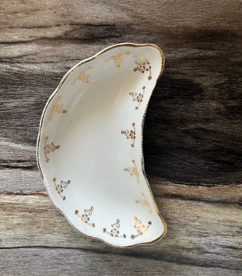 A vintage Homer Laughlin porcelain gold rimmed moon shape bone dish. Approximately 6 1/2 inches tall, 3 1/4 inches wide and 1 inch tall. Some crazing. Please see the photos. It could still be used for bones but also as a trinket dish.