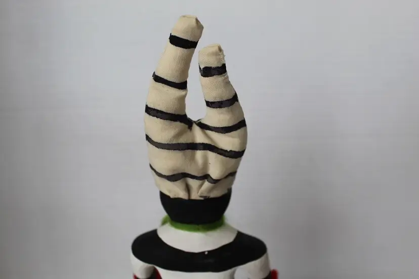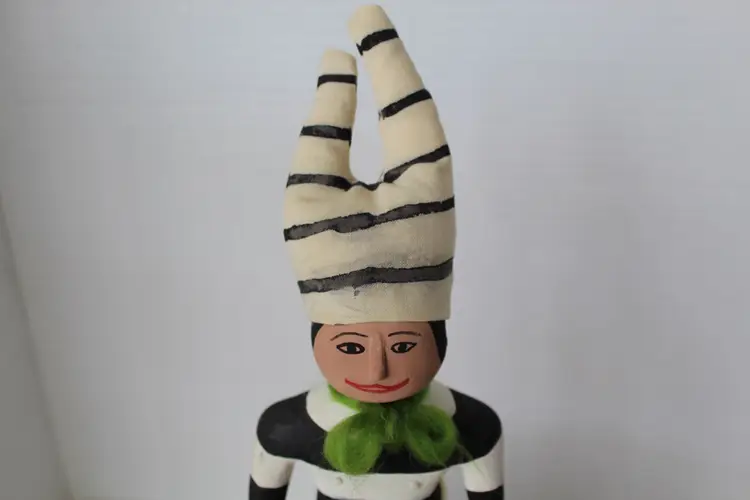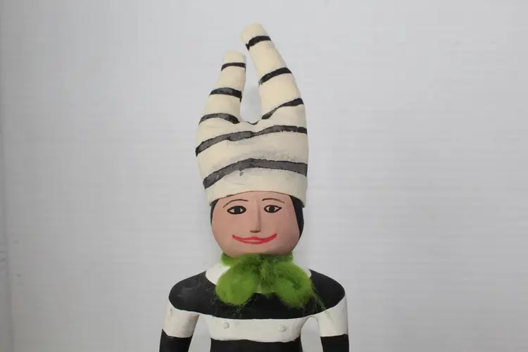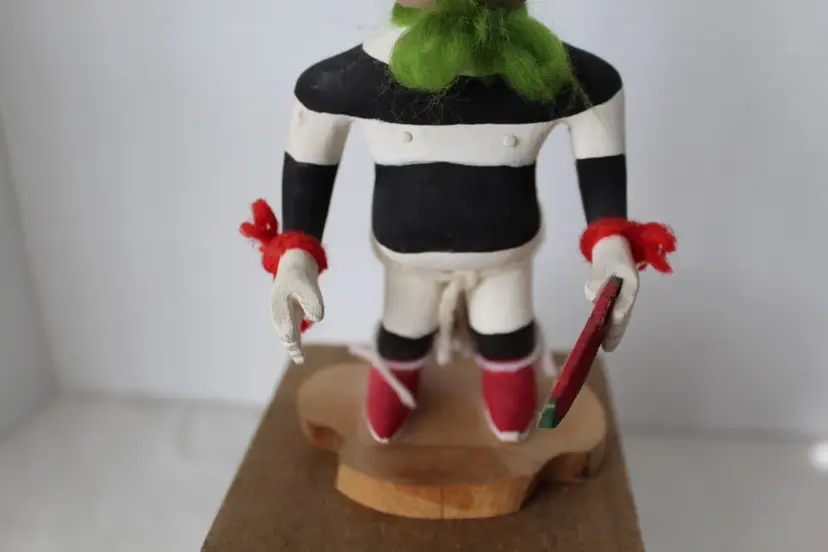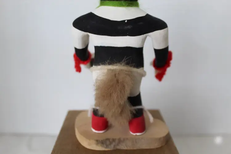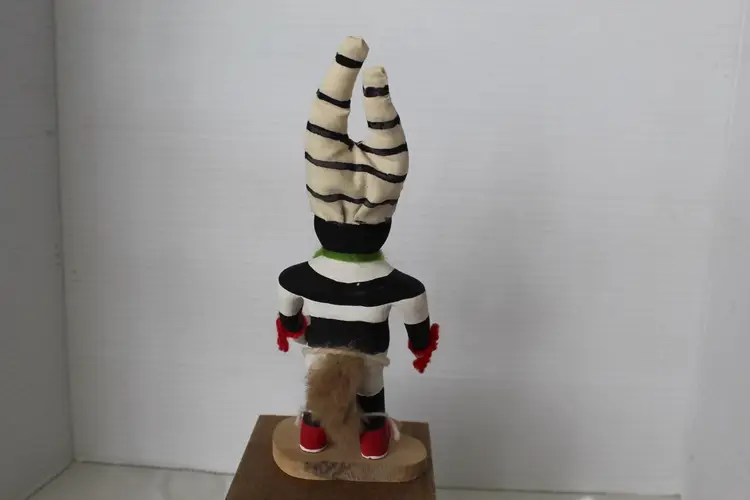 This hand-carved and painted cottonwood root figure depicts the Koshare (Hano Clown) Katsina, a sacred Hopi/Pueblo figure known for gluttony and humor, featured with iconic black and white stripes and holding a watermelon slice. The piece includes traditional yarn and fur accents and is mounted on a natural wooden base. Makers mark on bottom (see photos) but was unable to identify actual maker. It weighs 2.8 oz and is 9.75 in high. The base measures 3 1/8 x 2 3/8 inches.