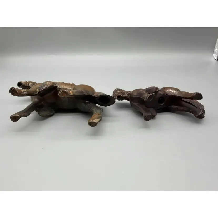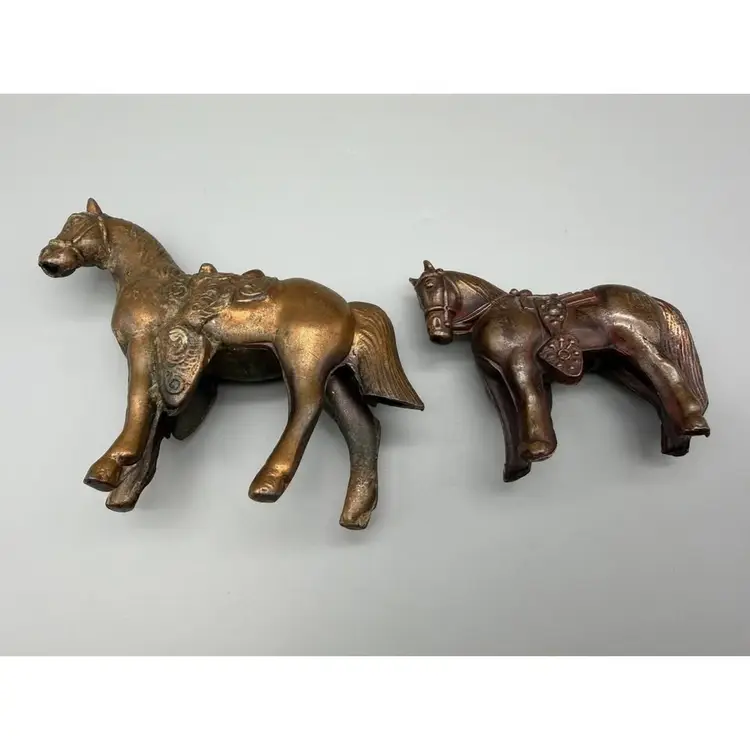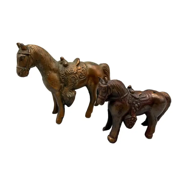 A charming set of two vintage Pot metal horse figurines, crafted with a bronze-tone finish and intricate detailing. Each horse is depicted with a saddle and bridle, showcasing a classic equestrian theme. These pieces feature a lovely patina that adds to their antique aesthetic, making them perfect for collectors or as decorative accents in any room. Ideal for a study, living room, or office, these statues add a touch of classic elegance. Please examine all photos for condition.