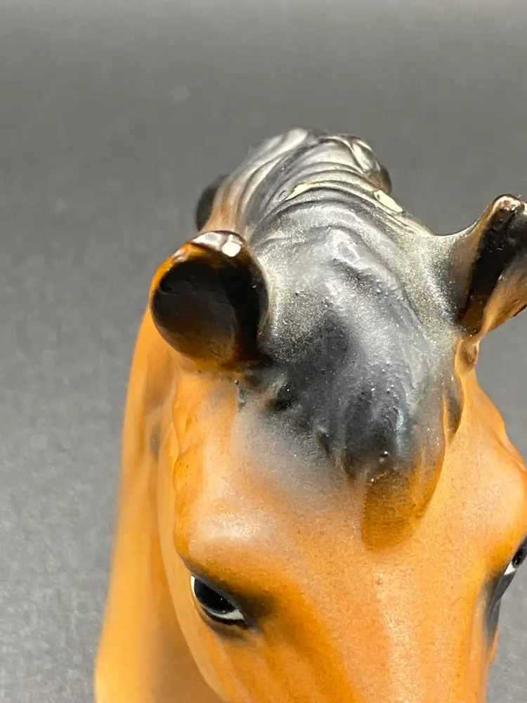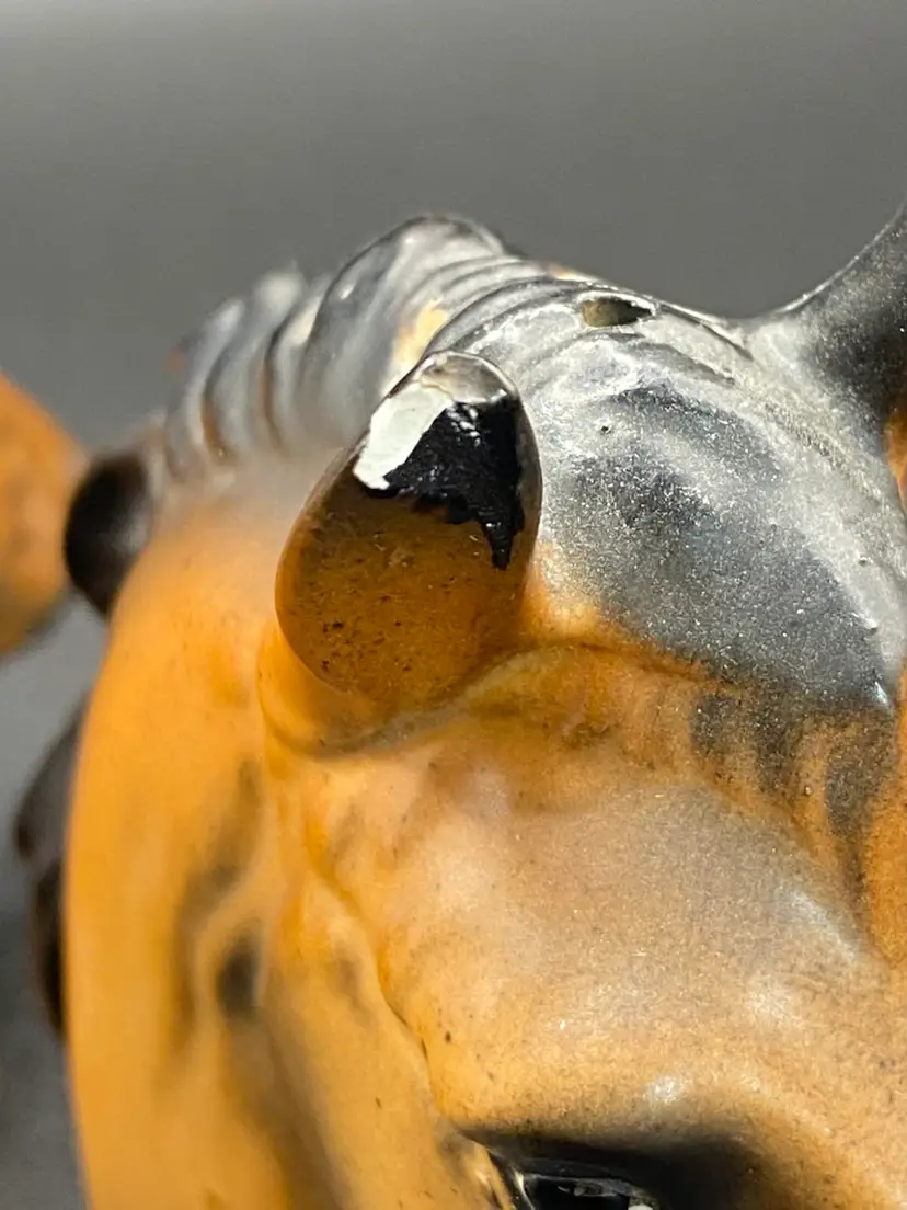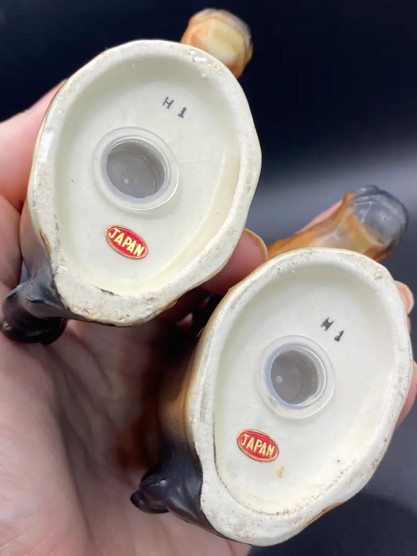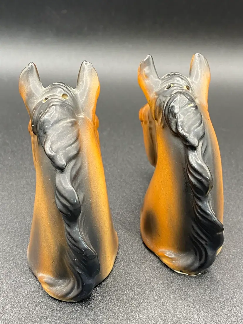Vintage, horse head salt and pepper shakers. These stands approximately 3 inches tall. The original plugs are still intact, the original Japan stickers are still present and intact. The right ears on each shaker do have a small chip- they can be seen in photos. There are no other chips or cracks.