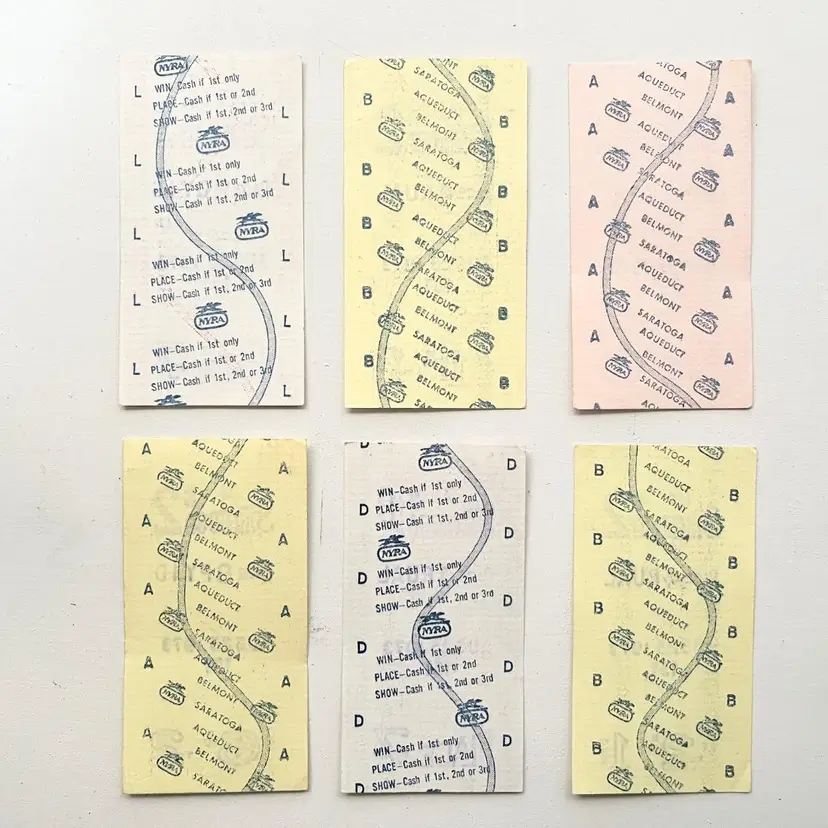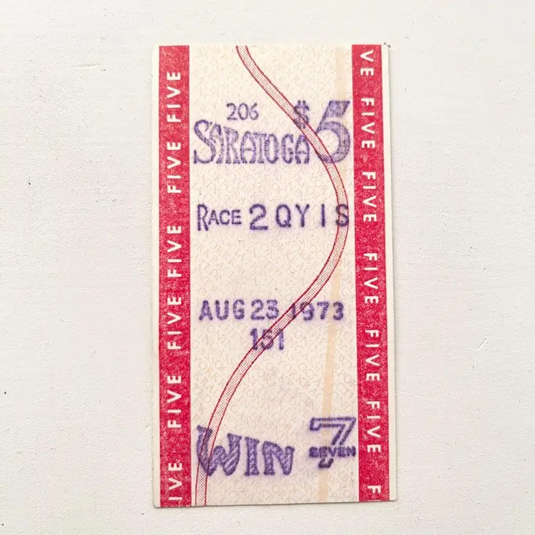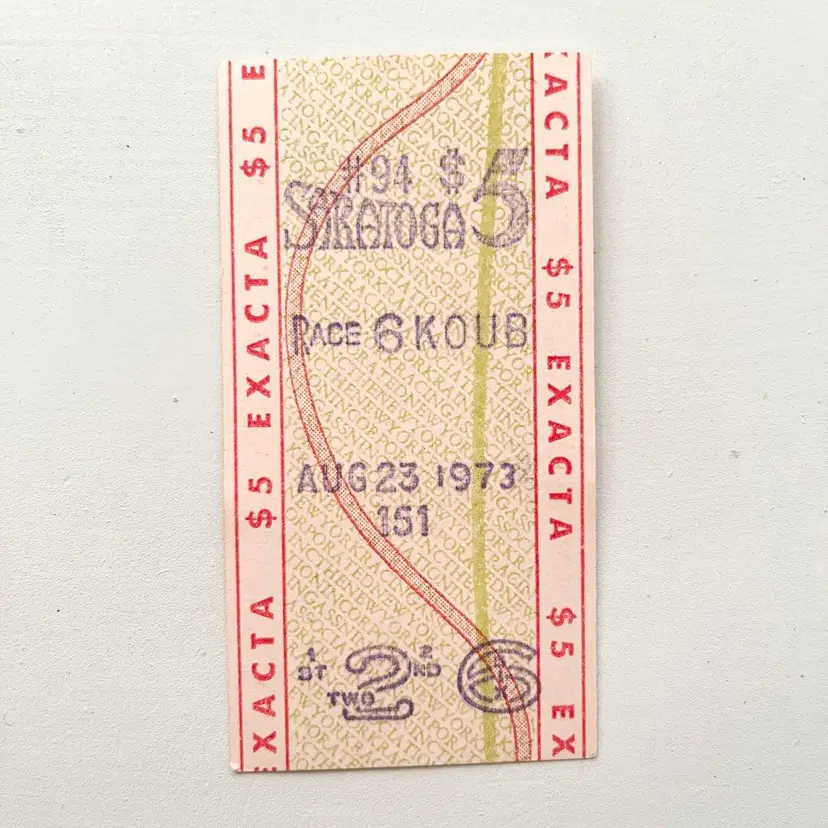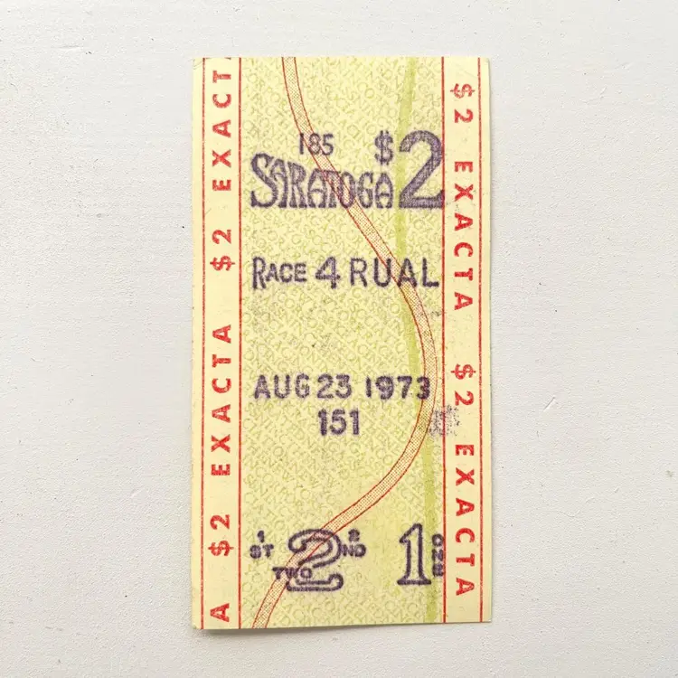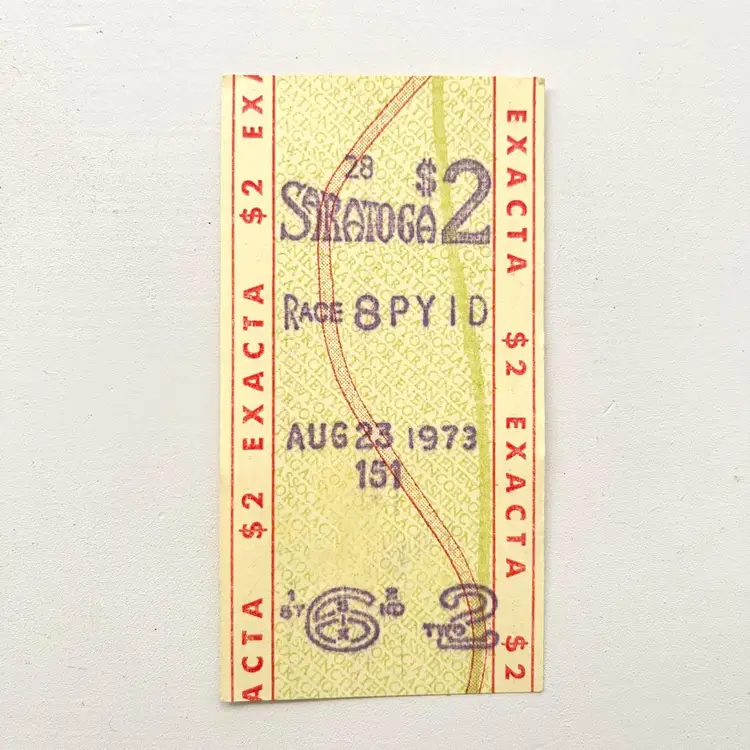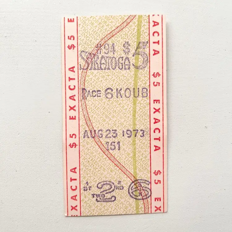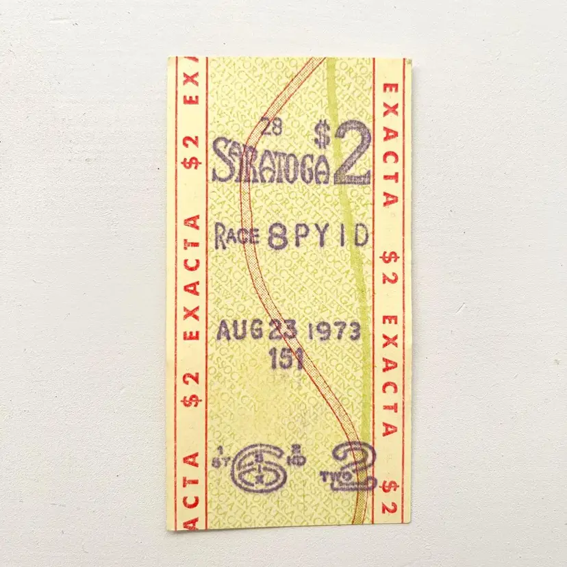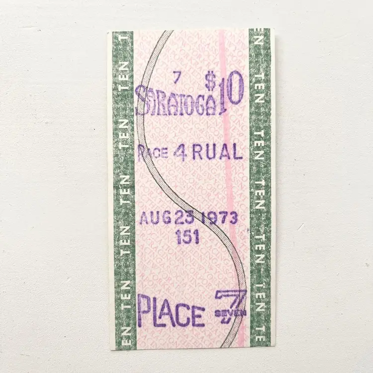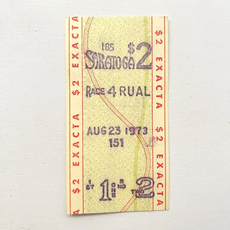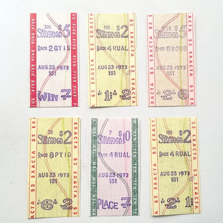 Saratoga Race Course Horse Racing Tickets Vintage 1970s Lot of 6 Race Track Souvenirs Dated August 1973 NYRA New York Racing Association Great for Horse Racing Fans! Junk Journal Media Paper $2, $5, and $10 Dollar Bets $5 Win Number 7 (Red) $2 Exacta Numbers 1 & 2 (Yellow) $5 Exacta Numbers 2 & 6 (Pink) $2 Exacta Numbers 6 & 2 (Yellow) $10 Place Number 7 (Green) $2 Exacta Numbers 2 & 1 (Yellow) Condition: Very Good Measures 3-3/4 inches x 2 inches Packaged in a plastic sleeve inside a rigid envelope Visit my store to see more vintage ephemera, advertising, novelties, gifts, estate sale and yard sale finds https://district.net/u/finderspickerspaper SKU B4 Bin
