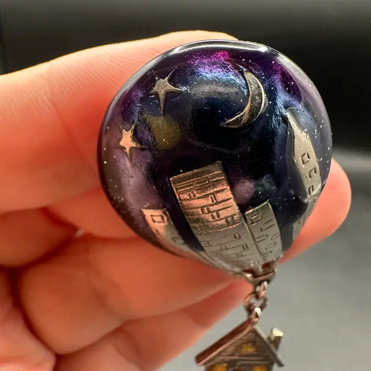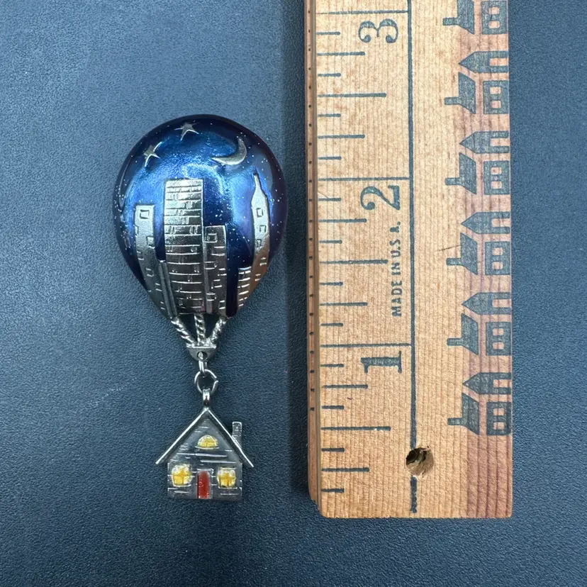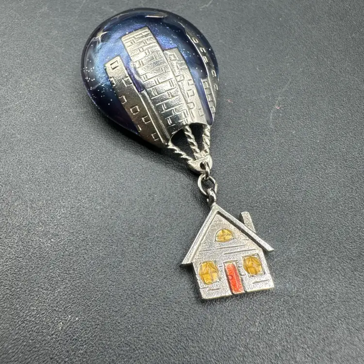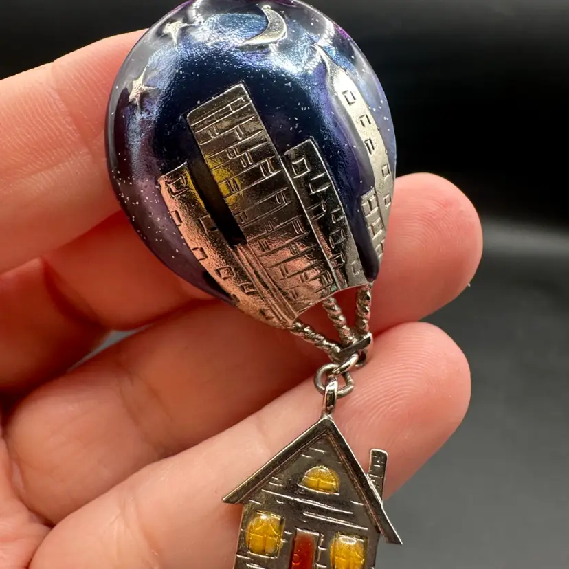 A beautiful midnight blue/purple balloon and a tiny house charm combine to make a fabulous brooch! Stamped on the back with the makers mark. Excellent on condition.