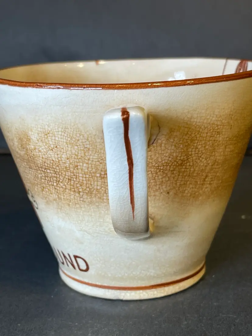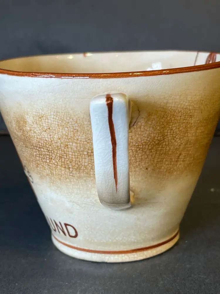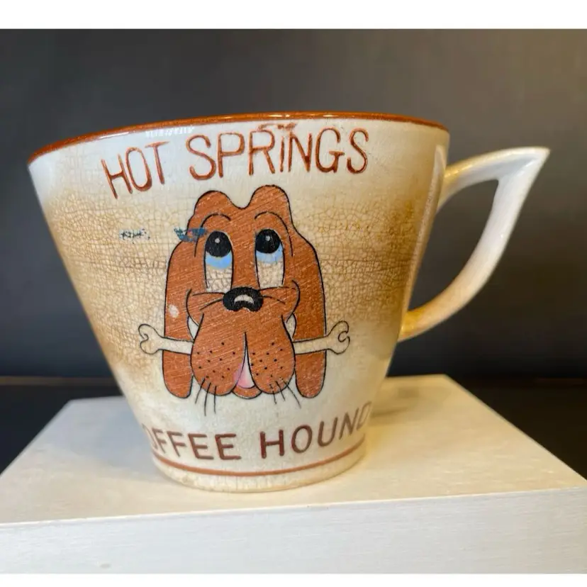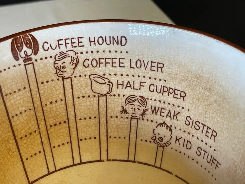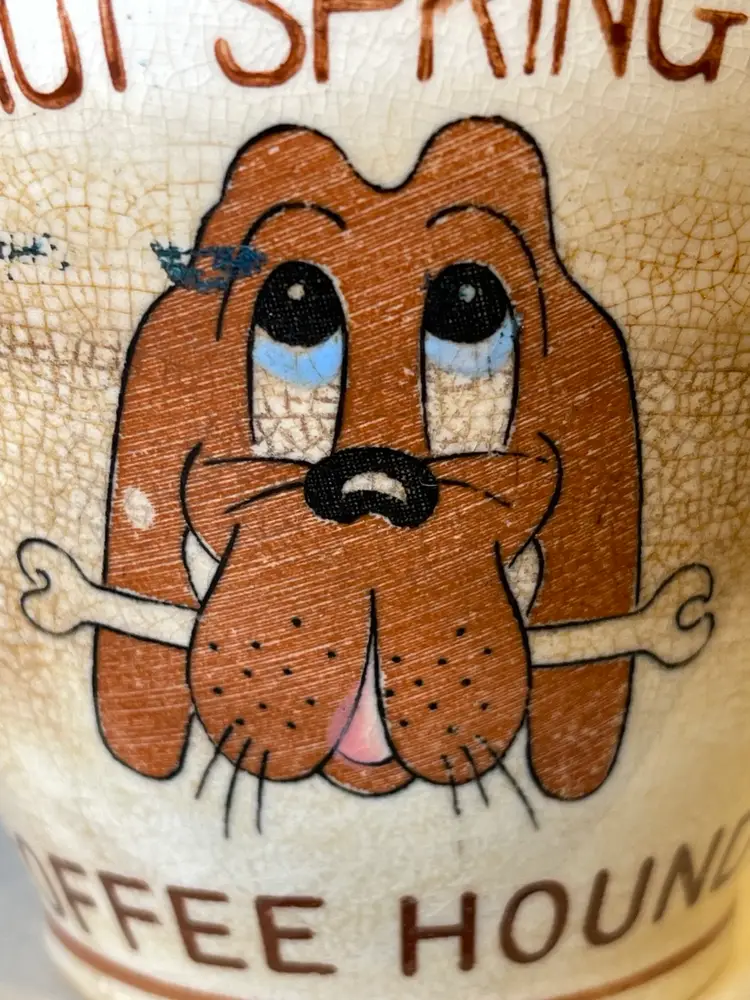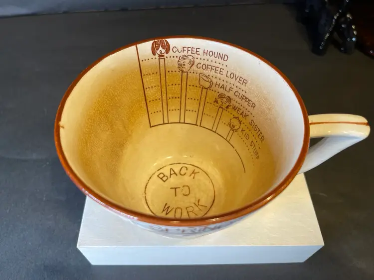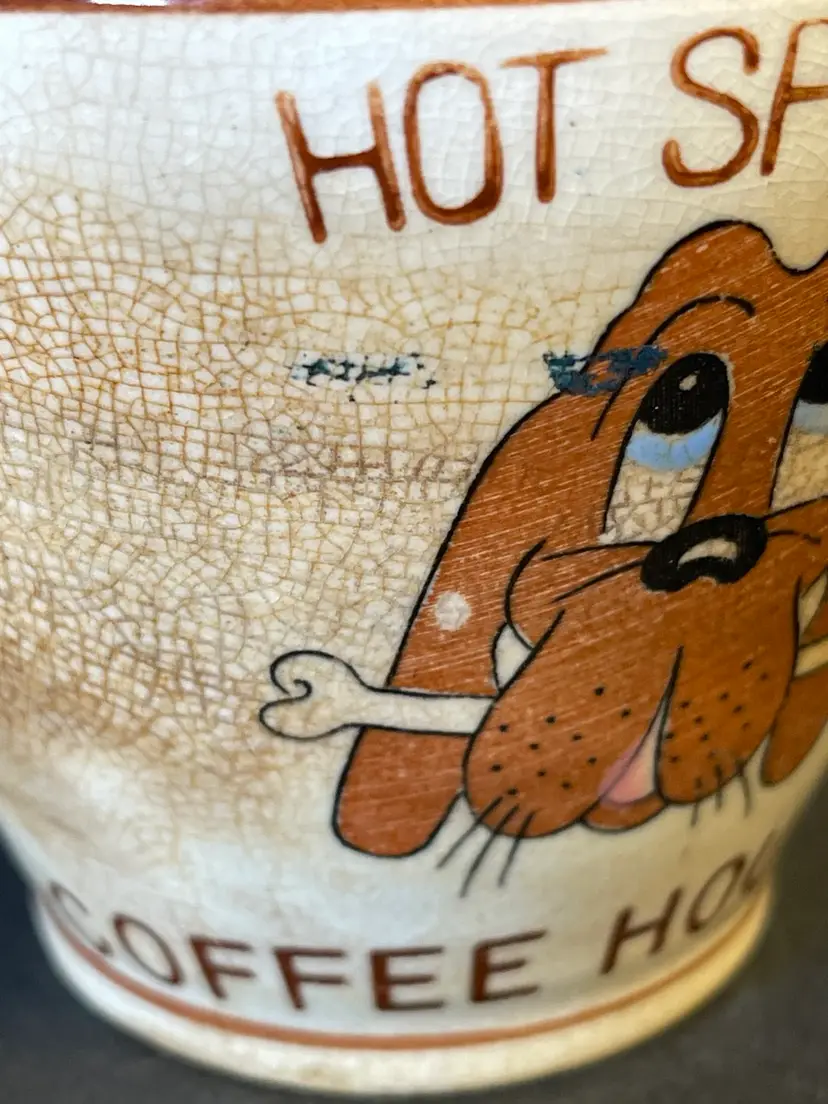 This vintage coffee mug is the perfect gift for the Coffee Hound in your life! It features a humorous design of a coffee hound with a thermometer painted on the inside of the cup. The large 16 oz capacity ensures you can enjoy your favorite hot beverage without constant refills. Made of ceramic and porcelain, this mug is sturdy and stylish with its beige and brown color and 1970s style. The mug also boasts practical features such as a handle for easy grip. It is a must-have collectible item for any coffee lover and will surely bring a smile to your face every time you use it. The origin of this mug is unknown, adding an element of mystery to its already unique qualities. There is a small chip on the mug's base and crazing on the entire piece. The handle is in good shape. I'm not sure if the light brown color is part of the design or staining from coffee. It's a great piece sure to please a serious coffee connoisseur.