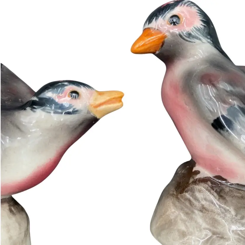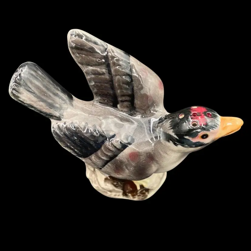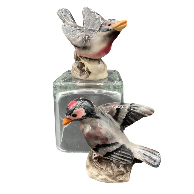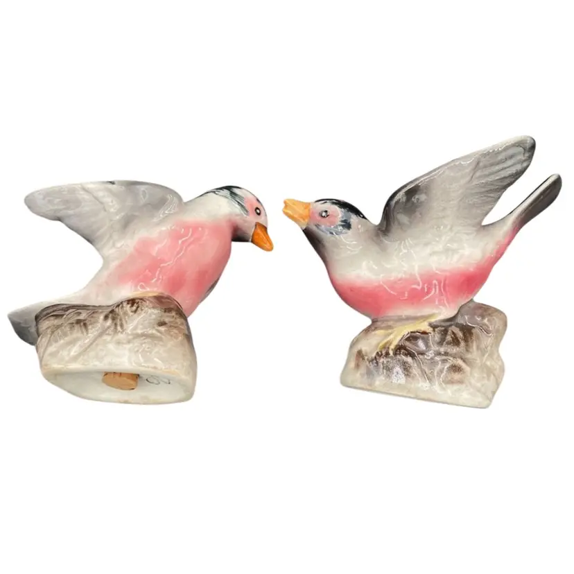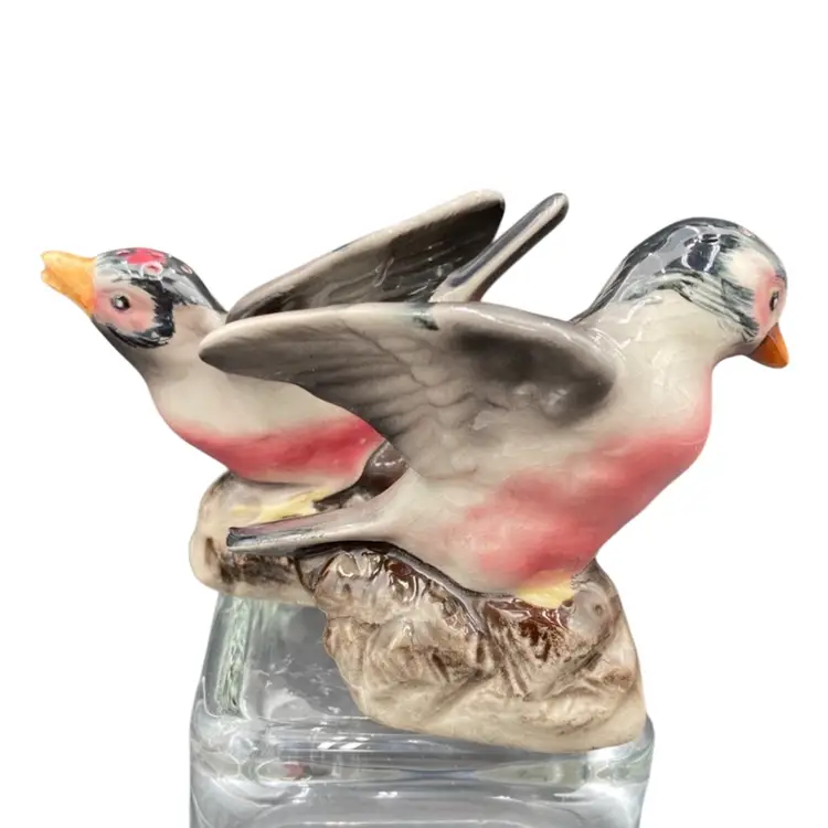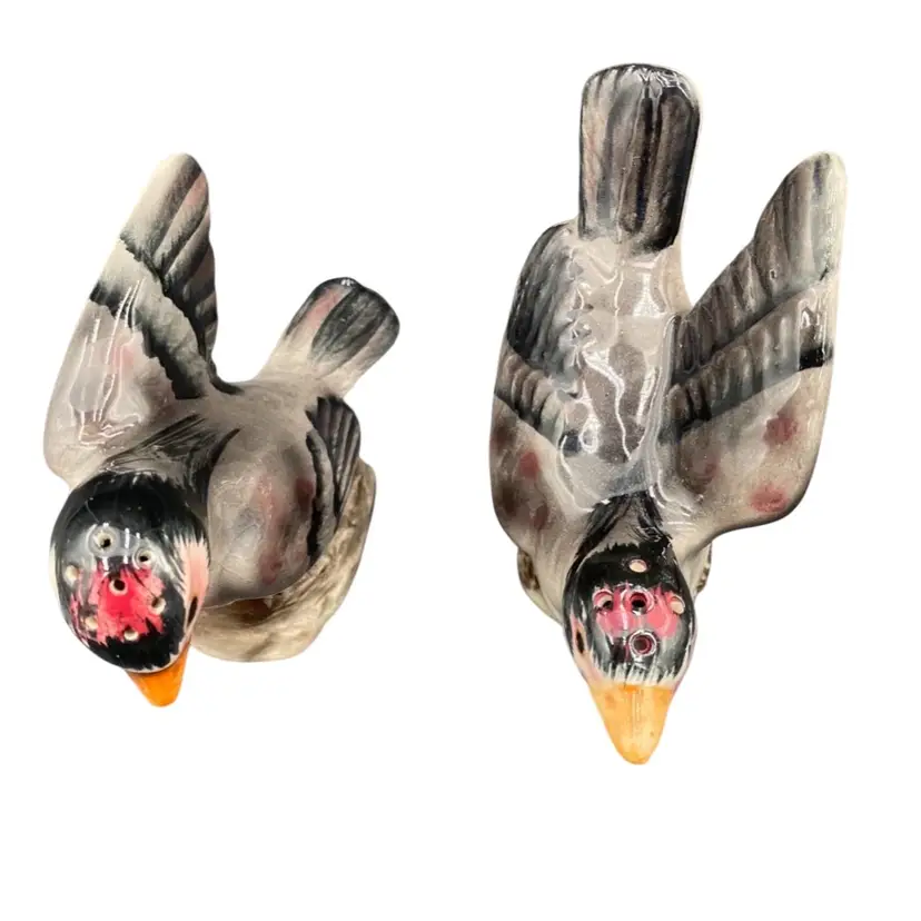 Add charm to your dining table with this vintage set of House Finch ceramic Salt and Pepper Shakers. The shakers capture the soft red/rose of house finches along with their gray and black colors. These shakers are perfect for all occasions and can be used for universal food compatibility. The set comes with cork stoppers, making them easy to use and refill. They are handmade and original, manufactured in Japan during the 1950-1959 period. Don't miss out on the opportunity to add these charming bird-themed shakers to your collection!