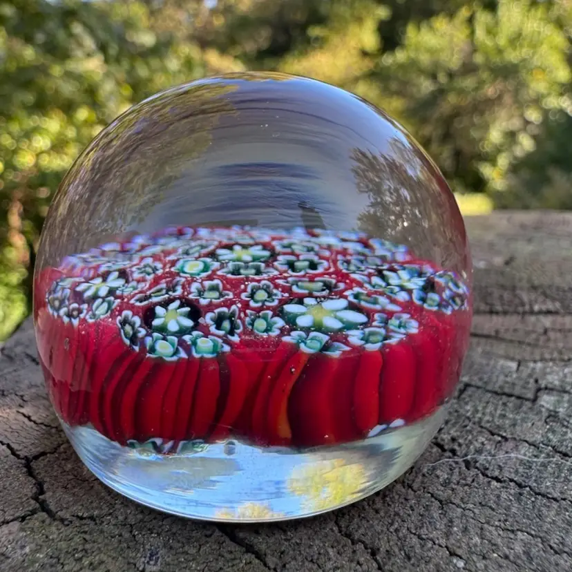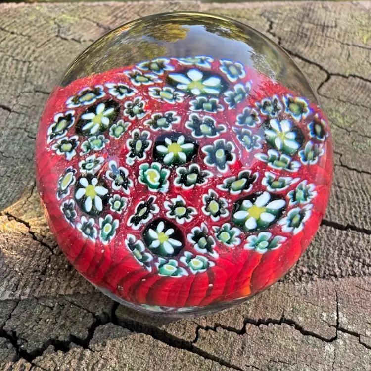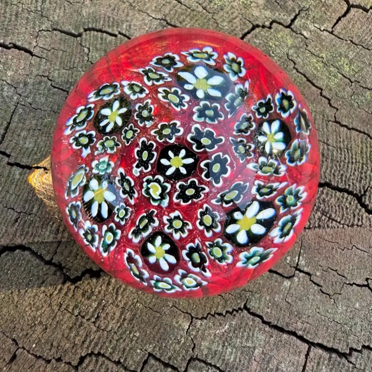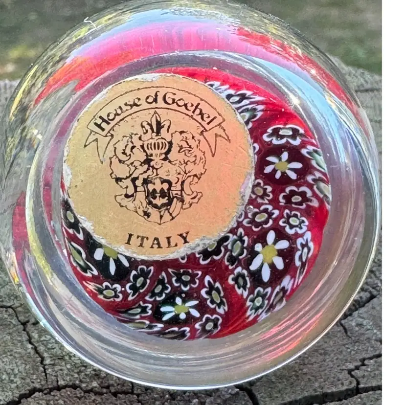 Perfect condition millefiori 1.5” paperweight. House of Goebel (German porcelain manufacturer) would collaborate with Italian glass companies to create different decorative items.