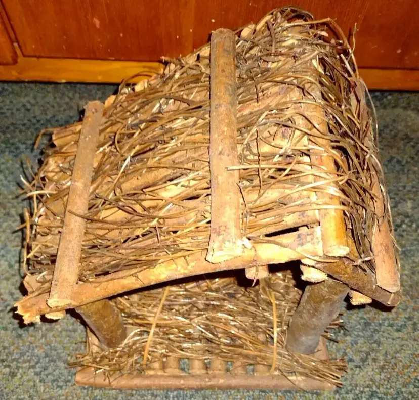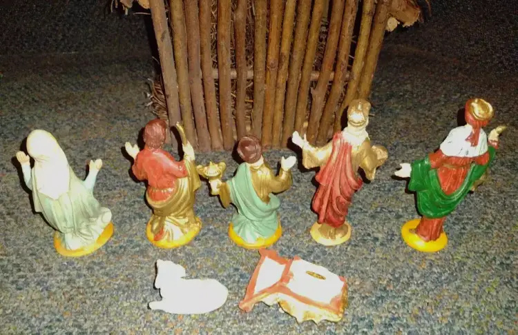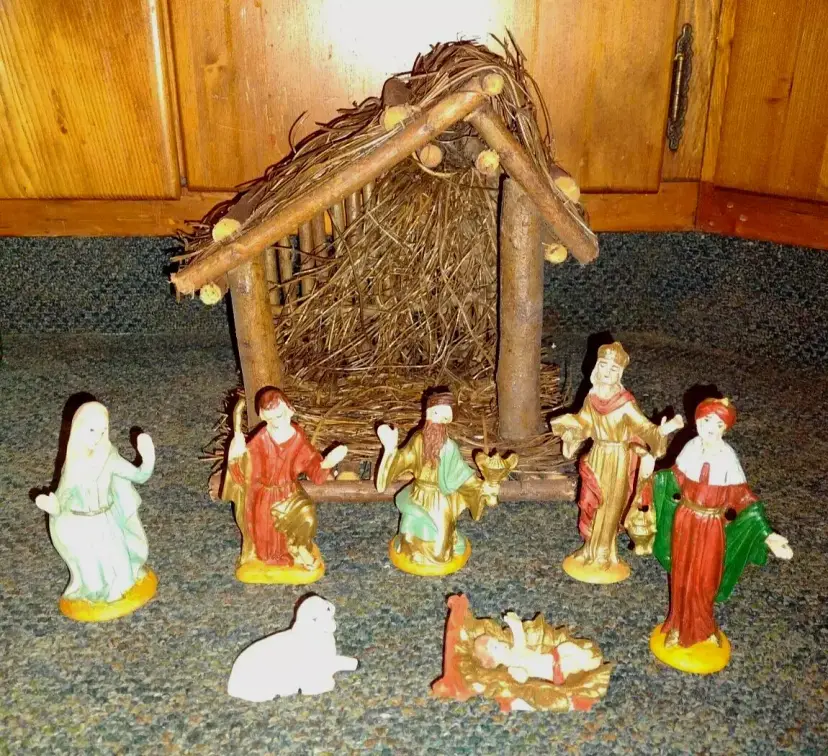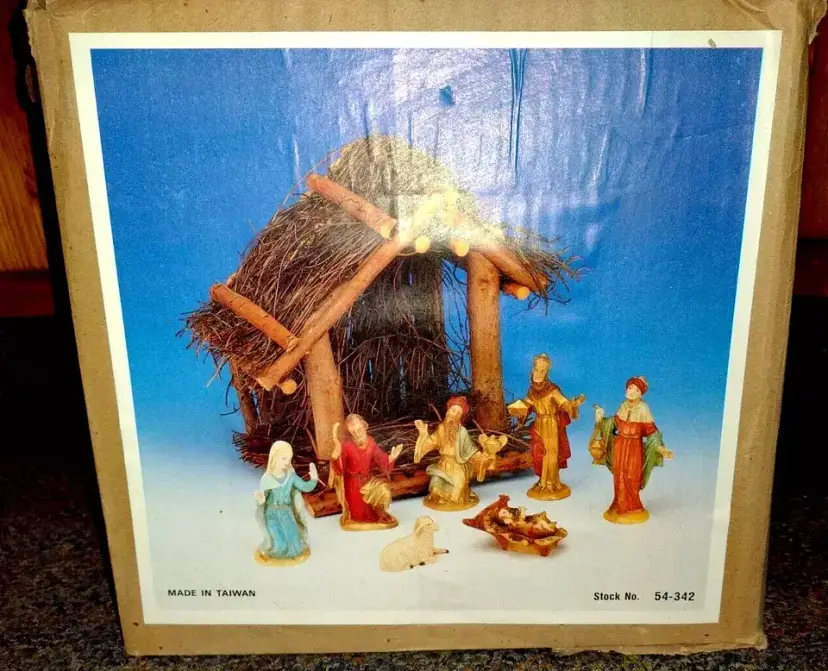 Excellent condition. May be wear to the box. Wood piece measures 9 1/2" tall x 8" x 6 1/2". Tallest figures is 4 1/2" tall.