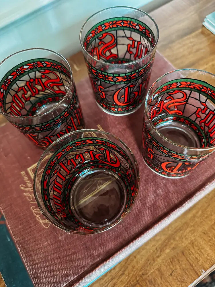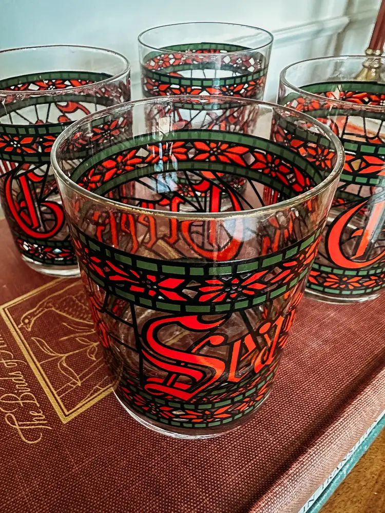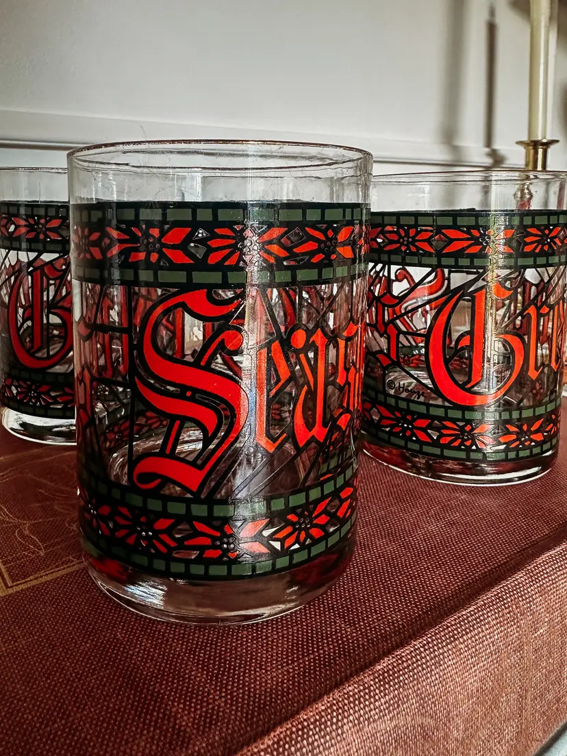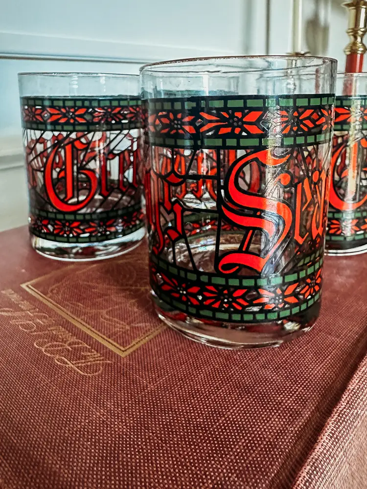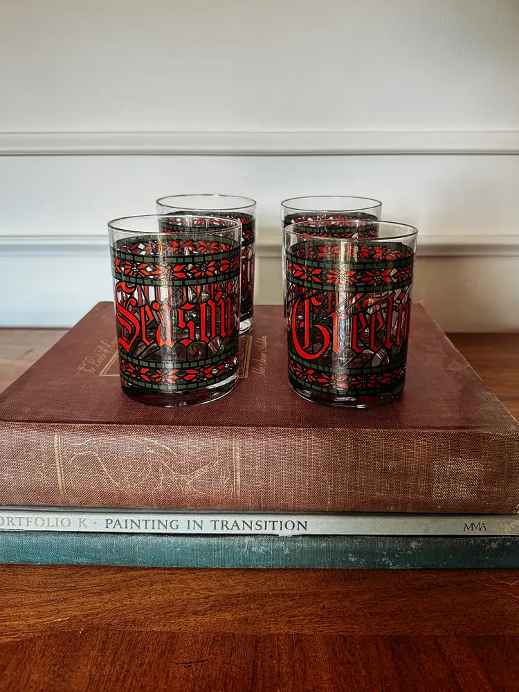 Nice clean set - Vintage Houze Seasons Greetings Glasses Christmas Low Ball Glasses Set of 4 Perfect for a nostalgic Christmas! The show vintage fading but each one still has its gold rim and beautiful bold colors.