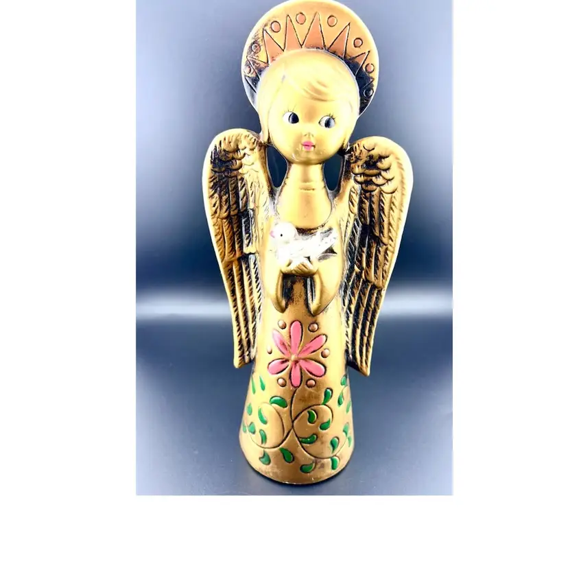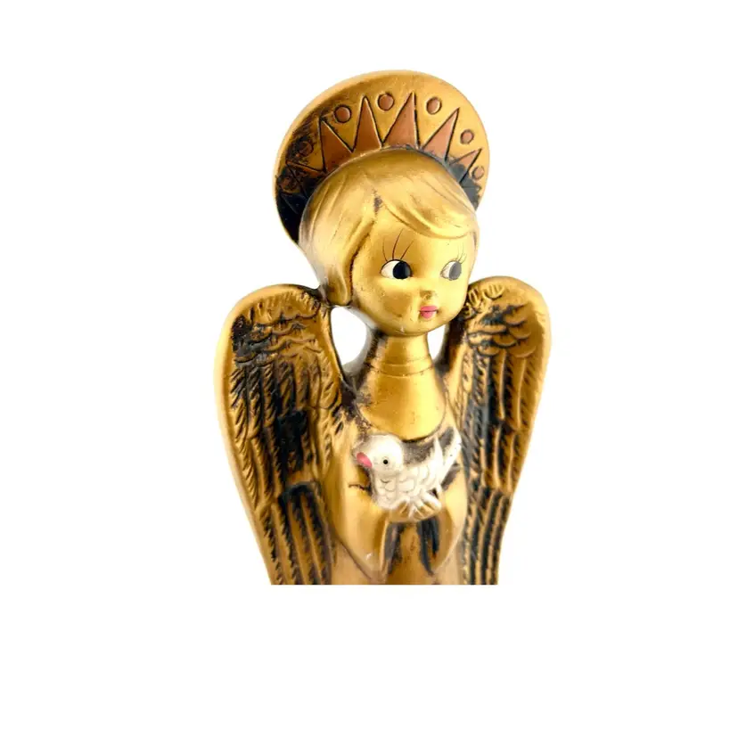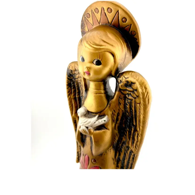 This is a charming angel holding a dove. Look at the details on her dress and halo. She is in good condition with no chips or cracks.