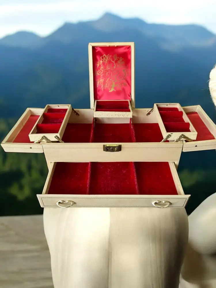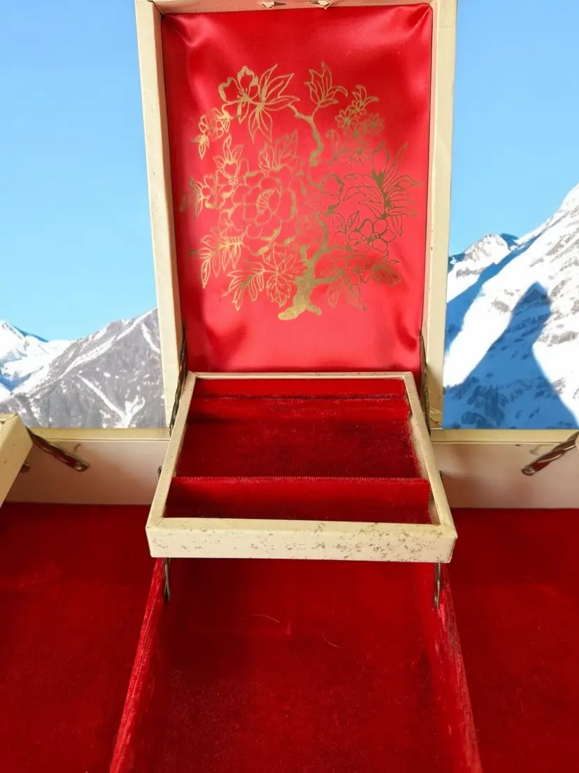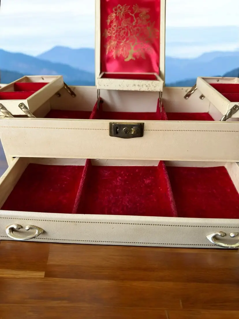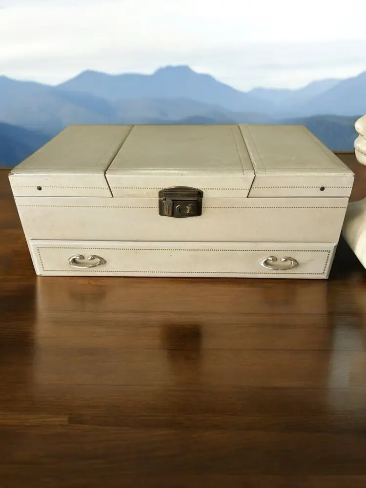Great vintage 50’s cream colored, huge, jewelry box .. the edges are timmed in and front are trimmed in gold .. bottom large pull out draw with gold handles and 3 large divided sections , gold lock hardware , no key , the center piece opens with 2 storage areas and a red background on the back with a gold floral tree design , the other 2 sides open and layout to another divided storage area on each side . Beautiful unmarked Mele piece . Has a little wear on the left front cover as shown in pic. Green felt bottom .. Measures 22.5 in wide when opened , 14 in from side to side and 8 in from front to back stands 5.5 tall closed smoke and pet free